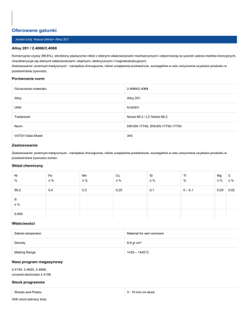 Oferowane gatunki Jesteś tutaj: Nasza oferta> Alloy 201 Alloy 201 / 2.4066/2.4068 Komercyjnie czysty (99,6%), obrobiony plastycznie nikiel z dobrymi właściwościami mechanicznymi i odpornością na szeroki zakres mediów korozyjnych, charakteryzuje się dobrymi właściwościami: cieplnymi, elektrycznymi i magnetostrykcyjnymi. Zastosowanie: przemysł medycznych - narzędzia chirurgiczne, różne urządzenia przetwórcze, szczególnie w celu utrzymania czystości produktu w przetwórstwie żywności. Porównanie norm Oznaczenie materiału 2.4066/2.4068 Alloy Alloy 201 UNS N 02201 Trademark Nickel 99.2 / LC Nickel 99.2 Norm DIN EN 17740, DIN EN 17750-17753 VdTÜV Data Sheet 345 Zastosowanie Zastosowanie: przemysł medycznych - narzędzia chirurgiczne, różne urządzenia przetwórcze, szczególnie w celu utrzymania czystości produktu w przetwórstwie żywności.nomer. Skład chemiczny Ni Fe Mn Cu Si Ti Mg C % ≤% ≤% ≤% ≤% % ≤% ≤% 99,2 0,4 0,3 0,25 0,1 0 – 0,1 0,05 0,02 S ≤% 0,005 Właściwości Zakres temperatur Material for wet corrosion Density 8,9 g/ cm³ Melting Range 1435 – 1445°C Nasz program magazynowy 2.4155, 2.4620, 2.4806, covered electrodes 2.4156 Stock programme Sheets and Plates: 3 - 10 mm on stock With short delivery time: plates or sheets, tubes, flanges, forged or die- cut rings and round blanks, elbows, T- fittings, reductions, screws, nuts or washers according to your With short delivery time: plates or sheets, tubes, flanges, forged or die- cut rings and round blanks, elbows, T- fittings, reductions, screws, nuts or washers according to your request. According to your individual wishes, we are able to cut our material with our plasma- or water jet cutter. Our material is stocked in superformats of 2000x6000mm. Cut to size on request.