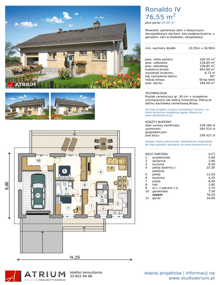Ronaldo IV 76,55 m2 plus garaż 24.00 m2 Niewielki, parterowy dom z klasycznym, dwuspadowym dachem, bez podpiwniczenia, z garażem, tani w budowie i eksploatacji min. wymiary działki pow. netto parteru pow. całkowita pow. zabudowy kubatura brutto wysokość budynku kąt nachylenia dachu rodzaj stropu pow. dachu 22,25m x 16,90m 100.55 m2 126,85 m2 126,85 m2 652,90 m3 6.73 m 30° Strop lekki 185.00 m2 TECHNOLOGIA Pustak ceramiczny gr. 30 cm + ocieplenie (styropianem lub wełną mineralną). Pokrycie dachu dachówką cementową Braas. Do tego projektu możesz wprowadzić zmiany, na które wyrazimy bezpłatną zgodę. Więcej na www.studioatrium.pl KOSZTY BUDOWY stan surowy zamknięty systemem gospodarczym pod klucz 139 184 zł 164 515 zł 238 427 zł Uwaga! Dane szacunkowe. Zestawienie materiałów do tego projektu dostępne na www.studioatrium.pl RZUT PARTERU 1 przedsionek 2 spiżarnia 3 kuchnia 4 pokój dzienny z jadalnią 5 pokój 6 łazienka 7 pokój 8 hall 9 w.c. z piecem c.o. 10 garderoba razem 11 garaż telefon konsultanta 33 822 94 96 Powered by TCPDF (www.tcpdf.org) [m2] 5,90 1,80 8,30 22,30 12,55 4,20 8,40 2,85 2,75 7,50 76,55 24,00 więcej projektów i informacji na www.studioatrium.pl