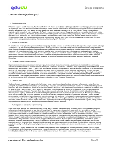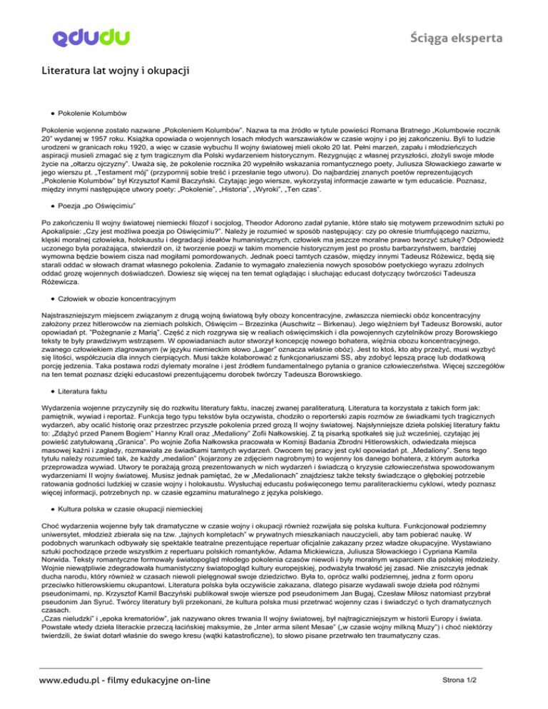 Ściąga eksperta Literatura lat wojny i okupacji Pokolenie Kolumbów Pokolenie wojenne zostało nazwane „Pokoleniem Kolumbów”. Nazwa ta ma źródło w tytule powieści Romana Bratnego „Kolumbowie rocznik 20” wydanej w 1957 roku. Książka opowiada o wojennych losach młodych warszawiaków w czasie wojny i po jej zakończeniu. Byli to ludzie urodzeni w granicach roku 1920, a więc w czasie wybuchu II wojny światowej mieli około 20 lat. Pełni marzeń, zapału i młodzieńczych aspiracji musieli zmagać się z tym tragicznym dla Polski wydarzeniem historycznym. Rezygnując z własnej przyszłości, złożyli swoje młode życie na „ołtarzu ojczyzny”. Uważa się, że pokolenie rocznika 20 wypełniło wskazania romantycznego poety, Juliusza Słowackiego zawarte w jego wierszu pt. „Testament mój” (przypomnij sobie treść i przesłanie tego utworu). Do najbardziej znanych poetów reprezentujących „Pokolenie Kolumbów” był Krzysztof Kamil Baczyński. Czytając jego wiersze, wykorzystaj informacje zawarte w tym educaście. Poznasz, między innymi następujące utwory poety: „Pokolenie”, „Historia”, „Wyroki”, „Ten czas”. Poezja „po Oświęcimiu” Po zakończeniu II wojny światowej niemiecki filozof i socjolog, Theodor Adorono zadał pytanie, które stało się motywem przewodnim sztuki po Apokalipsie: „Czy jest możliwa poezja po Oświęcimiu?”. Należy je rozumieć w sposób następujący: czy po okresie triumfującego nazizmu, klęski moralnej człowieka, holokaustu i degradacji ideałów humanistycznych, człowiek ma jeszcze moralne prawo tworzyć sztukę? Odpowiedź uczonego była porażająca, stwierdził on, iż tworzenie poezji w takim momencie historycznym jest po prostu barbarzyństwem, bardziej wymowna będzie bowiem cisza nad mogiłami pomordowanych. Jednak poeci tamtych czasów, między innymi Tadeusz Różewicz, będą się starali oddać w słowach dramat własnego pokolenia. Zadanie to wymagało znalezienia nowych sposobów poetyckiego wyrazu zdolnych oddać grozę wojennych doświadczeń. Dowiesz się więcej na ten temat oglądając i słuchając educast dotyczący twórczości Tadeusza Różewicza. Człowiek w obozie koncentracyjnym Najstraszniejszym miejscem związanym z drugą wojną światową były obozy koncentracyjne, zwłaszcza niemiecki obóz koncentracyjny założony przez hitlerowców na ziemiach polskich, Oświęcim – Brzezinka (Auschwitz – Birkenau). Jego więźniem był Tadeusz Borowski, autor opowiadań pt. ”Pożegnanie z Marią”. Część z nich rozgrywa się w realiach oświęcimskich i dla powojennych czytelników prozy Borowskiego teksty te były prawdziwym wstrząsem. W opowiadaniach autor stworzył koncepcję nowego bohatera, więźnia obozu koncentracyjnego, zwanego człowiekiem zlagrowanym (w języku niemieckim słowo „Lager” oznacza właśnie obóz). Jest to ktoś, kto aby przeżyć, musi wyzbyć się litości, współczucia dla innych cierpiących. Musi także kolaborować z funkcjonariuszami SS, aby zdobyć lepszą pracę lub dodatkową porcję jedzenia. Taka postawa rodzi dylematy moralne i jest źródłem fundamentalnego pytania o granice człowieczeństwa. Więcej szczegółów na ten temat poznasz dzięki educastowi prezentującemu dorobek twórczy Tadeusza Borowskiego. Literatura faktu Wydarzenia wojenne przyczyniły się do rozkwitu literatury faktu, inaczej zwanej paraliteraturą. Literatura ta korzystała z takich form jak: pamiętnik, wywiad i reportaż. Funkcja tego typu tekstów była oczywista, chodziło o reporterski zapis rozmów ze świadkami tych tragicznych wydarzeń, aby ocalić historię oraz przestrzec przyszłe pokolenia przed grozą II wojny światowej. Najsłynniejsze dzieła polskiej literatury faktu to: „Zdążyć przed Panem Bogiem” Hanny Krall oraz „Medaliony” Zofii Nałkowskiej. Z tą pisarką spotkałeś się już wcześniej, czytając jej powieść zatytułowaną „Granica”. Po wojnie Zofia Nałkowska pracowała w Komisji Badania Zbrodni Hitlerowskich, odwiedzała miejsca masowej kaźni i zagłady, rozmawiała ze świadkami tamtych wydarzeń. Owocem tej pracy jest cykl opowiadań pt. „Medaliony”. Sens tego tytułu należy rozumieć tak, że każdy „medalion” (kojarzony ze zdjęciem nagrobnym) to wojenny los danego bohatera, z którym autorka przeprowadza wywiad. Utwory te porażają grozą prezentowanych w nich wydarzeń i świadczą o kryzysie człowieczeństwa spowodowanym wydarzeniami II wojny światowej. Musisz jednak pamiętać, że w „Medalionach” znajdziesz także teksty świadczące o głębokiej potrzebie ratowania godności ludzkiej w czasie wojny i holokaustu. Wysłuchaj educastu poświęconego temu paraliterackiemu cyklowi, wtedy poznasz więcej informacji, potrzebnych np. w czasie egzaminu maturalnego z języka polskiego. Kultura polska w czasie okupacji niemieckiej Choć wydarzenia wojenne były tak dramatyczne w czasie wojny i okupacji również rozwijała się polska kultura. Funkcjonował podziemny uniwersytet, młodzież zbierała się na tzw. „tajnych kompletach” w prywatnych mieszkaniach nauczycieli, aby tam pobierać naukę. W podobnych warunkach odbywały się spektakle teatralne prezentujące repertuar oficjalnie zakazany przez władze okupacyjne. Wystawiano sztuki pochodzące przede wszystkim z repertuaru polskich romantyków, Adama Mickiewicza, Juliusza Słowackiego i Cypriana Kamila Norwida. Teksty romantyczne formowały światopogląd młodego pokolenia czasów niewoli i były moralnym wsparciem dla polskiej młodzieży. Wojnie niewątpliwie zdegradowała humanistyczny światopogląd kultury europejskiej, podważyła trwałość jej zasad. Nie zniszczyła jednak ducha narodu, który również w czasach niewoli pielęgnował swoje dziedzictwo. Była to, oprócz walki podziemnej, jedna z form oporu przeciwko hitlerowskiemu okupantowi. Literatura polska była oczywiście zakazana, dlatego pisarze wydawali swoj