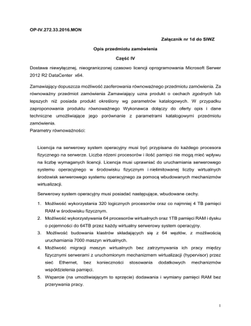 OP-IV.272.33.2016.MON Załącznik nr 1d do SIWZ Opis przedmiotu zamówienia Część IV Dostawa niewyłącznej, nieograniczonej czasowo licencji oprogramowania Microsoft Serwer 2012 R2 DataCenter x64. Zamawiający dopuszcza możliwość zaoferowania równoważnego przedmiotu zamówienia. Za równoważny przedmiot zamówienia Zamawiający uzna produkt o cechach zgodnych lub lepszych niż posiada produkt określony wg parametrów katalogowych. W przypadku zaproponowania produktu równoważnego Wykonawca dołączy do oferty opis i dane techniczne umożliwiające jego porównanie z parametrami katalogowymi przedmiotu zamówienia. Parametry równoważności: Licencja na serwerowy system operacyjny musi być przypisana do każdego procesora fizycznego na serwerze. Liczba rdzeni procesorów i ilość pamięci nie mogą mieć wpływu na liczbę wymaganych licencji. Licencja musi uprawniać do uruchamiania serwerowego systemu operacyjnego w środowisku fizycznym i nielimitowanej liczby wirtualnych środowisk serwerowego systemu operacyjnego za pomocą wbudowanych mechanizmów wirtualizacji. Serwerowy system operacyjny musi posiadać następujące, wbudowane cechy. 1. Możliwość wykorzystania 320 logicznych procesorów oraz co najmniej 4 TB pamięci RAM w środowisku fizycznym. 2. Możliwość wykorzystywania 64 procesorów wirtualnych oraz 1TB pamięci RAM i dysku o pojemności do 64TB przez każdy wirtualny serwerowy system operacyjny. 3. Możliwość budowania klastrów składających się z 64 węzłów, z możliwością uruchamiania 7000 maszyn wirtualnych. 4. Możliwość migracji maszyn wirtualnych bez zatrzymywania ich pracy między fizycznymi serwerami z uruchomionym mechanizmem wirtualizacji (hypervisor) przez sieć Ethernet, bez konieczności stosowania dodatkowych mechanizmów współdzielenia pamięci. 5. Wsparcie (na umożliwiającym to sprzęcie) dodawania i wymiany pamięci RAM bez przerywania pracy. 1 6. Wsparcie (na umożliwiającym to sprzęcie) dodawania i wymiany procesorów bez przerywania pracy. 7. Automatyczna weryfikacja cyfrowych sygnatur sterowników w celu sprawdzenia, czy sterownik przeszedł testy jakości przeprowadzone przez producenta systemu operacyjnego. 8. Możliwość dynamicznego obniżania poboru energii przez rdzenie procesorów niewykorzystywane w bieżącej pracy. Mechanizm ten musi uwzględniać specyfikę procesorów wyposażonych w mechanizmy Hyper-Threading. 9. Wbudowane wsparcie instalacji i pracy na wolumenach, które: a. pozwalają na zmianę rozmiaru w czasie pracy systemu, b. umożliwiają tworzenie w czasie pracy systemu migawek, dających użytkownikom końcowym (lokalnym i sieciowym) prosty wgląd w poprzednie wersje plików i folderów, c. umożliwiają kompresję "w locie" dla wybranych plików i/lub folderów, d. umożliwiają zdefiniowanie list kontroli dostępu (ACL). 10. Wbudowany mechanizm klasyfikowania i indeksowania plików (dokumentów) w oparciu o ich zawartość. 11. Wbudowane szyfrowanie dysków przy pomocy mechanizmów posiadających certyfikat FIPS 140-2 lub równoważny wydany przez NIST lub inną agendę rządową zajmującą się bezpieczeństwem informacji. 12. Możliwość uruchamianie aplikacji internetowych wykorzystujących technologię ASP.NET 13. Możliwość dystrybucji ruchu sieciowego HTTP pomiędzy kilka serwerów. 14. Wbudowana zapora internetowa (firewall) z obsługą definiowanych reguł dla ochrony połączeń internetowych i intranetowych. 15. Dostępne dwa rodzaje graficznego interfejsu użytkownika: a. Klasyczny, umożliwiający obsługę przy pomocy klawiatury i myszy, b. Dotykowy umożliwiający sterowanie dotykiem na monitorach dotykowych. 16. Zlokalizowane w języku polskim, co najmniej następujące elementy: menu, przeglądarka internetowa, pomoc, komunikaty systemowe, 17. Możliwość zmiany języka interfejsu po zainstalowaniu systemu, dla co najmniej 10 języków poprzez wybór z listy dostępnych lokalizacji. 18. Mechanizmy logowania w oparciu o: a. Login i hasło, b. Karty z certyfikatami (smartcard), c. Wirtualne karty (logowanie w oparciu o certyfikat chroniony poprzez moduł TPM), 2 19. Możliwość wymuszania wieloelementowej kontroli dostępu dla określonych grup użytkowników. 20. Wsparcie dla większości powszechnie używanych urządzeń peryferyjnych (drukarek, urządzeń sieciowych, standardów USB, Plug&Play). 21. Możliwość zdalnej konfiguracji, administrowania oraz aktualizowania systemu. 22. Dostępność bezpłatnych narzędzi producenta systemu umożliwiających badanie i wdrażanie zdefiniowanego zestawu polityk bezpieczeństwa. 23. Pochodzący od producenta systemu serwis zarządzania polityką dostępu do informacji w dokumentach (Digital Rights Management). 24. Wsparcie dla środowisk Java i .NET Framework 4.x – możliwość uruchomienia aplikacji działających we wskazanych środowiskach. 25. Możliwość implementacji następujących funkcjonalności bez potrzeby instalowania dodatkowych produktów (oprogramowania) innych producentów wymagających dodatkowych licencji: a. Podstawowe usługi sieciowe: DHCP oraz DNS wspierający DNSSEC, b. Usługi katalogowe oparte o LDAP i pozwalające na uwierzytelnianie użytkowników stacji roboczych, bez konieczności instalowania dodatkowego oprogramowania na tych stacjach, pozwalające na zarządzanie zasobami w sieci (użytkownicy, komputery, drukarki, udziały sieciowe), z możliwością wykorzystania następujących funkcji: i. Podłączenie do domeny w trybie offline – bez dostępnego połączenia sieciowego z domeną, ii. Ustanawianie praw dostępu do zasobów domeny na bazie sposobu logowania użytkownika – na przykład typu certyfikatu użytego do logowania, iii. Odzyskiwanie przypadkowo skasowanych obiektów usługi katalogowej z mechanizmu kosza. iv. Bezpieczny mechanizm dołączania do domeny uprawnionych użytkowników prywatnych urządzeń mobilnych opartych o iOS i Windows 8.1. c. Zdalna dystrybucja oprogramowa