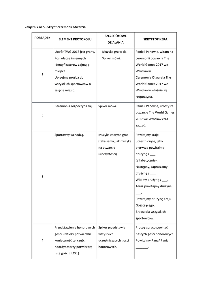 Załącznik nr 5 - Skrypt ceremonii otwarcia PORZĄDEK 1 ELEMENT PROTOKOŁU SZCZEGÓŁOWE SKRYPT SPIKERA DZIAŁANIA Utwór TWG 2017 jest grany. Muzyka gra w tle. Panie i Panowie, witam na Posiadacze imiennych Spiker mówi. ceremonii otwarcia The identyfikatorów zajmują World Games 2017 we miejsca. Wrocławiu. Uprzejma prośba do Ceremonia Otwarcia The wszystkich sportowców o World Games 2017 we zajęcie miejsc. Wrocławiu właśnie się rozpoczyna. Ceremonia rozpoczyna się. Spiker mówi. Panie i Panowie, uroczyste otwarcie The World Games 2 2017 we Wrocław czas zacząć. Sportowcy wchodzą. Muzyka zaczyna grać Powitajmy kraje (taka sama, jak muzyka uczestniczące, jako na otwarcie pierwszą powitajmy uroczystości) drużynę z ___ (alfabetycznie). Następny, zapraszamy drużynę z ___. 3 Witamy drużynę z ___. Teraz powitajmy drużynę ___. Powitajmy drużynę Kraju Goszczącego. Brawa dla wszystkich sportowców. 4 Przedstawienie honorowych Spiker przedstawia Proszę gorąco powitać gości. (Należy potwierdzić wszystkich naszych gości honorowych. konieczność tej części. uczestniczących gości Powitajmy Pana/ Panią Koordynatorzy potwierdzą honorowych. _______. listę gości z LOC.) Gość wygłasza (Niniejsza część Teraz, zapraszamy _______ przemówienie. obejmuje wygłaszanie z _______ do wygłoszenia przemówień gości) kilku słów. (Po przemówieniu) Dziękuję, ___. 5 Teraz, zapraszamy _______ z _______ do wygłoszenia kilku słów. (Po przemówieniu) Dziękuję, ___. Przysięga sportowców i Spiker wprowadza Teraz zawodnicy i przysięga sędziów. odpowiednich sędziowie złożą przysięgę. przedstawicieli do Przedstawicielem przysięgi. sportowców jest ___ (imię i 6 nazwisko) z ___ (kraj), przedstawicielem sędziów jest Pan/Pani __________ (imię i nazwisko) z _________ (kraj). Gość honorowy IF 7 (IF) Niniejszym ogłaszam The World Games 2017 we Wrocławiu za rozpoczęte. Sportowcy wychodzą. 8 W tle gra muzyka na Sportowców proszę o wyjście. opuszczenie areny. Panie i Panowie, proszę jeszcze raz o brawa dla wszystkich sportowców. Całkowity czas ceremonii otwarcia nie powinien przekroczyć 10 minut.