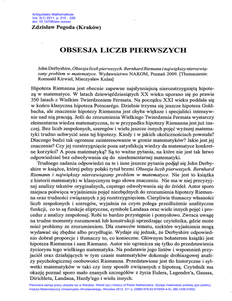 Antiquitates Mathematicae Vol. 5(1) 2011, p. 215–226 doi: 10.14708/am.vxxxxx Zdzisław Pogoda (Kraków) OBSESJA LICZB PIERWSZYCH John Derbyshire, Obsesja liczb pierwszych. Bernhard Riemann i największy nierozwią zany problem w matematyce. Wydawnictwo NAKOM, Poznań 2009. [Tłumaczenie: Romuald Kirwiel, Mieczysław Kulas] Hipoteza Riemanna jest obecnie zapewne najsłynniejszą nierozstrzygniętą hipote zą w matematyce. W latach dziewięćdziesiątych XX wieku uporano się po prawie 350 latach z Wielkim Twierdzeniem Fermata. Na początku XXI wieku poddała się w końcu klasyczna hipoteza Poincarego. Dzielnie trzyma się jeszcze hipoteza Goldbacha, ale znaczenie hipotezy Riemanna jest chyba większe i specjaliści intensyw nie nad nią pracują. Jeśli do zrozumienia Wielkiego Twierdzenia Fermata wystarczy elementarna wiedza matematyczna, to w przypadku hipotezy Riemanna jest już ina czej. Bez liczb zespolonych, szeregów i wielu jeszcze innych pojęć wyższej matema tyki trudno uchwycić sens tej hipotezy. Kiedy i w jakich okolicznościach powstała? Dlaczego budzi tak ogromne zainteresowanie w gronie matematyków? Jakie jest jej znaczenie? Czyjej rozstrzygnięcie poza satysfakcją wiedzy da matematyce konkret ne korzyści? A poza matematyką? Są to ważne pytania, na które nie jest tak łatwo odpowiedzieć bez odwoływania się do nieelementarnej matematyki. Trudnego zadania odpowiedzi na te i inne jeszcze pytania podjął się John Derby shire w książce, której pełny polski tytuł brzmi Obsesja liczb pierwszych. Bernhard Riemann i największy nierozwiązany problem w matematyce. Nie jest to książka z historii matematyki w klasycznym tego słowa znaczeniu. Nie ma w niej precyzyj nej analizy tekstów oryginalnych, częstego odwoływania się do źródeł. Autor sporo miejsca poświęca wyjaśnieniu pojęć niezbędnych do zrozumienia hipotezy Rieman na oraz trudności związanych z jej rozstrzygnięciem. Cierpliwie tłumaczy własności liczb zespolonych i szeregów, wyjaśnia na czym polega przedłużenie analityczne funkcji, co to są funkcje eliptyczne, symbole Landaua oraz wiele innych pojęć i pro cedur z analizy zespolonej. Robi to bardzo przystępnie i pomysłowo. Zwraca uwagę na trudne momenty rozumowań lub konstrukcji uprzedzając czytelnika, gdzie może mieć problemy ze zrozumieniem. Dla znawców tematu, niektóre wyjaśnienia mogą wydawać się zbędne albo przydługie. Wydaje się jednak, że Derbyshire odpowied nio dobrał proporcje i tłumaczy to, co konieczne. Głównym bohaterem książki jest hipoteza Riemanna i sam Riemann. Autor nie ogranicza się tylko do przedstawienia życiorysu tego wielkiego matematyka. Na podstawie jego listów i wspomnień przy jaciół oraz działających w tym czasie matematyków dokonuje drobiazgowej anali zy psychologicznej osobowości Riemanna. Przedstawione jest tło historyczne i syl wetki matematyków w taki czy inny sposób związanych z hipotezą. Czytelnik ma okazję poznać sporo mało znanych szczegółów z życia Eulera, Legendre’a, Gaussa, Dirichleta, Landaua, Hardy’ego i wielu innych. Pierwotna wersja pracy ukazała sie w Wiesław, Witold (ed.) History of Polish Mathematics. (Dzieje matematyki polskiej.)(po polsku), Instytut Matematyczny Uniwersytetu Wrocławskiego, Wrocław 2012, 311 p. (ISBN 978-83-910055-4-5). ZBL1258.01002. 308 Zdzisław Pogoda Bardzo dokładnie opisane są dzieje samej hipotezy oraz jej powiązania z innymi problemami matematyki, przede wszystkim z twierdzeniem o liczbach pierwszych, którego historia jest także przedstawiona ze szczegółami. Nie brakuje informacji 0 zaskakujących powiązaniach hipotezy Riemanna z mechaniką kwantową. Derbyshire omawia rozmaite uogólnienia problemu i przypuszczenia, z których hipoteza mogłaby być wnioskiem. Nie zapomina wspomnieć również o nieudanych próbach rozstrzygnięcia hipotezy. Swoją opowieść doprowadza do czasów najnowszych, kie dy książka powstała. Konstrukcja książki jest oryginalna i zaskakująca. W rozdziałach o numerach nieparzystych Derbyshire opisuje różne zagadnienia matematyczne dotyczące hipo tezy Riemanna, natomiast rozdziały o numerach parzystych poświęcone są ludziom 1wydarzeniom historycznym towarzyszącym opisywanym faktom matematycznym. Czytelnik zainteresowany głównie stroną historyczną problemu może w zasadzie czytać tylko rozdziały parzyste. Szybko jednak zechce zajrzeć do „rozdziałów mate matycznych”, aby bliżej zapoznać się z samą hipotezą. Autor, z wykształcenia matematyk (choć nie specjalista w dziedzinie teorii liczb) i lingwista, z dużą swobodą prowadzi narrację gładko przechodząc od informacji o charakterze historycznym do konkretnych, a czasem nawet drobiazgowych, rozwa żań matematycznych. Jednak i te bardziej techniczne fragmenty napisane są z pasją dobrego popularyzatora. Czytelnik nie będzie się nudził próbując zrozumieć własno ści szeregu harmonicznego, logarytmu całkowego, problemów związanych z prze dłużaniem funkcji, czy też konstrukcji ciała liczb /?-adycznych. Nawet zawodowy matematyk z przyjemnością przeczyta na przykład sugestywne i poglądowe wytłu maczenie, dlaczego iloczyn liczb ujemnych jest dodatni. Książkę Derbyshire’a czyta się niemal jak powieść sensacyjną z zaskakującymi zwrotami akcji i pojawiającymi się nagle nowymi wątkami. Mimo iż jest to pozycja popularnonaukowa, to zawiera dużą ilość konkretnych informacji. Dlatego może być ciekawą lekturą dla wszystkich, którzy chcą się dowiedzieć czegoś o problemach teorii liczb i historii matematyki. Studiując monografie i prace specjalne poznajemy same problem^, których głębo ki sens dostępny jest tylko dla specjalistów. Książka Derbyshire’a może być przystęp nym przygotowaniem (i zachętą) do sięgnięcia po pozycje bardziej zaawansowane. Zdzisław Pogoda Instytut Matematyki UJ ul. Profesora Stanisława Łojasiewicza 6 30-348 Kraków 