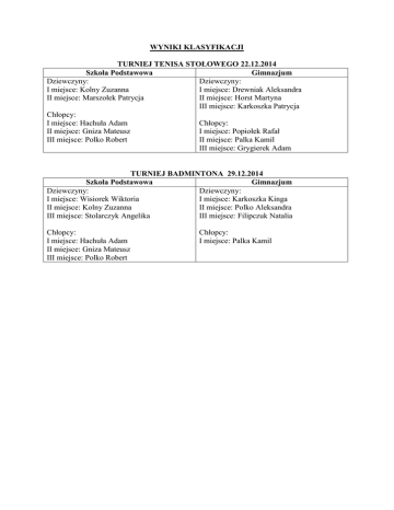 WYNIKI KLASYFIKACJI TURNIEJ TENISA STOŁOWEGO 22.12.2014 Szkoła Podstawowa Gimnazjum Dziewczyny: Dziewczyny: I miejsce: Kolny Zuzanna I miejsce: Drewniak Aleksandra II miejsce: Marszołek Patrycja II miejsce: Horst Martyna III miejsce: Karkoszka Patrycja Chłopcy: I miejsce: Hachuła Adam Chłopcy: II miejsce: Gniza Mateusz I miejsce: Popiołek Rafał III miejsce: Polko Robert II miejsce: Palka Kamil III miejsce: Grygierek Adam TURNIEJ BADMINTONA 29.12.2014 Szkoła Podstawowa Gimnazjum Dziewczyny: Dziewczyny: I miejsce: Wisiorek Wiktoria I miejsce: Karkoszka Kinga II miejsce: Kolny Zuzanna II miejsce: Polko Aleksandra III miejsce: Stolarczyk Angelika III miejsce: Filipczuk Natalia Chłopcy: I miejsce: Hachuła Adam II miejsce: Gniza Mateusz III miejsce: Polko Robert Chłopcy: I miejsce: Palka Kamil