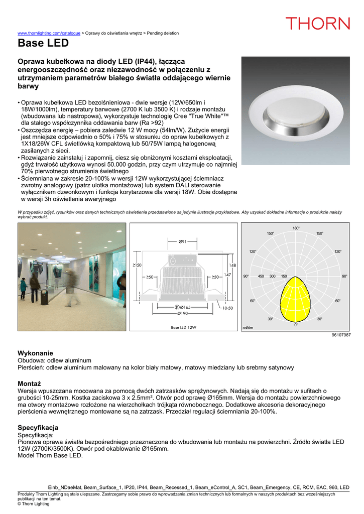 www.thornlighting.com/catalogue > Oprawy do oświetlania wnętrz > Pending deletion Base LED Oprawa kubełkowa na diody LED (IP44), łącząca energooszczędność oraz niezawodność w połączeniu z utrzymaniem parametrów białego światła oddającego wiernie barwy • Oprawa kubełkowa LED bezolśnieniowa - dwie wersje (12W/650lm i 18W/1000lm), temperatury barwowe (2700 K lub 3500 K) i rodzaje montażu (wbudowana lub nastropowa), wykorzystuje technologię Cree "True White"™ dla stałego współczynnika oddawania barw (Ra >92) • Oszczędza energię – pobiera zaledwie 12 W mocy (54lm/W). Zużycie energii jest mniejsze odpowiednio o 50% i 75% w stosunku do opraw kubełkowych z 1X18/26W CFL świetlówką kompaktową lub 50/75W lampą halogenową zasilanych z sieci. • Rozwiązanie zainstaluj i zapomnij, ciesz się obniżonymi kosztami eksploatacji, gdyż trwałość użytkowa wynosi 50.000 godzin, przy czym utrzymuje co najmniej 70% pierwotnego strumienia świetlnego • Ściemniana w zakresie 20-100% w wersji 12W wykorzystującej ściemniacz zwrotny analogowy (patrz ulotka montażowa) lub system DALI sterowanie wyłącznikem dzwonkowym i funkcja korytarzowa dla wersji 18W. Obie dostępne w wersji 3h oświetlenia awaryjnego W przypadku zdjęć, rysunków oraz danych technicznych oświetlenia przedstawione są jedynie ilustracje przykładowe. Aby uzyskać dokładne informacje o produkcie należy wybrać produkt. 180° 150° 150° 120° 90° 120° 450 300 150 90° 60° 60° 30° cd/klm 30° 0° 96107987 Wykonanie Obudowa: odlew aluminum Pierścień: odlew aluminium malowany na kolor biały matowy, matowy miedziany lub srebrny satynowy Montaż Wersja wpuszczana mocowana za pomocą dwóch zatrzasków sprężynowych. Nadają się do montażu w sufitach o grubości 10-25mm. Kostka zaciskowa 3 x 2.5mm². Otwór pod oprawę Ø165mm. Wersja do montażu powierzchniowego ma otwory montażowe rozłożone na wierzchołkach trójkąta równobocznego. Dodatkowe akcesoria dekoracyjnego pierścienia wewnętrznego montowane są na zatrzask. Przedział regulacji ściemniania 20-100%. Specyfikacja Specyfikacja: Pionowa oprawa światła bezpośredniego przeznaczona do wbudowania lub montażu na powierzchni. Źródło światła LED 12W (2700K/3500K). Otwór pod okablowanie Ø165mm. Model Thorn Base LED. Einb_NDaeMat, Beam_Surface_1, IP20, IP44, Beam_Recessed_1, Beam_eControl_A, SC1, Beam_Emergency, CE, RCM, EAC, 960, LED Produkty Thorn Lighting są stale ulepszane. Zastrzegamy sobie prawo do wprowadzania zmian technicznych lub formalnych w naszych produktach bez wcześniejszych publikacji na ten temat. © Thorn Lighting
