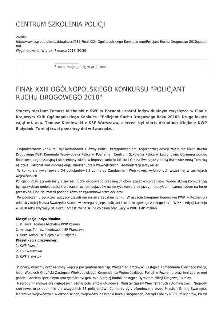 CENTRUM SZKOLENIA POLICJI Źródło: http://www.csp.edu.pl/csp/aktualnosci/987,Final-XXIII-Ogolnopolskiego-Konkursu-quotPolicjant-Ruchu-Drogowego-2010quot.h tml Wygenerowano: Wtorek, 7 marca 2017, 20:50 Strona znajduje się w archiwum. FINAŁ XXIII OGÓLNOPOLSKIEGO KONKURSU "POLICJANT RUCHU DROGOWEGO 2010" Starszy sierżant Tomasz Michalski z KWP w Poznaniu został indywidualnym zwycięzcą w Finale Krajowym XXIII Ogólnopolskiego Konkursu "Policjant Ruchu Drogowego Roku 2010". Drugą lokatę zajął mł. asp. Tomasz Kleniewski z KSP Warszawa, a trzeci był sierż. Arkadiusz Kiejko z KWP Białystok. Turniej trwał przez trzy dni w Swarzędzu. Organizatorem konkursu był Komendant Główny Policji. Przygotowaniami tegorocznej edycji zajęło się Biuro Ruchu Drogowego KGP, Komenda Wojewódzka Policji w Poznaniu i Centrum Szkolenia Policji w Legionowie. Ogromną pomoc finansową, organizacyjną i nieoceniony wkład w imprezę wniosło Miasto i Gmina Swarzędz z panią Burmistrz Anną Tomicką na czele. Patronat nad imprezą objął Minister Spraw Wewnętrznych i Administracji Jerzy Miller. W konkursie rywalizowało 34 policjantów i 2 żołnierzy Żandarmerii Wojskowej, wyłonionych wcześniej w turniejach wojewódzkich. Policjanci rozwiązywali testy z zakresu ruchu drogowego oraz innych obowiązujących przepisów. Widowiskową konkurencją był sprawdzian umiejętności kierowania ruchem pojazdów na skrzyżowaniu oraz jazdy motocyklem i samochodem na torze przeszkód. Finaliści zostali poddani również egzaminowi strzeleckiemu. Po podliczeniu punktów wszyscy zjawili się na swarzędzkim rynku. W asyście kompanii honorowej KWP w Poznaniu i orkiestry dętej Miasta Swarzędza stanęli w szeregu najlepsi policjanci ruchu drogowego z całego kraju. W XXIII edycji turnieju w 2010 roku zwyciężył st. sierż. Tomasz Michalski na co dzień pracujący w WRD KMP Poznań. Klasyfikacja indywidualna: 1. st. sierż. Tomasz Michalski KWP Poznań 2. mł. asp. Tomasz Kleniewski KSP Warszawa 3. sierż. Arkadiusz Kiejko KWP Białystok Klasyfikacja drużynowa: 1. KWP Poznań 2. KSP Warszawa 3. KWP Białystok Puchary, dyplomy oraz nagrody wręczył policjantom nadinsp. Waldemar Jarczewski Zastępca Komendanta Głównego Policji, insp. Wojciech Ołdyński Zastępca Wielkopolskiego Komendanta Wojewódzkiego Policji w Poznaniu oraz inni zaproszeni goście. Gościem specjalnym uroczystości był gen. mjr. Siergiej Budnik Zastępca Dyrektora Milicji Drogowej Ukrainy. Nagrody finansowe dla najlepszych ośmiu policjantów ufundował Minister Spraw Wewnętrznych i Administracji. Nagrody rzeczowe, oraz upominki dla wszystkich 36 policjantów i żołnierzy były ufundowane przez Miasto i Gminę Swarzędz, Marszałka Województwa Wielkopolskiego, Wojewódzkie Ośrodki Ruchu Drogowego, Zarząd Główny NSZZ Policjantów, Polski Związek Motorowy, Automobilklub Wielkopolski. (źródło: KWP w Poznaniu) Serdecznie dziękujemy Kierownikowi Zakładu Ruchu Drogowego podinsp. Elżbiecie Kołodziejskiej-Powalskiej za pracę w Zespole Organizacyjnym Konkursu i przewodniczenie Komisji Sędziowskiej w części teoretycznej rozgrywek, a także asp. szt. Waldemarowi Dudkowskiemu i asp. szt. Zenonowi Jagielskiemu za przewodniczenie w Komisjach Sędziowskich w konkurencjach z zakresu kierowania ruchem drogowym na skrzyżowaniu oraz jazdy sprawnościowej motocyklem służbowym i samochodem osobowym. Hanna Grochowska Ocena: 0/5 (0) Tweetnij
