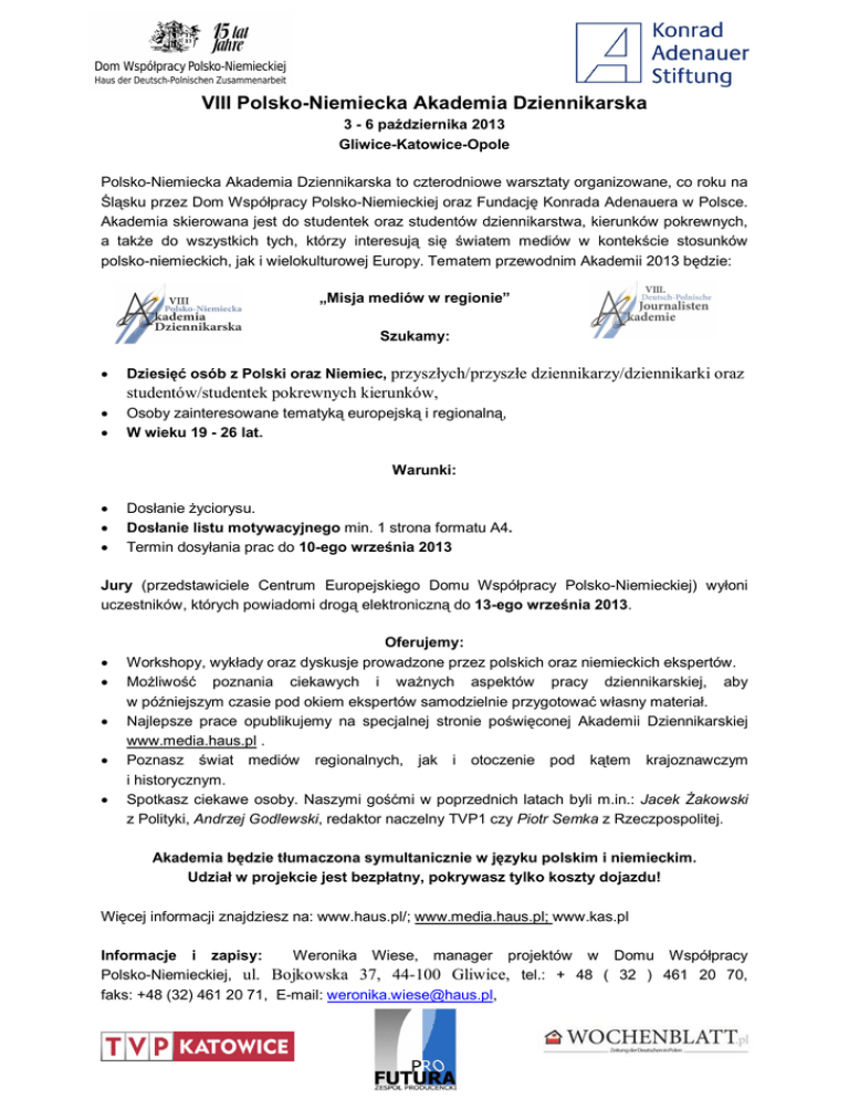 VIII Polsko-Niemiecka Akademia Dziennikarska 3 - 6 października 2013 Gliwice-Katowice-Opole Polsko-Niemiecka Akademia Dziennikarska to czterodniowe warsztaty organizowane, co roku na Śląsku przez Dom Współpracy Polsko-Niemieckiej oraz Fundację Konrada Adenauera w Polsce. Akademia skierowana jest do studentek oraz studentów dziennikarstwa, kierunków pokrewnych, a także do wszystkich tych, którzy interesują się światem mediów w kontekście stosunków polsko-niemieckich, jak i wielokulturowej Europy. Tematem przewodnim Akademii 2013 będzie: „Misja mediów w regionie” Szukamy: Dziesięć osób z Polski oraz Niemiec, przyszłych/przyszłe dziennikarzy/dziennikarki oraz studentów/studentek pokrewnych kierunków, Osoby zainteresowane tematyką europejską i regionalną, W wieku 19 - 26 lat. Warunki: Dosłanie życiorysu. Dosłanie listu motywacyjnego min. 1 strona formatu A4. Termin dosyłania prac do 10-ego września 2013 Jury (przedstawiciele Centrum Europejskiego Domu Współpracy Polsko-Niemieckiej) wyłoni uczestników, których powiadomi drogą elektroniczną do 13-ego września 2013. Oferujemy: Workshopy, wykłady oraz dyskusje prowadzone przez polskich oraz niemieckich ekspertów. Możliwość poznania ciekawych i ważnych aspektów pracy dziennikarskiej, aby w późniejszym czasie pod okiem ekspertów samodzielnie przygotować własny materiał. Najlepsze prace opublikujemy na specjalnej stronie poświęconej Akademii Dziennikarskiej www.media.haus.pl . Poznasz świat mediów regionalnych, jak i otoczenie pod kątem krajoznawczym i historycznym. Spotkasz ciekawe osoby. Naszymi gośćmi w poprzednich latach byli m.in.: Jacek Żakowski z Polityki, Andrzej Godlewski, redaktor naczelny TVP1 czy Piotr Semka z Rzeczpospolitej. Akademia będzie tłumaczona symultanicznie w języku polskim i niemieckim. Udział w projekcie jest bezpłatny, pokrywasz tylko koszty dojazdu! Więcej informacji znajdziesz na: www.haus.pl/; www.media.haus.pl; www.kas.pl Informacje i zapisy: Weronika Wiese, manager projektów w Domu Współpracy Polsko-Niemieckiej, ul. Bojkowska 37, 44-100 Gliwice, tel.: + 48 ( 32 ) 461 20 70, faks: +48 (32) 461 20 71, E-mail: [email protected],