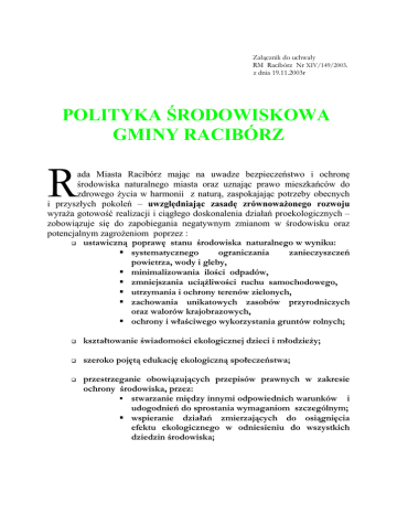 Załącznik do uchwały RM Racibórz Nr XIV/149/2003. z dnia 19.11.2003r POLITYKA ŚRODOWISKOWA GMINY RACIBÓRZ R ada Miasta Racibórz mając na uwadze bezpieczeństwo i ochronę środowiska naturalnego miasta oraz uznając prawo mieszkańców do zdrowego życia w harmonii z naturą, zaspokajając potrzeby obecnych i przyszłych pokoleń – uwzględniając zasadę zrównoważonego rozwoju wyraża gotowość realizacji i ciągłego doskonalenia działań proekologicznych – zobowiązuje się do zapobiegania negatywnym zmianom w środowisku oraz potencjalnym zagrożeniom poprzez : ustawiczną poprawę stanu środowiska naturalnego w wyniku: systematycznego ograniczania zanieczyszczeń powietrza, wody i gleby, minimalizowania ilości odpadów, zmniejszania uciążliwości ruchu samochodowego, utrzymania i ochrony terenów zielonych, zachowania unikatowych zasobów przyrodniczych oraz walorów krajobrazowych, ochrony i właściwego wykorzystania gruntów rolnych; kształtowanie świadomości ekologicznej dzieci i młodzieży; szeroko pojętą edukację ekologiczną społeczeństwa; przestrzeganie obowiązujących przepisów prawnych w zakresie ochrony środowiska, przez: stwarzanie między innymi odpowiednich warunków i udogodnień do sprostania wymaganiom szczególnym; wspieranie działań zmierzających do osiągnięcia efektu ekologicznego w odniesieniu do wszystkich dziedzin środowiska; rozszerzanie podmiotowego i rzeczowego zakresu objętego działaniami systemowymi usprawniającymi zarządzanie środowiskowe w Gminie; monitorowanie czynników szkodliwych w mieście oraz ich nadzorowanie i kontrolę; zapobieganie awariom i nadzwyczajnym zagrożeniom oraz usuwanie ich skutków; promowanie ekologicznego rolnictwa i produkcji rolnej; oszczędne i racjonalne gospodarowanie zasobami naturalnymi; promowanie firm i zakładów o produkcji przyjaznej dla środowiska rozwijanie współpracy z sąsiednimi Gminami i innymi podmiotami w zakresie wypracowania jednolitego systemu działań na rzecz ochrony środowiska. Polityka ta jest jawna, skierowana do wszystkich zainteresowanych i wynika z realizacji założeń: o AGENDY 21 – dokumentu końcowego konferencji „szczytu państw” zorganizowanej w 1992r w Rio de Janeiro, o Polityki Ekologicznej Państwa, o Dyrektyw Unii Europejskiej i jest zbieżna z wojewódzkim, powiatowym i gminnym Programem Ochrony Środowiska. Przewodniczy Rady Miasta Tadeusz Wojnar Prezydent Miasta Jan Osuchowski
