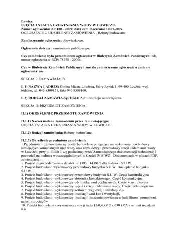 Łowicz: UJĘCIA I STACJA UZDATNIANIA WODY W ŁOWICZU. Numer ogłoszenia: 233188 - 2009; data zamieszczenia: 10.07.2009 OGŁOSZENIE O UDZIELENIU ZAMÓWIENIA - Roboty budowlane Zamieszczanie ogłoszenia: obowiązkowe. Ogłoszenie dotyczy: zamówienia publicznego. Czy zamówienie było przedmiotem ogłoszenia w Biuletynie Zamówień Publicznych: tak, numer ogłoszenia w BZP: 78778 - 2009r. Czy w Biuletynie Zamówień Publicznych zostało zamieszczone ogłoszenie o zmianie ogłoszenia: nie. SEKCJA I: ZAMAWIAJĄCY I. 1) NAZWA I ADRES: Gmina Miasta Łowicza, Stary Rynek 1, 99-400 Łowicz, woj. łódzkie, tel. 046 8309151, faks 046 8309160. I. 2) RODZAJ ZAMAWIAJĄCEGO: Administracja samorządowa. SEKCJA II: PRZEDMIOT ZAMÓWIENIA II.1) OKREŚLENIE PRZEDMOTU ZAMÓWIENIA II.1.1) Nazwa nadana zamówieniu przez zamawiającego: UJĘCIA I STACJA UZDATNIANIA WODY W ŁOWICZU.. II.1.2) Rodzaj zamówienia: Roboty budowlane. II.1.3) Określenie przedmiotu zamówienia: 1.Przedmiotem zamówienia są roboty budowlane polegające na wykonaniu przebudowy istniejących komunalnych ujęć wody oraz rozbudowy i przebudowy stacji uzdatniania wody w Łowiczu, przy ul. Blich 3 wg posiadanej przez Zamawiającego dokumentacji technicznej i pozwoleń na budowę wyszczególnionych w Części IV SIWZ - Dokumentacja w plikach PDF, zawierającej : 1. Projekt zagospodarowania działek nr 1393 i 14391/7 dla budynku S.U.W. 2. Projekt budowlano wykonawczy przebudowy budynku S.U.W. Docieplenie budynku S.U.W. 3. Projekt budowlano- wykonawczy przebudowy budynku S.U.W. Część konstrukcyjna 4. Projekt budowlano- wykonawczy zbiornika kontaktowego . Część konstrukcyjna 5. Projekt budowlano- wykonawczy odstojnika wód popłucznych. Część konstrukcyjna 6. Projekt budowlano- wykonawczy ujęcia i stacji uzdatniania wody. Część technologiczna 7. Projekt budowlano- wykonawczy kotłowni węglowej i instalacji c.o. 8. Projekt budowlano- wykonawczy instalacji wod-kan i wentylacji, 9. Projekt budowlano- wykonawczy instalacji osuszania powietrza w hali filtrów, pompowni, galerii rurociągów 10. Projekt budowlano - wykonawczy stacji trafo 15/0,4 kV 2 x 630 kVA - remont urządzeń n.n. 11. Projekt budowlano - wykonawczy linii kablowych nn zasilających budynek SUW oraz linii kablowych do odbiorników technologicznych 12. Projekt budowlano - wykonawczy instalacji elektrycznych wewnętrznych. 13. Projekt budowlano - wykonawczy komputerowego systemu sterowania i monitoringu 14. Przedmiar robót. Branża budowlano - konstrukcyjna dla I etapu realizacji inwestycji. 15. Przedmiar robót. Branża budowlano - konstrukcyjna dla II etapu realizacji inwestycji. 16. Przedmiar robót. Branża budowlano - konstrukcyjna dla III etapu realizacji inwestycji. 17. Przedmiar robót. Branża technologiczno - sanitarna dla I etapu realizacji inwestycji. 18. Przedmiar robót. Branża technologiczno - sanitarna dla II etapu realizacji inwestycji. 19. Przedmiar robót. Branża technologiczno - sanitarna dla III etapu realizacji inwestycji. 20. Przedmiar robót dla robót elektrycznych ( poz. 9) 21. Przedmiar robót dla robót elektrycznych ( poz. 10) 22. Przedmiar robót dla instalacji elektrycznych wewnętrznych (poz.11) 23. Przedmiar robót dla komputerowego systemu sterowania i monitoringu ( poz. 12) 24. Przedmiar robót, łączność radiowa- automatyka i A.K.P. Alternatywa do transmisji kablowej od studni 25. Informacja dotycząca bezpieczeństwa i ochrony zdrowa. 26. Specyfikacja techniczna wykonania i odbioru robót. Część budowlano - konstrukcyjna 27. Specyfikacja techniczna wykonania i odbioru robót. Część technologiczno - sanitarna. 28. Specyfikacja techniczna wykonania i odbioru robót. Linie kablowe zewnętrzne. 29. Specyfikacja techniczna wykonania i odbioru robót. Instalacje elektryczne wewnętrzne 30. Specyfikacja techniczna wykonania i odbioru robót. Stacja trafo 15/0,4 kV 2 x 630 kVA remont urządzeń n.n. 31. Harmonogram robót i czynności organizacyjnych związanych z przebudową ujęcia oraz rozbudową i przebudową obiektów stacji uzdatniania wody. 32. Projekt zamienny w części dotyczącej projektu zagospodarowania działek: Nr 1391/7, 1391/36,1393,1391/5, 1381/2, 1381/5, 1381/6, 1381/3, 1391/4, 1391/3, 1391/2, 1391/37. 33. Decyzja Starosty Łowickiego Nr AB.7351-533/2007 z dnia 18 października 2007 roku zatwierdzająca projekt budowlany i udzielająca pozwolenie na budowę polegajacą na przebudowie istniejących komunalnych ujęc wody z uworów czwartorzędowych, trzeciorzędowych i dolnokredowych oraz rozbudowę i przebudowę obiektów stacji uzdatniania wody. 34. Decyzja Starosty Łowickiego Nr AB.7351-399/2008 z dnia 21 sierpnia 2008 roku zatwierdzająca zamienny projekt budowlany na przebudowę istniejących komunalnych ujęć wody z uworów czwartorzędowych,trzeciorzędowych i dolnokredowych oraz rozbudowę i przebudowę obiektów stacji uzdatniania wody. Stacja uzdatniania zasila w wodę zabudowę miasta oraz zakłady przemysłowe. Jakość wody uzdatnionej po wykonaniu zamówienia musi spełniać stale wymagania podane w Rozporządzeniu Ministra Zdrowia z dnia 29 marca 2007 roku. w sprawie jakości wody przeznaczonej do spożycia przez ludzi (Dz. U. Nr 61, poz. 417). 2. Zamówienie realizowane będzie w trzech etapach, zgodnie z harmonogramem robót ( rozdział IV pkt. 20 SIWZ), a zakres robót przedstawiony jest w Ogólnym zakresie robót ( część II niniejszej specyfikacji ) oraz w dokumentacji technicznej (część IV niniejszej specyfikacji). 3.Przebudowa stacji przewidywana jest przy zachowaniu ciągłości w dostawie wody uzdatnionej do miasta, (z uwzględnieniem uwag zawartych w harmonogramie robót i czynności organizacyjnych). Podstawowym celem inwestycji jest uzyskanie jakości wody uzdatnionej zgodnie z wymaganiami Rozporządzenia Ministra Zdrowia z dnia 29 marca 2007 r. w sprawie jakości wody przeznaczonej do spożycia przez ludzi (Dz. U. Nr 61, poz. 417). 4.Roboty winny zostać wykonane i ukończo