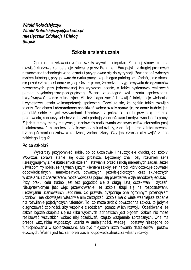 Witold Kołodziejczyk [email protected] miesięcznik Edukacja i Dialog Słupsk Szkoła a talent ucznia Ogromne oczekiwania wobec szkoły wywołują niepokój. Z jednej strony ma ona rozwijać kluczowe kompetencje zalecane przez Parlament Europejski, z drugiej promować nowoczesne technologie w nauczaniu i przygotować się do cyfryzacji. Powinna też wdrożyć system tutoringu, przygotować do rynku pracy i zapobiegać patologiom. Zadań, jakie stawia się przed szkołą, jest coraz więcej. Oczekuje się, że będzie przygotowywała do egzaminów zewnętrznych, przy jednoczesnej ich krytycznej ocenie, a także systemowo realizować pomoc psychologiczno-pedagogiczną. Winna zapobiegać wykluczeniu społecznemu i wyrównywać szanse edukacyjne. Ma też diagnozować i rozwijać inteligencje wielorakie i wyposażyć ucznia w kompetencje społeczne. Oczekuje się, że będzie także rozwijać talenty. Ten chaos i różnorodność oczekiwań wobec szkoły sprawiają, że coraz trudniej jest poradzić sobie z tymi wyzwaniami. Uczniowie z pokolenia buntu przyjmują strategie przetrwania, a nauczyciele bezskutecznie próbują zaangażować i motywować ich do pracy. Z jednej strony mamy motywację uczniów do realizowania własnych celów, nierzadko pasji i zainteresowań, niekoniecznie zbieżnych z celami szkoły, z drugiej – brak zainteresowania i zaangażowania uczniów w realizację zadań szkoły. Czy jest szansa, aby wyjść z tego zaklętego kręgu? Po co szkoła? Wystarczy przypomnieć sobie, po co uczniowie i nauczyciele chodzą do szkoły. Wówczas sprawa stanie się dużo prostsza. Będziemy znali cel, rozumieli sens i zrezygnujemy z nieskutecznych działań i stawiania przed szkołą nierealnych zadań. Jeżeli uświadomimy sobie, że najważniejszym klientem szkoły jest naród, który oczekuje obywateli odpowiedzialnych, samodzielnych, odważnych, przedsiębiorczych oraz skutecznych w działaniu i z charakterem, może wówczas pojawi się prawdziwa wizja narodowej edukacji. Przy braku celu trudno jest też pogodzić się z długą listą oczekiwań i życzeń. Nieuprawnionym jest więc przewidywanie, że szkoła skupi się na rozpoznawaniu i rozwijaniu uczniowskich uzdolnień. Co prawda, dysponuje ona ogromnym potencjałem uczniów i ma obowiązek właściwie nim zarządzać. Szkoła ma o wiele ważniejsze zadanie niż rozwijanie pojedynczych talentów. To, co może zrobić powszechna szkoła, to jedynie diagnozować zdolności, aby wspólnie z rodzicami pomóc w ich rozwoju. Oczekiwanie, że szkoła będzie skupiała się na kilku wybitnych jednostkach jest błędem. Szkoła nie może realizować wszystkich wobec niej oczekiwań, często wzajemnie sprzecznych. Ona ma przede wszystkim wyposażyć ucznia w umiejętności, wiedzę i postawy niezbędne do funkcjonowania w społeczeństwie. Ma być miejscem kształtowania charakterów i postaw etycznych. Ważna jest też samorealizacja i odpowiedzialność za własny rozwój. 1 Czy jest talent? Od lat przekonuje się polskich nauczycieli, że rozwijanie talentów to jedno z najważniejszych zadań. Twierdzi się, że to klucz do sukcesów szkoły. Problem polega na tym, że nie uwzględniamy w naszym myśleniu dwóch faktów: 1. dziś szkoła nie jest jedynym miejscem uczenia się i rozwijania kompetencji, 2. inteligencja wieloraka to jeszcze nie talent. Talent to wyjątkowość i prawdziwa rzadkość. W klasie często nie mamy żadnego ucznia o takich predyspozycjach. Sama szkoła może, choć wcale nie musi posiadać kilku utalentowanych uczniów. Wystarczy odpowiedzić sobie na pytanie, ilu z nich osiąga ponadprzeciętne i wyjątkowe sukcesy w dziedzinie intelektualnej, ruchowej, czy artystycznej? Jaki to procent uczniów? Nie jest prawdą, że prawdziwe talenty rozwiną się w momencie zdiagnozowania jednej z wielorakich inteligencji. Nawet, jeżeli szkoła będzie pracowała nad ich wykorzystaniem, to na pewno nie przybędzie jej talentów. Pracowitość, punktualność, odpowiedzialność, szczerość, systematyczność i wiele, wiele innych, to cechy charakteru, które trzeba nie tylko formować, ale także pielęgnować. To jest siła, która pozwala budować osobistą ścieżkę kariery. Mitem jest więc przekonanie, że wszyscy nasi uczniowie mogą stać się współczesnym Mozartem, Małyszem, czy Oprą Winfrey. Inteligencja przestrzenna, kinestetyczna, matematyczna, czy językowa nie oznaczają, że uczeń ma talent. To może być tylko wskazówką i informacją o potencjalnym talencie. Jednak z samego faktu posiadania określonego typu inteligencji uczeń nie stanie się wybitnym pisarzem, wielkim architektem, głośnym naukowcem, tancerzem czy sportowcem. Inteligencja oznacza pewne predyspozycje, sposób wyrażania świata, język, w którym komunikuje się najlepiej i dzięki któremu można się łatwiej uczyć. Oczywiście, że należy tę wiedzę wykorzystać w szkolnej dydaktyce przy wyborze strategii uczenia się i nauczania. Prawdziwy talent się obroni i szkoła mu w tym na pewno nie zaszkodzi, mimo, że nad jego rozwojem nie będzie się w jakiś wyjątkowy sposób koncentrowała. Szkoła na pewno szuka talentów, nierzadko je odkrywa, wykorzystuje i jest z tego powodu bardzo dumna. Często w ten sposób buduje swoją przewagę konkurencyjną. Nie oszukujmy się, że szkoła będzie miejscem rozwoju talentów na miarę Mikołaja Góreckiego, Maurica Bejarta, Umberto Eco, Marii Callas, czy Agnieszki Radwańskiej. Najczęściej prawdziwy talent nie potrzebuje szkoły. Ale również szkoła nie jest w stanie zabić talentów. Ona może ich nie rozpoznać i nie rozwijać, ale prawdziwego talentu – na pewno – nie zniszczy. Jeżeli talent zdefiniujemy jako wyjątkowe wrodzone predyspozycje w dziedzinie intelektualnej, ruchowej lub artystycznej, przejawiające się ponadprzeciętnym stopniem sprawności w danej dziedzinie lub zdolnością do szybkiego uczenia się jej, to zrozumiemy, że szkoła nie może przyją