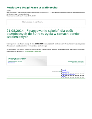 Powiatowy Urząd Pracy w Wałbrzychu Źródło: http://urzadpracy.pl/pl/formy-aktywizacji/biezace/aktualnosci/17671,21082014-Finansowanie-szkolen-dla-osob-bezrobotnychdo-30-roku-zycia-w-ramach-bo.html Wygenerowano: Wtorek, 7 marca 2017, 20:58 Strona znajduje się w archiwum. 21.08.2014 - Finansowanie szkoleń dla osób bezrobotnych do 30 roku życia w ramach bonów szkoleniowych Informujemy, iż przedłużona zostaje do dnia 12.09.2014r. rekrutacja osób zainteresowanych uzyskaniem wsparcia poprzez sfinansowanie kosztów szkolenia w ramach bonu szkoleniowego. Szczegółowych informacji o zasadach realizacji bonów szkoleniowych udzielają doradcy klienta w Wałbrzychu i Oddziałach Powiatowego Urzędu Pracy. (czytaj więcej o rekrutacji) Metryka strony Data publikacji 21.08.2014 Rejestr zmian Osoba publikująca: Lidia Dudek Autor: Magdalena Oleś Liczba wejść: 601 Drukuj Generuj PDF Powiadom znajomego Wstecz