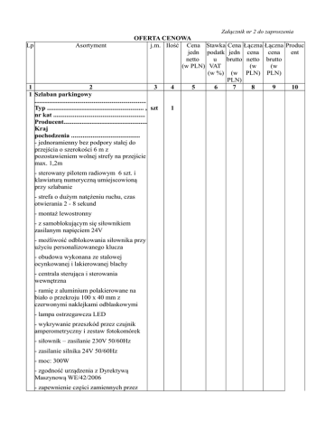 Załącznik nr 2 do zaproszenia Lp Asortyment OFERTA CENOWA j.m. Ilość Cena Stawka Cena Łączna jedn podatk jedn cena netto u brutto netto (w PLN) VAT (w (w %) (w PLN) PLN) 3 4 5 6 7 8 1 2 1 Szlaban parkingowy .................................................................... Typ ........................................................... , szt nr kat ........................................................ Producent................................................... Kraj pochodzenia .......................................... - jednoramienny bez podpory stałej do przejścia o szerokości 6 m z pozostawieniem wolnej strefy na przejście max. 1,2m - sterowany pilotem radiowym 6 szt. i klawiaturą numeryczną umiejscowioną przy szlabanie - strefa o dużym natężeniu ruchu, czas otwierania 2 - 8 sekund - montaż lewostronny - z samoblokującym się siłownikiem zasilanym napięciem 24V - możliwość odblokowania siłownika przy użyciu personalizowanego klucza - obudowa wykonana ze stalowej ocynkowanej i lakierowanej blachy - centrala sterująca i sterowania wewnętrzna - ramię z aluminium polakierowane na biało o przekroju 100 x 40 mm z czerwonymi naklejkami odblaskowymi - lampa ostrzegawcza LED - wykrywanie przeszkód przez czujnik amperometryczny i zestaw fotokomórek - siłownik – zasilanie 230V 50/60Hz - zasilanie silnika 24V 50/60Hz - moc: 300W - zgodność urządzenia z Dyrektywą Maszynową WE/42/2006 - zapewnienie części zamiennych przez 1 Łączna Produc cena ent brutto (w PLN) 9 10 okres 10 lat - okres gwarancji min. 36 m-cy X X X X X X X X