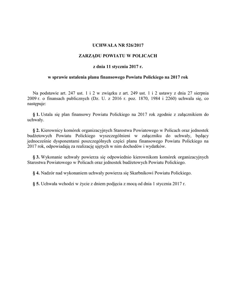 UCHWAŁA NR 526/2017 ZARZĄDU POWIATU W POLICACH z dnia 11 stycznia 2017 r. w sprawie ustalenia planu finansowego Powiatu Polickiego na 2017 rok Na podstawie art. 247 ust. 1 i 2 w związku z art. 249 ust. 1 i 2 ustawy z dnia 27 sierpnia 2009 r. o finansach publicznych (Dz. U. z 2016 r. poz. 1870, 1984 i 2260) uchwala się, co następuje: § 1. Ustala się plan finansowy Powiatu Polickiego na 2017 rok zgodnie z załącznikiem do uchwały. § 2. Kierownicy komórek organizacyjnych Starostwa Powiatowego w Policach oraz jednostek budżetowych Powiatu Polickiego wyszczególnieni w załączniku do uchwały, będący jednocześnie dysponentami poszczególnych części planu finansowego Powiatu Polickiego na 2017 rok, odpowiadają za realizację ujętych w nim dochodów i wydatków. § 3. Wykonanie uchwały powierza się odpowiednio kierownikom komórek organizacyjnych Starostwa Powiatowego w Policach oraz jednostek budżetowych Powiatu Polickiego. § 4. Nadzór nad wykonaniem uchwały powierza się Skarbnikowi Powiatu Polickiego. § 5. Uchwała wchodzi w życie z dniem podjęcia z mocą od dnia 1 stycznia 2017 r. Uzasadnienie. Projekt uchwały przedkłada Skarbnik Powiatu Polickiego w trybie § 67 ust. 1 Statutu Powiatu Polickiego (Dz. Urz. Woj. Zachodniopomorskiego z 2015 r. poz. 5579). Przepisy art. 247 ust. 1 i 2 ustawy z dnia 27 sierpnia 2009 r. o finansach publicznych (Dz. U. z 2016 r. poz. 1870 z późn. zm.) stanowią odpowiednio, że: 1) budżet jednostki samorządu terytorialnego wykonuje jej zarząd; 2) zarząd jednostki samorządu terytorialnego sprawuje ogólny nadzór nad realizacją, określonych uchwałą budżetową, dochodów i wydatków, przychodów i rozchodów budżetu jednostki samorządu terytorialnego. Natomiast, zgodnie z art. 249 ust. 1 i 2 powołanej ustawy: 1) w terminie 21 dni od dnia podjęcia uchwały budżetowej zarząd jednostki samorządu terytorialnego przekazuje podległym jednostkom informacje o ostatecznych kwotach dochodów i wydatków tych jednostek oraz wysokości dotacji i wpłat do budżetu, a także opracowuje plan finansowy zadań z zakresu administracji rządowej oraz innych zadań zleconych jednostce samorządu terytorialnego odrębnymi ustawami, przyjmując jako podstawę dla tego planu kwotę dotacji przyznanych na ten cel w roku budżetowym oraz wielkość dochodów związanych z realizacją tych zadań, które podlegają przekazaniu do budżetu państwa; 2) jednostki organizacyjne jednostki samorządu terytorialnego dostosowują projekty planów do uchwały budżetowej. W dniu 23 grudnia 2016 r. Rada Powiatu w Policach podjęła uchwałę Nr XXV/212/2016 w sprawie uchwalenia budżetu Powiatu Polickiego na 2017 rok. Wykonując dyspozycję określoną w art. 249 ust. 1 i 2 powołanej ustawy Przewodniczący Zarządu Powiatu w Policach pismem znak SF.3024.3.2016 z dnia 30 grudnia 2016 r. przekazał informacje o ostatecznych kwotach dochodów i wydatków jednostek budżetowych Powiatu Polickiego oraz wysokości dotacji i wpłat do budżetu w 2017 r., a także zobowiązał kierowników jednostek budżetowych Powiatu Polickiego do sporządzenia planów finansowych jednostek. Następnie kierownicy jednostek budżetowych Powiatu Polickiego, działając na podstawie § 8 ust. 5 rozporządzenia Ministra Finansów z dnia 7 grudnia 2010 r. w sprawie sposobu prowadzenia gospodarki finansowej jednostek budżetowych i samorządowych zakładów budżetowych (Dz. U. z 2015 r. poz. 1542), sporządzili plany finansowe tych jednostek i przekazali je do Wydziału Finansów i Budżetu Starostwa Powiatowego w Policach. W związku z powyższym zachodzi potrzeba ustalenia planu finansowego Powiatu Polickiego na 2017 rok.