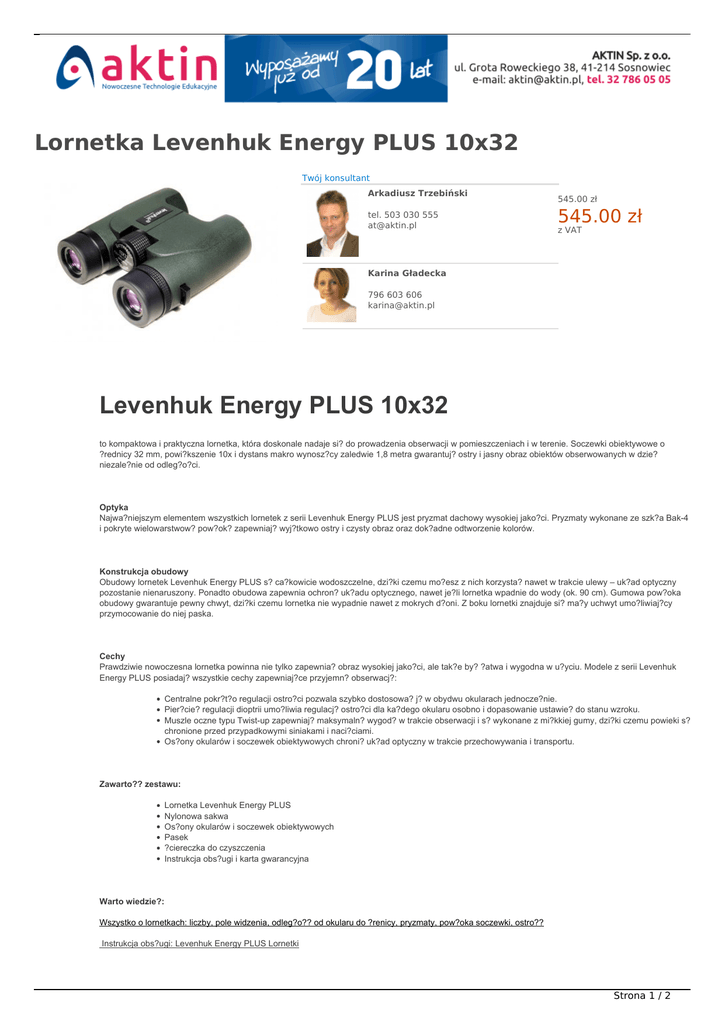 Lornetka Levenhuk Energy PLUS 10x32 Twój konsultant Arkadiusz Trzebiński tel. 503 030 555 [email protected] NOWOŚĆ W OFERCIE 545.00 zł 545.00 zł z VAT Karina Gładecka 796 603 606 [email protected] Levenhuk Energy PLUS 10x32 to kompaktowa i praktyczna lornetka, która doskonale nadaje si? do prowadzenia obserwacji w pomieszczeniach i w terenie. Soczewki obiektywowe o ?rednicy 32 mm, powi?kszenie 10x i dystans makro wynosz?cy zaledwie 1,8 metra gwarantuj? ostry i jasny obraz obiektów obserwowanych w dzie? niezale?nie od odleg?o?ci. Optyka Najwa?niejszym elementem wszystkich lornetek z serii Levenhuk Energy PLUS jest pryzmat dachowy wysokiej jako?ci. Pryzmaty wykonane ze szk?a Bak-4 i pokryte wielowarstwow? pow?ok? zapewniaj? wyj?tkowo ostry i czysty obraz oraz dok?adne odtworzenie kolorów. Konstrukcja obudowy Obudowy lornetek Levenhuk Energy PLUS s? ca?kowicie wodoszczelne, dzi?ki czemu mo?esz z nich korzysta? nawet w trakcie ulewy – uk?ad optyczny pozostanie nienaruszony. Ponadto obudowa zapewnia ochron? uk?adu optycznego, nawet je?li lornetka wpadnie do wody (ok. 90 cm). Gumowa pow?oka obudowy gwarantuje pewny chwyt, dzi?ki czemu lornetka nie wypadnie nawet z mokrych d?oni. Z boku lornetki znajduje si? ma?y uchwyt umo?liwiaj?cy przymocowanie do niej paska. Cechy Prawdziwie nowoczesna lornetka powinna nie tylko zapewnia? obraz wysokiej jako?ci, ale tak?e by? ?atwa i wygodna w u?yciu. Modele z serii Levenhuk Energy PLUS posiadaj? wszystkie cechy zapewniaj?ce przyjemn? obserwacj?: Centralne pokr?t?o regulacji ostro?ci pozwala szybko dostosowa? j? w obydwu okularach jednocze?nie. Pier?cie? regulacji dioptrii umo?liwia regulacj? ostro?ci dla ka?dego okularu osobno i dopasowanie ustawie? do stanu wzroku. Muszle oczne typu Twist-up zapewniaj? maksymaln? wygod? w trakcie obserwacji i s? wykonane z mi?kkiej gumy, dzi?ki czemu powieki s? chronione przed przypadkowymi siniakami i naci?ciami. Os?ony okularów i soczewek obiektywowych chroni? uk?ad optyczny w trakcie przechowywania i transportu. Zawarto?? zestawu: Lornetka Levenhuk Energy PLUS Nylonowa sakwa Os?ony okularów i soczewek obiektywowych Pasek ?ciereczka do czyszczenia Instrukcja obs?ugi i karta gwarancyjna Warto wiedzie?: Wszystko o lornetkach: liczby, pole widzenia, odleg?o?? od okularu do ?renicy, pryzmaty, pow?oka soczewki, ostro?? Instrukcja obs?ugi: Levenhuk Energy PLUS Lornetki Strona 1 / 2 Powi?kszenie, x Typ Materia? uk?adu optycznego Pow?oka uk?adu optycznego ?rednica soczewki obiektywowej (apertura), mm Odleg?o?? od okularu do ?renicy, mm Oddalenie ?renicy wyj?ciowej, mm Wspó?czynnik zmierzch Jasno?? wzgl?dna Pole widzenia, ° Pole widzenia przy 1000 m Makro, m Regulacja dioptrii okularu, dioptrii Wodoszczelna Wymiary, mm Masa, kg 10 Pryzmat dachowy Szk?o BaK-4 pe?na, wielowarstwowa pow?oka 32 3,2 14 17,89 10,24 5,8 101 2 tak tak 130x127x48 0,554 Strona 2 / 2 Powered by TCPDF (www.tcpdf.org)