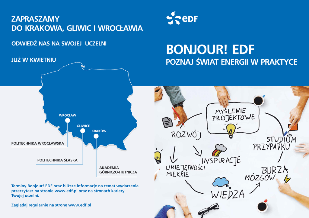 ZAPRASZAMY DO KRAKOWA, GLIWIC I WROCŁAWIA ODWIEDŹ NAS NA SWOJEJ UCZELNI JUŻ W KWIETNIU BONJOUR! EDF POZNAJ ŚWIAT ENERGII W PRAKTYCE WROCŁAW GLIWICE KRAKÓW POLITECHNIKA WROCŁAWSKA POLITECHNIKA ŚLĄSKA AKADEMIA GÓRNICZO-HUTNICZA Terminy Bonjour! EDF oraz bliższe informacje na temat wydarzenia przeczytasz na stronie www.edf.pl oraz na stronach kariery Twojej uczelni. Zaglądaj regularnie na stronę www.edf.pl BONJOUR! EDF ©EDF - CHURCHILL ROBERT Zapraszamy na dzień z Grupą EDF. Weź udział w warsztatach inżynierskich, prezentacjach i ciekawym studium przypadku. Dowiedz się jakie możliwości rozwoju oferuje Grupa EDF w Polsce i jak przygotować się do procesu rekrutacji. Sprawdź się w zadaniach kryzysowych, które opracowaliśmy dla Ciebie na bazie rzeczywistych wydarzeń. Poznaj świat energii w praktyce. ZNAJDŹ ROZWIĄZANIE (STUDIUM PRZYPADKU) ©EDF - JAYET STEPHANIE Chcesz poznać metody zarządzania sytuacją kryzysową w energetyce? Chcesz wiedzieć, jak zachować się w przypadku awarii bloku energetycznego, a jak gdy awaria dotyczy magistrali ciepłowniczej? Na te i inne pytania znajdziesz odpowiedzi podczas warsztatów, które dla Ciebie przygotowaliśmy. SPRAWDŹ SIĘ (WARSZTATY INŻYNIERSKIE) Poznaj świat energii w praktyce. W kilkuosobowych zespołach będziesz pracować nad energetycznymi zadaniami. W ten sposób przybliżymy specyfikę pracy w naszej branży. Zapraszamy do współzawodnictwa z energią w tle! POZNAJ EDF (PREZENTACJE) DOŁĄCZ DO NAS (WSKAZÓWKI REKRUTACYJNE) Grupa EDF jest jedną z największych grup energetycznych świata. Działa we wszystkich obszarach energetyki od produkcji do sprzedaży energii. Każdego dnia dziesiątki milionów ludzi korzystają z energii od EDF. W ciągu kilkudziesięciu minut przybliżymy Ci naszą działalność w Polsce oraz możliwości rozwoju w naszych spółkach. Jeżeli chcesz pracować w energetyce, poznaj nasz proces rekrutacji. Przedstawimy kilka praktycznych wskazówek, w jaki sposób zdobyć wymarzoną pracę oraz jakie wyzwania stawia przed kandydatami rynek energii.