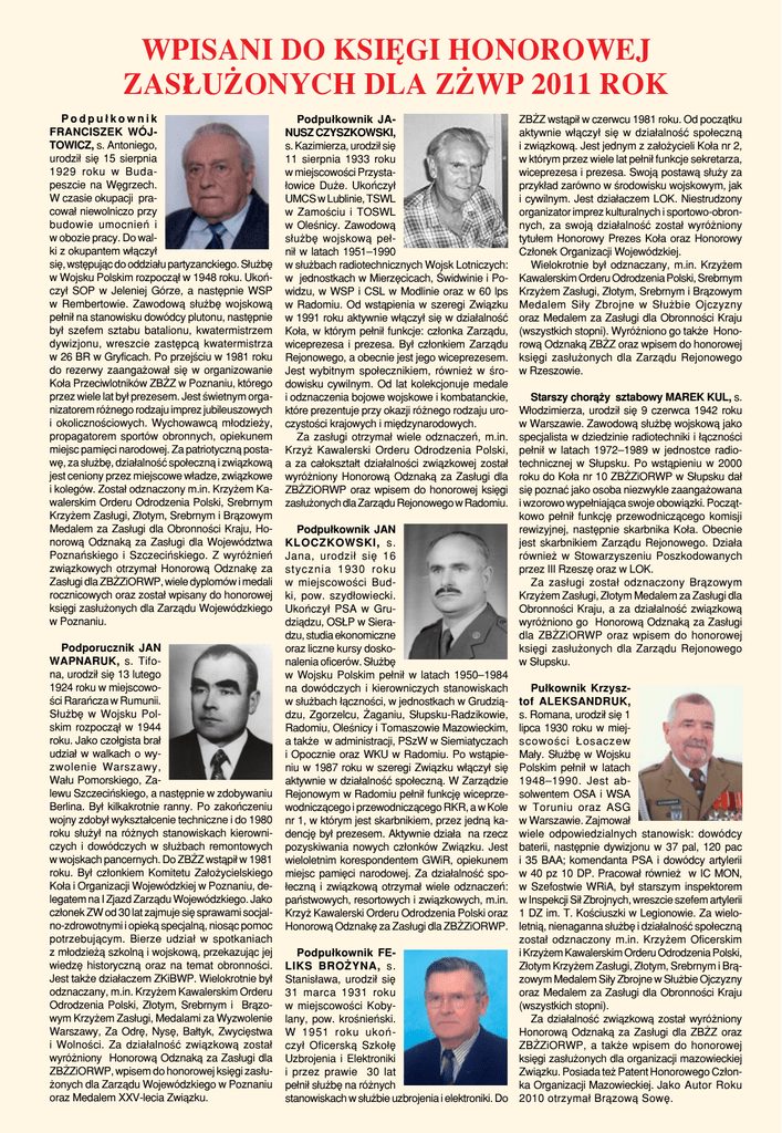 WPISANI DO KSIĘGI HONOROWEJ ZASŁUŻONYCH DLA ZŻWP 2011 ROK Podpułkownik FRANCISZEK WÓJTOWICZ, s. Antoniego, urodził się 15 sierpnia 1929 roku w Budapeszcie na Węgrzech. W czasie okupacji pracował niewolniczo przy budowie umocnień i w obozie pracy. Do walki z okupantem włączył się, wstępując do oddziału partyzanckiego. Służbę w Wojsku Polskim rozpoczął w 1948 roku. Ukończył SOP w Jeleniej Górze, a następnie WSP w Rembertowie. Zawodową służbę wojskową pełnił na stanowisku dowódcy plutonu, następnie był szefem sztabu batalionu, kwatermistrzem dywizjonu, wreszcie zastępcą kwatermistrza w 26 BR w Gryficach. Po przejściu w 1981 roku do rezerwy zaangażował się w organizowanie Koła Przeciwlotników ZBŻZ w Poznaniu, którego przez wiele lat był prezesem. Jest świetnym organizatorem różnego rodzaju imprez jubileuszowych i okolicznościowych. Wychowawcą młodzieży, propagatorem sportów obronnych, opiekunem miejsc pamięci narodowej. Za patriotyczną postawę, za służbę, działalność społeczną i związkową jest ceniony przez miejscowe władze, związkowe i kolegów. Został odznaczony m.in. Krzyżem Kawalerskim Orderu Odrodzenia Polski, Srebrnym Krzyżem Zasługi, Złotym, Srebrnym i Brązowym Medalem za Zasługi dla Obronności Kraju, Honorową Odznaką za Zasługi dla Województwa Poznańskiego i Szczecińskiego. Z wyróżnień związkowych otrzymał Honorową Odznakę za Zasługi dla ZBŻZiORWP, wiele dyplomów i medali rocznicowych oraz został wpisany do honorowej księgi zasłużonych dla Zarządu Wojewódzkiego w Poznaniu. Podporucznik JAN WAPNARUK, s. Tifona, urodził się 13 lutego 1924 roku w miejscowości Rarańcza w Rumunii. Służbę w Wojsku Polskim rozpoczął w 1944 roku. Jako czołgista brał udział w walkach o wyzwolenie Warszawy, Wału Pomorskiego, Zalewu Szczecińskiego, a następnie w zdobywaniu Berlina. Był kilkakrotnie ranny. Po zakończeniu wojny zdobył wykształcenie techniczne i do 1980 roku służył na różnych stanowiskach kierowniczych i dowódczych w służbach remontowych w wojskach pancernych. Do ZBŻZ wstąpił w 1981 roku. Był członkiem Komitetu Założycielskiego Koła i Organizacji Wojewódzkiej w Poznaniu, delegatem na I Zjazd Zarządu Wojewódzkiego. Jako członek ZW od 30 lat zajmuje się sprawami socjalno-zdrowotnymi i opieką specjalną, niosąc pomoc potrzebującym. Bierze udział w spotkaniach z młodzieżą szkolną i wojskową, przekazując jej wiedzę historyczną oraz na temat obronności. Jest także działaczem ZKiBWP. Wielokrotnie był odznaczany, m.in. Krzyżem Kawalerskim Orderu Odrodzenia Polski, Złotym, Srebrnym i Brązowym Krzyżem Zasługi, Medalami za Wyzwolenie Warszawy, Za Odrę, Nysę, Bałtyk, Zwycięstwa i Wolności. Za działalność związkową został wyróżniony Honorową Odznaką za Zasługi dla ZBŻZiORWP, wpisem do honorowej księgi zasłużonych dla Zarządu Wojewódzkiego w Poznaniu oraz Medalem XXV-lecia Związku. Podpułkownik JANUSZ CZYSZKOWSKI, s. Kazimierza, urodził się 11 sierpnia 1933 roku w miejscowości Przystałowice Duże. Ukończył UMCS w Lublinie, TSWL w Zamościu i TOSWL w Oleśnicy. Zawodową służbę wojskową pełnił w latach 1951–1990 w służbach radiotechnicznych Wojsk Lotniczych: w jednostkach w Mierzęcicach, Świdwinie i Powidzu, w WSP i CSL w Modlinie oraz w 60 lps w Radomiu. Od wstąpienia w szeregi Związku w 1991 roku aktywnie włączył się w działalność Koła, w którym pełnił funkcje: członka Zarządu, wiceprezesa i prezesa. Był członkiem Zarządu Rejonowego, a obecnie jest jego wiceprezesem. Jest wybitnym społecznikiem, również w środowisku cywilnym. Od lat kolekcjonuje medale i odznaczenia bojowe wojskowe i kombatanckie, które prezentuje przy okazji różnego rodzaju uroczystości krajowych i międzynarodowych. Za zasługi otrzymał wiele odznaczeń, m.in. Krzyż Kawalerski Orderu Odrodzenia Polski, a za całokształt działalności związkowej został wyróżniony Honorową Odznaką za Zasługi dla ZBŻZiORWP oraz wpisem do honorowej księgi zasłużonych dla Zarządu Rejonowego w Radomiu. Podpułkownik JAN KLOCZKOWSKI, s. Jana, urodził się 16 stycznia 1930 roku w miejscowości Budki, pow. szydłowiecki. Ukończył PSA w Grudziądzu, OSŁP w Sieradzu, studia ekonomiczne oraz liczne kursy doskonalenia oficerów. Służbę w Wojsku Polskim pełnił w latach 1950–1984 na dowódczych i kierowniczych stanowiskach w służbach łączności, w jednostkach w Grudziądzu, Zgorzelcu, Żaganiu, Słupsku-Radzikowie, Radomiu, Oleśnicy i Tomaszowie Mazowieckim, a także w administracji, PSzW w Siemiatyczach i Opocznie oraz WKU w Radomiu. Po wstąpieniu w 1987 roku w szeregi Związku włączył się aktywnie w działalność społeczną. W Zarządzie Rejonowym w Radomiu pełnił funkcję wiceprzewodniczącego i przewodniczącego RKR, a w Kole nr 1, w którym jest skarbnikiem, przez jedną kadencję był prezesem. Aktywnie działa na rzecz pozyskiwania nowych członków Związku. Jest wieloletnim korespondentem GWiR, opiekunem miejsc pamięci narodowej. Za działalność społeczną i związkową otrzymał wiele odznaczeń: państwowych, resortowych i związkowych, m.in. Krzyż Kawalerski Orderu Odrodzenia Polski oraz Honorową Odznakę za Zasługi dla ZBŻZiORWP. ZBŻZ wstąpił w czerwcu 1981 roku. Od początku aktywnie włączył się w działalność społeczną i związkową. Jest jednym z założycieli Koła nr 2, w którym przez wiele lat pełnił funkcje sekretarza, wiceprezesa i prezesa. Swoją postawą służy za przykład zarówno w środowisku wojskowym, jak i cywilnym. Jest działaczem LOK. Niestrudzony organizator imprez kulturalnych i sportowo-obronnych, za swoją działalność został wyróżniony tytułem Honorowy Prezes Koła oraz Honorowy Członek Organizacji Wojewódzkiej. Wielokrotnie był odznaczany, m.in. Krzyżem Kawalerskim Orderu Odrodzenia Polski, Srebrnym Krzyżem Zasługi, Złotym, Srebrnym 