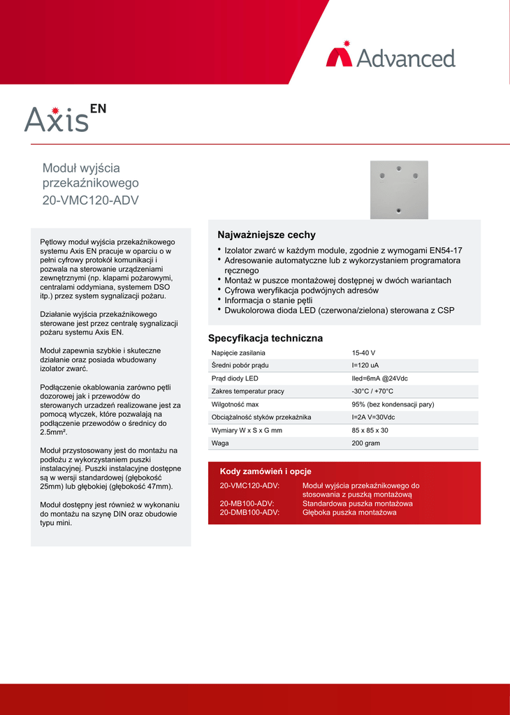 Moduł wyjścia przekaźnikowego 20-VMC120-ADV Pętlowy moduł wyjścia przekaźnikowego systemu Axis EN pracuje w oparciu o w pełni cyfrowy protokół komunikacji i pozwala na sterowanie urządzeniami zewnętrznymi (np. klapami pożarowymi, centralami oddymiana, systemem DSO itp.) przez system sygnalizacji pożaru. Działanie wyjścia przekaźnikowego sterowane jest przez centralę sygnalizacji pożaru systemu Axis EN. Moduł zapewnia szybkie i skuteczne działanie oraz posiada wbudowany izolator zwarć. Podłączenie okablowania zarówno pętli dozorowej jak i przewodów do sterowanych urzadzeń realizowane jest za pomocą wtyczek, które pozwalają na podłączenie przewodów o średnicy do 2.5mm². Moduł przystosowany jest do montażu na podłożu z wykorzystaniem puszki instalacyjnej. Puszki instalacyjne dostępne są w wersji standardowej (głębokość 25mm) lub głębokiej (głębokość 47mm). Moduł dostępny jest również w wykonaniu do montażu na szynę DIN oraz obudowie typu mini. Najważniejsze cechy Izolator zwarć w każdym module, zgodnie z wymogami EN54-17 Adresowanie automatyczne lub z wykorzystaniem programatora ręcznego Montaż w puszce montażowej dostępnej w dwóch wariantach Cyfrowa weryfikacja podwójnych adresów Informacja o stanie pętli Dwukolorowa dioda LED (czerwona/zielona) sterowana z CSP Specyfikacja techniczna Napięcie zasilania 15-40 V Średni pobór prądu I=120 uA Prąd diody LED Iled=6mA @24Vdc Zakres temperatur pracy -30°C / +70°C Wilgotność max 95% (bez kondensacji pary) Obciążalność styków przekaźnika I=2A V=30Vdc Wymiary W x S x G mm 85 x 85 x 30 Waga 200 gram Kody zamówień i opcje 20-VMC120-ADV: 20-MB100-ADV: 20-DMB100-ADV: Moduł wyjścia przekaźnikowego do stosowania z puszką montażową Standardowa puszka montażowa Głęboka puszka montażowa