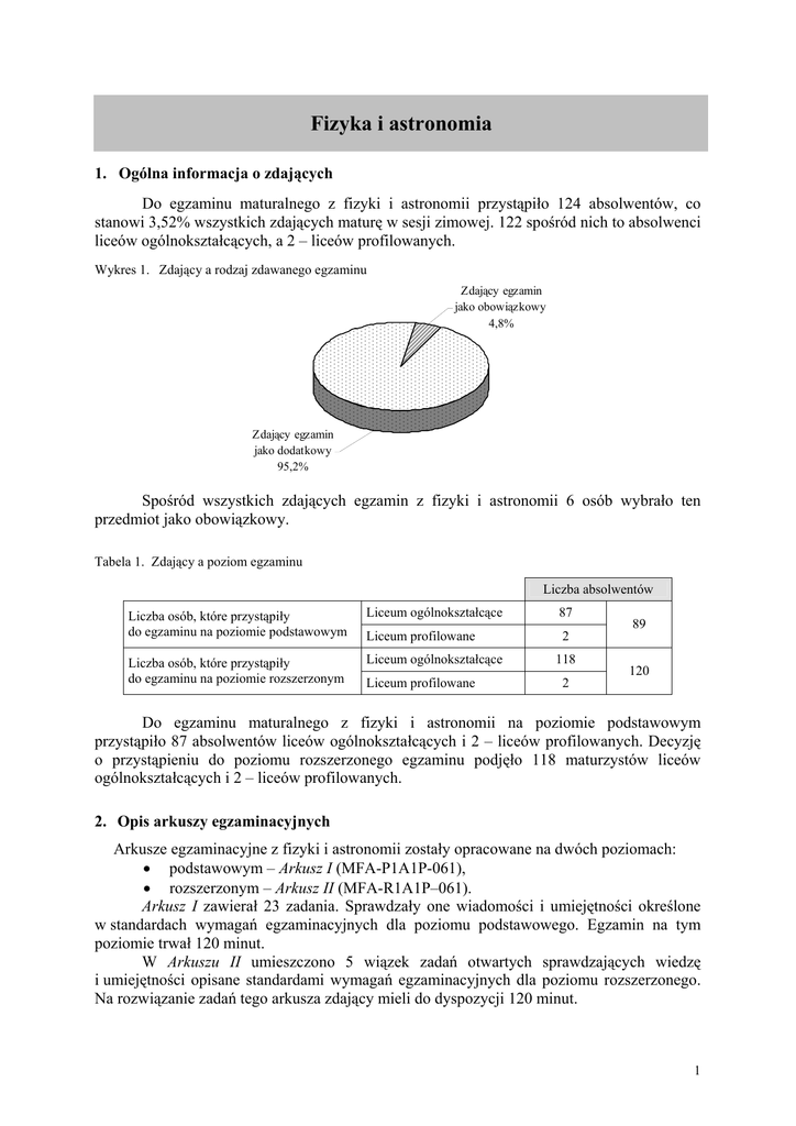Fizyka i astronomia 1. Ogólna informacja o zdających Do egzaminu maturalnego z fizyki i astronomii przystąpiło 124 absolwentów, co stanowi 3,52% wszystkich zdających maturę w sesji zimowej. 122 spośród nich to absolwenci liceów ogólnokształcących, a 2 – liceów profilowanych. Wykres 1. Zdający a rodzaj zdawanego egzaminu Zdający egzamin jako obowiązkowy 4,8% Zdający egzamin jako dodatkowy 95,2% Spośród wszystkich zdających egzamin z fizyki i astronomii 6 osób wybrało ten przedmiot jako obowiązkowy. Tabela 1. Zdający a poziom egzaminu Liczba absolwentów Liczba osób, które przystąpiły do egzaminu na poziomie podstawowym Liczba osób, które przystąpiły do egzaminu na poziomie rozszerzonym Liceum ogólnokształcące 87 Liceum profilowane 2 Liceum ogólnokształcące Liceum profilowane 118 2 89 120 Do egzaminu maturalnego z fizyki i astronomii na poziomie podstawowym przystąpiło 87 absolwentów liceów ogólnokształcących i 2 – liceów profilowanych. Decyzję o przystąpieniu do poziomu rozszerzonego egzaminu podjęło 118 maturzystów liceów ogólnokształcących i 2 – liceów profilowanych. 2. Opis arkuszy egzaminacyjnych Arkusze egzaminacyjne z fizyki i astronomii zostały opracowane na dwóch poziomach: • podstawowym – Arkusz I (MFA-P1A1P-061), • rozszerzonym – Arkusz II (MFA-R1A1P–061). Arkusz I zawierał 23 zadania. Sprawdzały one wiadomości i umiejętności określone w standardach wymagań egzaminacyjnych dla poziomu podstawowego. Egzamin na tym poziomie trwał 120 minut. W Arkuszu II umieszczono 5 wiązek zadań otwartych sprawdzających wiedzę i umiejętności opisane standardami wymagań egzaminacyjnych dla poziomu rozszerzonego. Na rozwiązanie zadań tego arkusza zdający mieli do dyspozycji 120 minut. 1 Zadania w obu arkuszach sprawdzały zarówno znajomość i rozumienie terminów, pojęć, praw, procesów i zjawisk fizycznych, jak i umiejętności: • korzystania z informacji, jej przetwarzania i interpretacji, • dostrzegania związków przyczynowo-skutkowych między podanymi faktami, • wnioskowania na podstawie danych, • argumentowania swojego stanowiska. Zarówno na poziomie podstawowym, jak i rozszerzonym, można było uzyskać po 50 punktów. 3. Wyniki egzaminu Analizujemy wyniki uzyskane przez zdających na poziomie podstawowym (za Arkusz I) i osobno uzyskane na poziomie rozszerzonym (za Arkusz II) niezależnie od tego, czy przedmiot był zdawany jako przedmiot obowiązkowy, czy dodatkowy. Tabela 2. Wyniki egzaminu w skali staninowej 1 Teoretyczny procent zdających 4 2 7 Bardzo niski 14-16 3-7 3 12 Niski 17-20 8-11 4 17 Niżej średni 21-24 12-14 5 20 Średni 25-28 15-19 6 17 Wyżej średni 29-32 20-21 7 12 Wysoki 33-37 22-26 8 7 Bardzo wysoki 38-40 27-32 9 4 Najwyższy 41-46 33-40 Stopień skali Nazwa stanina Poziom podstawowy (0-50 punktów) Poziom rozszerzony (0-50 punktów) Najniższy 6-13 0-2 Dla zdających fizykę i astronomię w sesji zimowej egzamin na poziomie podstawowym okazał się umiarkowanie trudny, natomiast na poziomie rozszerzonym – trudny. Najwyższy wynik na poziomie podstawowym wyniósł 46 punktów (92%), najniższy – 6 (12%). Na poziomie rozszerzonym było to odpowiednio: 40 (80%) i 0 punktów. Aby zdać egzamin maturalny z fizyki i astronomii, należało uzyskać co najmniej 30% punktów możliwych do zdobycia na poziomie podstawowym. Wszyscy zdający ten przedmiot jako obowiązkowy spełnili ten warunek. Tabela 3. Podstawowe wskaźniki statystyczne wyników egzaminu. Poziom podstawowy (0-50 punktów) 27 Poziom rozszerzony (0-50 punktów) 17 Wynik średni (średnia arytmetyczna – M) 26,92 17,57 Wskaźnik łatwości 0,54 0,35 Odchylenie standardowe 8,31 7,80 Wynik środkowy (mediana – Me) 2 Poniższe wykresy przedstawiają rozkłady wyników uzyskanych przez zdających egzamin z fizyki i astronomii. Wykres 2. Rozkład wyników uzyskanych przez zdających na poziomie podstawowym 30% 25,84% 19,10% 20% 15,73% 15,73% 15% 8,99% 8,99% 10% 5% 2,25% 2,25% 1,12% 00 % % -1 9% -8 90 80 % 70 % -7 9% 9% -6 60 % -5 9% 9% 50 % 40 % 30 % -4 -3 9% -2 9% -1 10 % 0% -9 % 0% 9% 0,00% 20 % [Procent piszących] 25% [Procent punktów] Wykres 3. Rozkład wyników uzyskanych przez zdających na poziomie rozszerzonym 30% 24,17% 24,17% [Procent piszących] 25% 20,00% 20% 15% 10,83% 10% 8,33% 5,83% 5,00% 5% 0,83% 0,83% 0,00% 0% -9 % 10 % -1 9% 20 % -2 9% 30 % -3 9% 40 % -4 9% 50 % -5 9% 60 % -6 9% 70 % -7 9% 80 % -8 9% 90 % -1 00 % 0% [Procent punktów] Na poziomie podstawowym trudność zadań była zróżnicowana. Natomiast na poziomie rozszerzonym wszystkie zadania były dla zdających trudne. Tabela 4. Łatwość poszczególnych zadań Wartość wskaźnika 0 – 0,19 Interpretacja Numery zadań 0,20 – 0,49 0,50 – 0,69 umiarkowanie trudne 0,70 – 0,89 0,90 – 1 łatwe bardzo łatwe bardzo trudne trudne Arkusz I 20, 23 3, 6, 12, 14, 16, 17, 21, 22 2, 7, 13, 15, 18 1, 5, 9, 10, 11, 19 4, 8 Arkusz II - 24, 25, 26, 27, 28 - - - 3