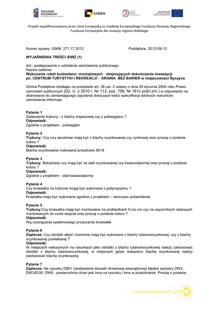 Projekt współfinansowany przez Unię Europejską ze środków Europejskiego Funduszu Rozwoju Regionalnego Fundusze Europejskie dla rozwoju regionu łódzkiego Numer sprawy: IGKM. 271.17.2012 Poddębice, 2012-09-13 WYJAŚNIENIA TREŚCI SIWZ (1) dot.: postępowania o udzielenie zamówienia publicznego. Nazwa zadania: Wykonanie robót budowlano- montażowych obejmujących dokończenie inwestycji pn. CENTRUM TURYSTYKI I REKREACJI - KRAINA BEZ BARIER w miejscowości Byczyna Gmina Poddębice działając na podstawie art. 38 ust. 2 ustawy z dnia 29 stycznia 2004 roku Prawo zamówień publicznych (Dz. U. z 2010 r. Nr 113, poz. 759, Nr 161z późn.zm.) w odpowiedzi na skierowane do zamawiającego zapytania dotyczące treści specyfikacji istotnych warunków zamówienia informuje: Pytanie 1 Zadaszenie trybuny - z blachy trapezowej czy z poliwęglanu ? Odpowiedź: Zgodnie z projektem - poliwęglan Pytanie 2 Trybuny: Czy rury spustowe mają być z blachy ocynkowanej czy cynkowej oraz proszę o podanie koloru ? Odpowiedź: Blacha ocynkowana malowana proszkowo 9018 Pytanie 3 Trybuny: Balustrady czy mają być ze stali ocynkowanej czy kwasoodpornej oraz proszę o podanie koloru ? Odpowiedź: Zgodnie z projektem - stal kwasoodporna Pytanie 4 Czy krzesełka na trybunie mogą być wykonane z polipropylenu ? Odpowiedź: Krzesełka maja być wykonane zgodnie z projektem – tworzywo poliamidowe Pytanie 5 Trybuny:Czy krzesełka mają być montowane na podkładkach 5-cio cm czy na wspornikach stalowych montowanych do czoła stopnia oraz proszę o podanie koloru ? Odpowiedź: Wg rozwiązania systemowego producenta krzesełek Pytanie 6 Zaplecze: Czy obróbki attyki i kominów mają być wykonane z blachy tytanowocynkowej, czy z blachy ocynkowanej powlekanej ? Odpowiedź: W miejscach wskazanych na rysunkach jako obróbki z blachy tytanowocynkowej należy zastosować obróbki z blachy tytanowocynkowej, w miejscach gdzie wskazano blachę ocynkowaną należy zastosować blachę ocynkowaną Pytanie 7 Zaplecze: Na rysunku D801 (zestawienie ślusarki drzwiowej wewnętrznej) błędne wymiary DW2, DW3/EI30, DW6 - powierzchnia drzwi jest inna na rysunku i inna w przedmiarze. Proszę o podanie www.gmina.poddebice.pl Projekt współfinansowany przez Unię Europejską ze środków Europejskiego Funduszu Rozwoju Regionalnego Fundusze Europejskie dla rozwoju regionu łódzkiego poprawnych wymiarów. Odpowiedź: Należy wykonać zgodnie z projektem – przedmiar jest jedynie dokumentem pomocniczym Pytanie 8 Zaplecze: Czy brama garażowa ma być rolowana, czy segmentowa ? Odpowiedź: Zgodnie z projektem – d802 Pytanie 9 Trybuny:- konstrukcja stalowa- profil IPE160 (płatwie) są za długie na malowanie proszkowe, czy istnieje możliwość łączenia na ramie głównej (w połowie długości płatwi). Jeżeli nie ma możliwości takiego łączenia czy można zastosować malowanie np. epoksydowe czy też poliuretanowe ? Odpowiedź: Łączenie jest możliwe tylko w wypadku zapewnienia tych samych parametrów technicznych Pytanie 10 Trybuny- słupy stalowe z rur - czy jest możliwość sztukowania ze względu na zbyt duży odpad? Odpowiedź: Zgodnie ze sztuką budowlaną Pytanie 11 Budynek zaplecza- proszę podać z jakiego materiału wykonać pokrycie rampy. Brak jakiejkolwiek informacji na ten temat w dokumentacji. Odpowiedź: Projekt nie przewiduje wykonania rampy Pytanie 12 Budynek zaplecza - na rysunku D.803 okno 01 .przyjęto jako przeciwogniowe lecz w takim systemie okno nie może być uchylne i szyba przyjęta na rysunku nie spełnia warunków ogniowych. Proszę o wyjaśnienie: Odpowiedź: Projekt w takim zakresie posiada uzgodnienie z wymaganiami ochrony przeciwpożarowej. Pytanie 13 Zamieszczone na stronie załączniki do SIWZ od nr 7-18 nie dają się odczytać, proszę o zamieszczenie ich jeszcze raz w plikach pozwalających wszystkim oferentom przygotować wyceny właściwego zakresu prac. Odpowiedź. Ponownie zostały zamieszczone załączniki do SIWZ w dniu 12.09.2012 r. Pytanie 14 Ponieważ czas ucieka i będzie za późno na zadawanie pytań, proszę o przesunięcie terminu składania ofert. Odpowiedź. Termin składania ofert został przesunięty na 01.10.2012 r.. W związku z tym Zamawiający dokonał zmiany treści ogłoszenia i zmiany treści SIWZ. Zamawiający informuje, że pytania oraz odpowiedzi stają się integralną częścią specyfikacji istotnych warunków zamówienia i będą wiążące przy składaniu ofert. Burmistrz Poddębic (-) Piotr Sęczkowski www.gmina.poddebice.pl