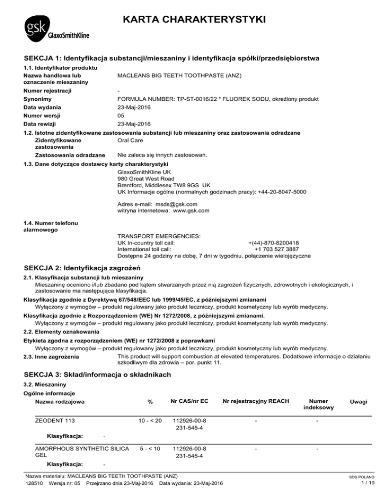 KARTA CHARAKTERYSTYKI SEKCJA 1: Identyfikacja substancji/mieszaniny i identyfikacja spółki/przedsiębiorstwa 1.1. Identyfikator produktu Nazwa handlowa lub oznaczenie mieszaniny MACLEANS BIG TEETH TOOTHPASTE (ANZ) Numer rejestracji - Synonimy FORMULA NUMBER: TP-ST-0016/22 * FLUOREK SODU, okreżlony produkt Data wydania 23-Maj-2016 Numer wersji 05 Data rewizji 23-Maj-2016 1.2. Istotne zidentyfikowane zastosowania substancji lub mieszaniny oraz zastosowania odradzane Oral Care Zidentyfikowane zastosowania Zastosowania odradzane Nie zaleca się innych zastosowań. 1.3. Dane dotyczące dostawcy karty charakterystyki GlaxoSmithKline UK 980 Great West Road Brentford, Middlesex TW8 9GS UK UK Informacje ogólne (normalnych godzinach pracy): +44-20-8047-5000 Adres e-mail: [email protected] witryna internetowa: www.gsk.com 1.4. Numer telefonu alarmowego TRANSPORT EMERGENCIES: UK In-country toll call: +(44)-870-8200418 International toll call: +1 703 527 3887 Dostępne 24 godziny na dobę, 7 dni w tygodniu, połączenie wielojęzyczne SEKCJA 2: Identyfikacja zagrożeń 2.1. Klasyfikacja substancji lub mieszaniny Mieszaninę oceniono i/lub zbadano pod kątem stwarzanych przez nią zagrożeń fizycznych, zdrowotnych i ekologicznych, i zastosowanie ma następująca klasyfikacja. Klasyfikacja zgodnie z Dyrektywą 67/548/EEC lub 1999/45/EC, z późniejszymi zmianami Wyłączony z wymogów – produkt regulowany jako produkt leczniczy, produkt kosmetyczny lub wyrób medyczny. Klasyfikacja zgodnie z Rozporządzeniem (WE) Nr 1272/2008, z późniejszymi zmianami. Wyłączony z wymogów – produkt regulowany jako produkt leczniczy, produkt kosmetyczny lub wyrób medyczny. 2.2. Elementy oznakowania Etykieta zgodna z rozporządzeniem (WE) nr 1272/2008 z poprawkami Wyłączony z wymogów – produkt regulowany jako produkt leczniczy, produkt kosmetyczny lub wyrób medyczny. This product will support combustion at elevated temperatures. Dodatkowe informacje o działaniu 2.3. Inne zagrożenia szkodliwym dla zdrowia – por. punkt 11. SEKCJA 3: Skład/informacja o składnikach 3.2. Mieszaniny Ogólne informacje Nazwa rodzajowa ZEODENT 113 Klasyfikacja: Nr CAS/nr EC Nr rejestracyjny REACH Numer indeksowy 10 - < 20 112926-00-8 231-545-4 - - 5 - < 10 112926-00-8 231-545-4 - - Uwagi - AMORPHOUS SYNTHETIC SILICA GEL Klasyfikacja: % - Nazwa materiału: MACLEANS BIG TEETH TOOTHPASTE (ANZ) 128510 Wersja nr: 05 Przejrzano dnia 23-Maj-2016 Data wydania: 23-Maj-2016 SDS POLAND 1 / 10 Nazwa rodzajowa GLICEROL Klasyfikacja: 3-<5 56-81-5 200-289-5 - - 1-<3 9004-82-4 - - - Uwagi <1 13463-67-7 236-675-5 - - <1 11138-66-2 234-394-2 - - 0,31 7681-49-4 231-667-8 - 009-004-00-7 - FLUOREK SODU Klasyfikacja: Numer indeksowy Carc. 2;H351 Guma ksantanowa Klasyfikacja: Nr rejestracyjny REACH Acute Tox. 4;H302, Eye Irrit. 2;H319, Aquatic Chronic 3;H412 DITLENKU TYTANU Klasyfikacja: Nr CAS/nr EC - SODIUM LAURETH SULFATE Klasyfikacja: % # Acute Tox. 3;H301, Skin Irrit. 2;H315, Eye Irrit. 2;H319 60 - < 70 Inne składniki poniżej poziomu wymagającego podania składu. Lista skrótów i symboli, które mogą zostać użyte powyżej #: Substancji przyznano unijny(e) limit(y) narażenia w miejscu pracy. M: współczynnik M PBT: trwa³a, bioakumulatywna i toksyczna substancja. vPvB: bardzo trwa³a i bardzo biokumulatywna substancja. Pełny tekst wszystkich zwrotów wskazujących rodzaj zagrożenia zamieszczono w sekcji 16. Komentarze o składzie SEKCJA 4: Środki pierwszej pomocy Ogólne informacje W razie wypadku lub złego samopoczucia zasięgnąć natychmiast porady lekarza (w miarę możliwości pokazać etykietę). Zapewnić powiadomienie personelu medycznego o materiale (materiałach) którego dotyczy przypadek, aby umożliwić im podjęcie odpowiednich żrodków ostrożnożci dla zapewnienia własnego bezpieczeństwa. 4.1. Opis środków pierwszej pomocy Wyprowadzić lub wynieść na świeże powietrze. W przypadku wystąpienia trudności z Droga oddechowa oddychaniem, przeszkolony personel powinien podać tlen. Jeżli objawy wystąpią lub będą się utrzymywać należy wezwać lekarza. W normalnych warunkach użytkowania zgodnego z przeznaczeniem substancja ta nie powinna stanowić zagrożenia dla układu oddechowego. Natychmiast przepłukać skórę dużą ilością wody. Zanieczyszczoną odzież zdjąć i wyprać przed Kontakt ze skórą ponownym użyciem. Jeśli wystąpią objawy, zapewnić pomoc medyczną. Przemywać dokładnie dużą ilością wody przynajmniej przez 15 minut i skonsultować się z Kontakt z oczami lekarzem. W przypadku połknięcia wypłukać usta wodą — nigdy nie stosować u osób nieprzytomnych. W Spożycie razie połknięcia większej ilości niezwłocznie wezwać Ośrodek Kontroli Zatruć. Nie wywoływać wymiotów bez konsultacji z Ośrodkiem Kontroli Zatruć. Bezpośredni kontakt z oczami może spowodować ich podrażnienie. 4.2. Najważniejsze ostre i opóźnione objawy oraz skutki narażenia 4.3. Wskazania dotyczące wszelkiej natychmiastowej pomocy lekarskiej i szczególnego postępowania z poszkodowanym Nie są zalecane żadne szczególne antidota. Traktować zgodnie z przyjętymi lokalnie protokołami. Po dodatkowe wytyczne, patrz bieżące informacje lub lokalne centrum informacyjne o zatruciach. SEKCJA 5: Postępowanie w przypadku pożaru Ogólne zagrożenia pożarowe This product will support combustion at elevated temperatures. 5.1. Środki gaśnicze Odpowiednie środki gaśnicze Woda. Piana. Proszki gaśnicze. Dwutlenek węgla (CO2) . Nazwa materiału: MACLEANS BIG TEETH TOOTHPASTE (ANZ) 128510 Wersja nr: 05 Przejrzano dnia 23-Maj-2016 Data wydania: 23-Maj-2016 SDS POLAND 2 / 10 Niewłaściwe środki gaśnicze 5.2. Szczególne zagrożenia związane z substancją lub mieszaniną Nie ustalono. Wskutek pożaru mogą wydzielać się gazy stanowiące zagrożenie dla zdrowia. 5.3 Informacje dla straży pożarnej Specjalny sprzęt ochronny W razie pożaru stosować urządzenia oddechowe z własnym o