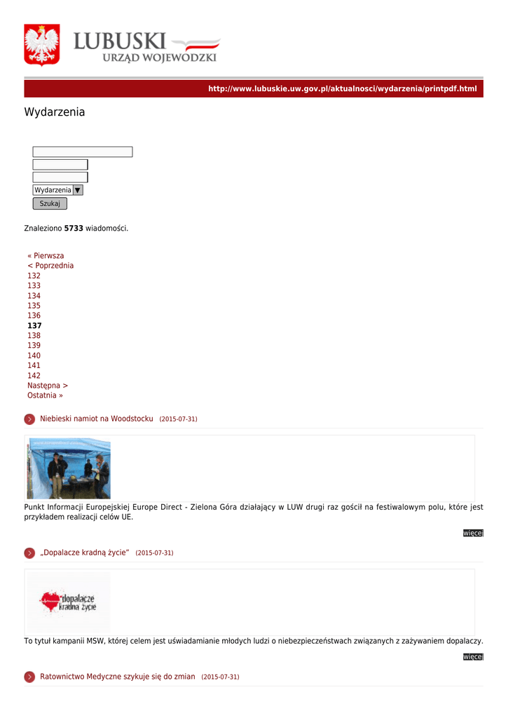 http://www.lubuskie.uw.gov.pl/aktualnosci/wydarzenia/printpdf.html Wydarzenia Wydarzenia ▼ Szukaj Znaleziono 5733 wiadomości. « Pierwsza < Poprzednia 132 133 134 135 136 137 138 139 140 141 142 Następna > Ostatnia » Niebieski namiot na Woodstocku (2015-07-31) Punkt Informacji Europejskiej Europe Direct - Zielona Góra działający w LUW drugi raz gościł na festiwalowym polu, które jest przykładem realizacji celów UE. więcej „Dopalacze kradną życie” (2015-07-31) To tytuł kampanii MSW, której celem jest uświadamianie młodych ludzi o niebezpieczeństwach związanych z zażywaniem dopalaczy. więcej Ratownictwo Medyczne szykuje się do zmian (2015-07-31) W Lubuskim Urzędzie Wojewódzkim odbyło się szkolenie dla przyszłych użytkowników Systemu Wspomagania Dowodzenia Państwowego Ratownictwa Medycznego. Kolejne zaplanowano w przyszłym tygodniu. więcej 21. Przystanek Woodstock w Kostrzynie nad Odrą (2015-07-30) Sygnał rozpoczynający 21. Festiwal Przystanek Woodstock w Kostrzynie nad Odrą, jak co roku dał emerytowany zawiadowca Roman Polański. Imprezę rozpoczęła również konferencja prasowa Jurka Owsiaka i rzecznika fundacji Krzysztofa Dobiesa z udziałem zaproszonych gości, do których należała Wojewoda Lubuski Katarzyna Osos. więcej Niech będzie bezpiecznie (2015-07-30) Bezpieczeństwo uczestników Przystanku Woodstock – największej imprezy w Polsce było tematem rozmowy Wojewody Lubuskiego Katarzyny Osos z red. Jackiem Stefanowiczem na antenie Radia Zachód. więcej TVP Gorzów Wlkp. ma już 10 lat (2015-07-30) Wojewoda Lubuski Katarzyna Osos złożyła życzenia pracownikom TVP Gorzów Wlkp. Telewizja obchodziła urodziny w czasie Przystanku Woodstock w Kostrzynie nad Odrą. więcej Bezpieczeństwo priorytetem służb (2015-07-30) Wojewoda Lubuski Katarzyna Osos przyjęła meldunek o gotowości do Przystanku Woodstock złożony przez służby odpowiedzialne w regionie za bezpieczeństwo. więcej Jest Pakt Społeczny przeciwko dopalaczom (2015-07-30) Ruszyła akcja „Dopalacze kradną życie”. W inicjatywę włączyli się m.in. Marcin Gortat, Jerzy Owsiak, harcerze oraz przedstawiciele organizacji pozarządowych i mediów. więcej „Turystyka bez ryzyka” i „Bezpieczna woda” (2015-07-30) Minister Sportu i Turystyki Adam Korol zachęca do zainteresowania akcjami „Turystyka bez ryzyka” oraz „Bezpieczna woda”. więcej Dopracowanie ostatnich szczegółów działań na rzecz bezpieczeństwa (2015-07-29) W środę, 29 lipca 2015 r. Wojewoda Lubuski Katarzyna Osos oraz przedstawiciele służb odpowiedzialnych za bezpieczeństwo omawiali ostatnie szczegóły zabezpieczeń największego przedsięwzięcia w regionie i kraju. więcej « Pierwsza < Poprzednia 132 133 134 135 136 137 138 139 140 141 142 Następna > Ostatnia »