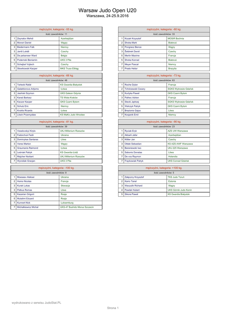 Warsaw Judo Open U20 Warszawa, 24-25.9.2016 mężczyźni, kategoria: -55 kg. mężczyźni, kategoria: -60 kg. ilość zawodników: 11 ilość zawodników: 33 1 Zeynalov Mehdi Azerbejdżan 1 Kozak Krzysztof MOSiR Bochnia 2 Monori Daniel Węgry 2 Shoka Mark Białoruś 3 Biedermann Falk Niemcy 3 Pongracz Bence Węgry 3 Janiš Lukáš Czechy 3 Šatánek David Czechy 5 De pelseneer Ward Belgia 5 Merlin Maxime Francja 5 Podemski Beniamin UKS 3 Piła 5 Shoka Konrad Białoruś 7 Schejbal Vojtech Czechy 7 Meyer Pascal Niemcy 7 Słowikowski Kacper MKS Truso Elbląg 7 Prado Heitor Brazylia mężczyźni, kategoria: -66 kg. mężczyźni, kategoria: -73 kg. ilość zawodników: 48 ilość zawodników: 63 1 Terlecki Rafał KS Gwardia Białystok 1 Roche Dylan Francja 2 Galaktionovs Artjoms Łotwa 2 Tchórzewski Cezary SGKS Wybrzeże Gdańsk 3 Jasiński Szymon UKS Galeon Gdynia 3 Kurtyka Paweł GKS Czarni Bytom 3 Karaś Bartosz TS Wisła Kraków 3 Palhec Adrien Francja 5 Kaczor Kacper GKS Czarni Bytom 5 Stecki Jędrzej SGKS Wybrzeże Gdańsk 5 Schulz Eric Niemcy 5 Walczyk Patryk GKS Czarni Bytom 7 Kruklis Ricards Łotwa 7 Brazionis Gajus Litwa 7 Litwin Przemysław KS MaKo Judo Wrocław 7 Kosjanik Emil Niemcy mężczyźni, kategoria: -81 kg. mężczyźni, kategoria: -90 kg. ilość zawodników: 39 ilość zawodników: 23 1 Veselovskyi Kirylo UKJ Millenium Rzeszów 1 Ryciak Eryk AZS UW Warszawa 2 Fedorchuk Fedir Ukraina 2 Akbarli Jafar Azerbejdżan 3 Dominykas Santaras Litwa 3 Kittler Jan Czechy 3 Veres Marton Węgry 3 Ołdak Sebastian KS AZS AWF Warszawa 5 Graumanis Raimond Łotwa 5 Baraniewski Iwo UKJ 225 Warszawa 5 Leśniak Patryk KS Gwardia Łódź 5 Sabonis Donatas Litwa 7 Majcher Norbert UKJ Millenium Rzeszów 7 De vos Raymon Holandia 7 Wyroślak Gracjan UKS 3 Piła 7 Frąckowiak Patryk UKS Conrad Gdańsk mężczyźni, kategoria: -100 kg. mężczyźni, kategoria: +100 kg. ilość zawodników: 8 ilość zawodników: 5 1 Moeseev Aleksei Ukraina 1 Załęczny Krzysztof TKS Judo Toruń 2 Homo Nicolas Francja 2 Karro Tanel Estonia 3 Kurak Lukas Słowacja 3 Waczulik Richard Węgry 3 Petkus Romas Litwa 4 Pawlak Hubert UKS Górnik Judo Konin 5 Kazarian Grigorii Rosja 5 Sikora Paweł KS Gwardia Białystok 5 Mutalimi Eduard Rosja 7 Kunnert Nick Luksemburg 7 Michałkiewicz Michał UKS-47 Bushido Morus Szczecin wydrukowano z serwisu JudoStat.PL Strona 1 Warsaw Judo Open U20 Warszawa, 24-25.9.2016 kobiety, kategoria: -44 kg. kobiety, kategoria: -48 kg. ilość zawodników: 4 ilość zawodników: 10 1 Szlachta Nikola UKS Judo Wolbrom 1 Gussenberg Jana Niemcy 2 Polkowska Aleksandra UKS Judo Kontra Mińsk Mazowiecki 2 Majcher Danuta TS Wisła Kraków 3 Tracz Małgorzata UKS Judo Wolbrom 3 Murasko Viktorija Litwa 4 Brągiel Oliwia UKS ASW-Judo Jasło 3 Kuraś Marta UKS Judo Wolbrom 5 De poorter Aaike Belgia 5 Ziehe Pia Niemcy 7 Knysheuskaya Valiantsina Białoruś 7 Surhaeva Viktoria Rosja kobiety, kategoria: -52 kg. kobiety, kategoria: -57 kg. ilość zawodników: 19 ilość zawodników: 20 1 Kaleta Aleksandra UKS Judo Wolbrom 1 Zachová Renata 2 Cieślik Klaudia UKS Judo Wolbrom 2 Franco, Izabela Brazylia 3 Santini Giulia Włochy 3 Butlewska Aleksandra SGKS Wybrzeże Gdańsk 3 Terenzi Franciele Brazylia 3 Souza, Sandy Brazylia 5 Kincelova Dominika Słowacja 5 Eveline Delbaen Belgia 5 Mazur Aleksandra UKS Tomita Elbląg 5 Janeczko Joanna KS AZS AWF Warszawa 7 Karman Andrea Węgry 7 Anita Somers Holandia 7 Kuna Justyna UKS Akademia Judo Rzeszów 7 Mróz Dominika UKS Drako 79 Warszawa kobiety, kategoria: -63 kg. Czechy kobiety, kategoria: -70 kg. ilość zawodników: 28 ilość zawodników: 10 1 Dudek Alicja SGKS Wybrzeże Gdańsk 1 Wróblewska Eliza KS Akademia Judo Poznań 2 Zemanová Věra Czechy 2 Bastian Lea Niemcy 3 Lewandowska Alicja KŚ AZS Gliwice 3 Brendicke Sophie Niemcy 3 Minenkova Ulyana Białoruś 3 Kabata Klaudia GKS Czarni Bytom 5 Kasza Katarzyna AZS UW Warszawa 5 Licznerska Nel BKS Judo Bydgoszcz 5 Tomczak Wiktoria MKS Olimpijczyk Włocławek 5 Marciniak Wiktoria GKS Czarni Bytom 7 Maekelberg Anouk Belgia 7 Novikava Viktoryia Białoruś 7 Selina Delen Belgia 7 Wojtelewicz Patrycja UKJ 225 Warszawa kobiety, kategoria: -78 kg. kobiety, kategoria: +78 kg. ilość zawodników: 13 ilość zawodników: 6 1 Delahaie Laurine Francja 1 Świątkiewicz Julia UKJ Lemur Warszawa 2 Dudenaite Migle julija Litwa 2 Lis Wiktoria KS Budowlani Sosnowiec 3 Dziopa Paulina GKS Czarni Bytom 3 Księżyk Julia Pałac Młodzieży Katowice 3 Van harselaar Renee Holandia 3 Madajewska Katarzyna KS AZS AWFiS Gdańsk 5 Saukel Diana Holandia 5 Cernikova Darja Łotwa 5 Woźniak Oliwia GKS Czarni Bytom 5 Mohorič Veronika Słowacja 7 Kröger Cara Niemcy 7 Pękala Natalia PTS Janosik Bielsko-Biała wydrukowano z serwisu JudoStat.PL Strona 2