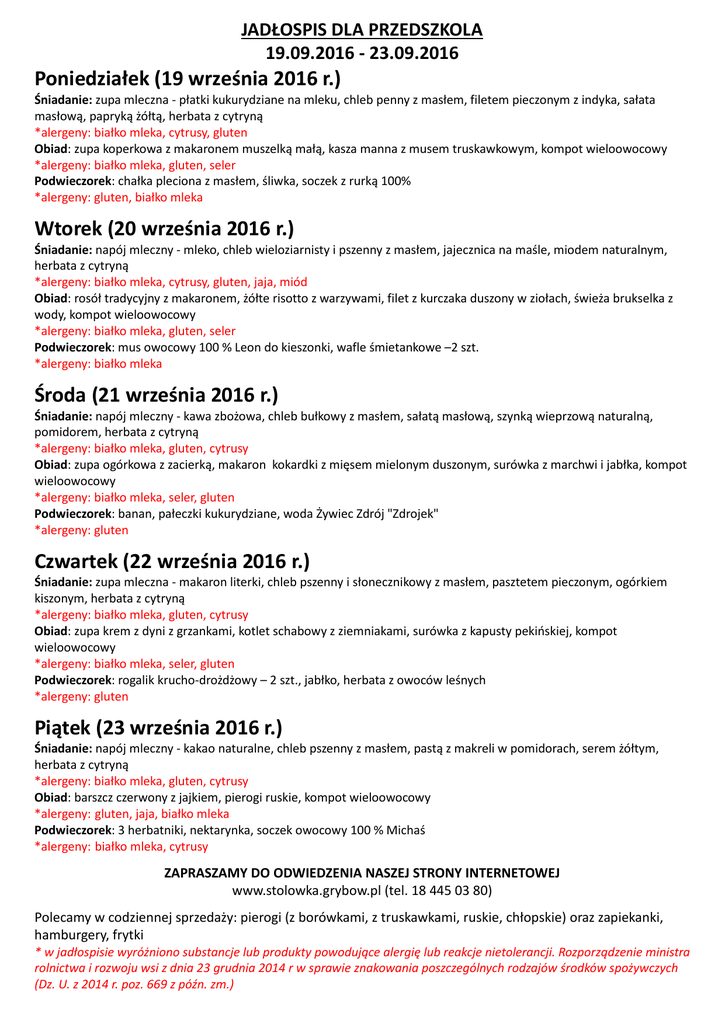JADŁOSPIS DLA PRZEDSZKOLA 19.09.2016 - 23.09.2016 Poniedziałek (19 września 2016 r.) Śniadanie: zupa mleczna - płatki kukurydziane na mleku, chleb penny z masłem, filetem pieczonym z indyka, sałata masłową, papryką żółtą, herbata z cytryną *alergeny: białko mleka, cytrusy, gluten Obiad: zupa koperkowa z makaronem muszelką małą, kasza manna z musem truskawkowym, kompot wieloowocowy *alergeny: białko mleka, gluten, seler Podwieczorek: chałka pleciona z masłem, śliwka, soczek z rurką 100% *alergeny: gluten, białko mleka Wtorek (20 września 2016 r.) Śniadanie: napój mleczny - mleko, chleb wieloziarnisty i pszenny z masłem, jajecznica na maśle, miodem naturalnym, herbata z cytryną *alergeny: białko mleka, cytrusy, gluten, jaja, miód Obiad: rosół tradycyjny z makaronem, żółte risotto z warzywami, filet z kurczaka duszony w ziołach, świeża brukselka z wody, kompot wieloowocowy *alergeny: białko mleka, gluten, seler Podwieczorek: mus owocowy 100 % Leon do kieszonki, wafle śmietankowe –2 szt. *alergeny: białko mleka Środa (21 września 2016 r.) Śniadanie: napój mleczny - kawa zbożowa, chleb bułkowy z masłem, sałatą masłową, szynką wieprzową naturalną, pomidorem, herbata z cytryną *alergeny: białko mleka, gluten, cytrusy Obiad: zupa ogórkowa z zacierką, makaron kokardki z mięsem mielonym duszonym, surówka z marchwi i jabłka, kompot wieloowocowy *alergeny: białko mleka, seler, gluten Podwieczorek: banan, pałeczki kukurydziane, woda Żywiec Zdrój "Zdrojek" *alergeny: gluten Czwartek (22 września 2016 r.) Śniadanie: zupa mleczna - makaron literki, chleb pszenny i słonecznikowy z masłem, pasztetem pieczonym, ogórkiem kiszonym, herbata z cytryną *alergeny: białko mleka, gluten, cytrusy Obiad: zupa krem z dyni z grzankami, kotlet schabowy z ziemniakami, surówka z kapusty pekińskiej, kompot wieloowocowy *alergeny: białko mleka, seler, gluten Podwieczorek: rogalik krucho-drożdżowy – 2 szt., jabłko, herbata z owoców leśnych *alergeny: gluten Piątek (23 września 2016 r.) Śniadanie: napój mleczny - kakao naturalne, chleb pszenny z masłem, pastą z makreli w pomidorach, serem żółtym, herbata z cytryną *alergeny: białko mleka, gluten, cytrusy Obiad: barszcz czerwony z jajkiem, pierogi ruskie, kompot wieloowocowy *alergeny: gluten, jaja, białko mleka Podwieczorek: 3 herbatniki, nektarynka, soczek owocowy 100 % Michaś *alergeny: białko mleka, cytrusy ZAPRASZAMY DO ODWIEDZENIA NASZEJ STRONY INTERNETOWEJ www.stolowka.grybow.pl (tel. 18 445 03 80) Polecamy w codziennej sprzedaży: pierogi (z borówkami, z truskawkami, ruskie, chłopskie) oraz zapiekanki, hamburgery, frytki * w jadłospisie wyróżniono substancje lub produkty powodujące alergię lub reakcje nietolerancji. Rozporządzenie ministra rolnictwa i rozwoju wsi z dnia 23 grudnia 2014 r w sprawie znakowania poszczególnych rodzajów środków spożywczych (Dz. U. z 2014 r. poz. 669 z późn. zm.)