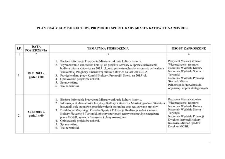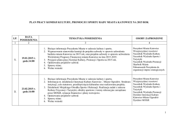 PLAN PRACY KOMISJI KULTURY, PROMOCJI I SPORTU RADY MIASTA KATOWICE NA 2015 ROK LP. 1 1. 2. DATA POSIEDZENIA 2 19.01.2015 r. godz.14:00 23.02.2015 r. godz.14:00 TEMATYKA POSIEDZENIA OSOBY ZAPROSZONE 3 4 1. Bieżące informacje Prezydenta Miasta w zakresie kultury i sportu. 2. Wypracowanie stanowiska komisji do projektu uchwały w sprawie uchwalenia budżetu miasta Katowice na 2015 rok, oraz projektu uchwały w sprawie uchwalenia Wieloletniej Prognozy Finansowej miasta Katowice na lata 2015-2035. 3. Przyjęcie planu pracy Komisji Kultury, Promocji i Sportu na 2015 rok. 4. Opiniowanie projektów uchwał. 5. Sprawy różne. 6. Wolne wnioski Prezydent Miasta Katowice Wiceprezydenci resortowi Naczelnik Wydziału Kultury Naczelnik Wydziału Sportu i Turystyki Naczelnik Wydziału Promocji Skarbnik Miasta Pełnomocnik Prezydenta ds. organizacji imprez strategicznych. 1. Bieżące informacje Prezydenta Miasta w zakresie kultury i sportu. 2. Informacja nt. działalności Instytucji Kultury Katowice - Miasto Ogrodów. Struktura instytucji, cele statutowe, przedsięwzięcia kulturalne oraz realizowane projekty. 3. Działalność Miejskiego Ośrodka Sportu i Rekreacji. Realizacja zadań z zakresu Kultury Fizycznej i Turystyki, obiekty sportowe i tereny rekreacyjne zarządzane przez MOSiR, sytuacja finansowa i plany rozwojowe. 4. Opiniowanie projektów uchwał. 5. Sprawy różne. 6. Wolne wnioski Prezydent Miasta Katowice Wiceprezydenci resortowi Naczelnik Wydziału Kultury Naczelnik Wydziału Sportu i Turystyki Naczelnik Wydziału Promocji Dyrektor Instytucji Kultury Katowice-Miasto Ogrodów Dyrektor MOSiR 1 3. 4. 5. 23.03.2015 r. godz. 14:00 20.04.2015 r. godz. 14:00 18.05.2015 r. wyjazd 1. Bieżące informacje Prezydenta Miasta w zakresie kultury i sportu. 2. Narodowa Orkiestra Symfoniczna Polskiego Radia – działalność koncertowa i edukacyjna, rola w promowaniu miasta Katowice. Muzeum Śląskie – działalność statutowa (wystawy stałe i czasowe, edukacja, zbiory), zagospodarowanie nowego obiektu i plany na przyszłość. 3. Informacje na temat stanu realizacji inwestycji w „Strefie Kultury”. Plany na przyszłość ( nowe obiekty, infrastruktura komunikacyjna, zieleń urządzona) 4. Opiniowanie projektów uchwał. 5. Sprawy różne. 6. Wolne wnioski Prezydent Miasta Katowice Wiceprezydenci resortowi Naczelnik Wydziału Kultury Naczelnik Wydziału Sportu i Turystyki Naczelnik Wydziału Promocji Dyrektor NOSPR Dyrektor Muzeum Śląskiego 1. Bieżące informacje Prezydenta Miasta w zakresie kultury i sportu. 2. Promocja zewnętrzna i wewnętrzna miasta i jej skuteczność, instrumenty pomiaru skuteczności i ich wykorzystanie przez Wydział Promocji Urzędu Miasta. 3. Program „Lokal na Kulturę” – dotychczasowe wyniki, perspektywy kontynuacji i rozwoju. 4. Opiniowanie projektów uchwał. 5. Sprawy różne. 6. Wolne wnioski Prezydent Miasta Katowice Wiceprezydent resortowy Naczelnik Wydziału Kultury Naczelnik Wydziału Sportu i Turystyki Naczelnik Wydziału Promocji 1. Bieżące informacje Prezydenta Miasta w zakresie kultury i sportu. 2. Analiza i opiniowanie sprawozdania z wykonania budżetu miasta Katowice oraz sprawozdania z wykonania programu zadań społecznych i gospodarczych w Katowicach za 2014 rok. 3. Wizyta w AWF w Katowicach. Współpraca z miastem, nowe inwestycje. 4. Informacja na temat stanu zorganizowania sportu amatorskiego, kwalifikowanego oraz szkolnego w mieście. 5. Opiniowanie projektów uchwał. 6. Sprawy różne. 7. Wolne wnioski Prezydent Miasta Katowice Wiceprezydenci resortowi Naczelnik Wydziału Kultury Naczelnik Wydziału Sportu i Turystyki Naczelnik Wydziału Promocji Rektor AWF Przedstawiciele organizacji sportowych z Katowic. 2 6. 7. 8. 15.06.2015 r. wyjazd 20.07.2015 r. godz.14:00 24.08.2015 r. godz.14:00 1. Bieżące informacje Prezydenta Miasta w zakresie kultury i sportu. 2. Przygotowanie do akcji „Lato w mieście” 3. Dolina Trzech Stawów – centrum rekreacji i sportu – koncepcja zagospodarowania i rozwoju. Istniejące obiekty i propozycje nowych instalacji do uprawiania sportu i turystyki (ścieżki biegowe, tor do bike cross’u, wakepark, przystań wodna) 4. Przygotowania do festiwali: „OFF Festival” i „Tauron Nowa Muzyka”. 5. Opiniowanie projektów uchwał. 6. Sprawy różne. 7. Wolne wnioski Prezydent Miasta Katowice Wiceprezydenci resortowi Naczelnik Wydziału Kultury Naczelnik Wydziału Sportu i Turystyki Naczelnik Wydziału Promocji Pełnomocnik Prezydenta ds. organizacji imprez strategicznych. 1. Bieżące informacje Prezydenta Miasta w zakresie kultury i sportu. 2. Bieżąca sytuacja klubu piłkarskiego GKS GieKSa Katowice S.A. (Plany rozwojowe i cele na najbliższy sezon, sytuacja ekonomiczno – biznesowa) 3. Realizacja projektu nieodpłatnego dostępu do infrastruktury i zasobów miejskich domów kultury i miejskich obiektów sportowych dla katowickich stowarzyszeń w ramach realizacji zadań statutowych. 4. Opiniowanie projektów uchwał. 5. Sprawy różne. 6. Wolne wnioski Prezydent Miasta Katowice Wiceprezydenci resortowi Naczelnik Wydziału Kultury Naczelnik Wydziału Sportu i Turystyki Naczelnik Wydziału Promocji Prezes Zarządu GKS GieKSa Katowice S.A. 1. Bieżące informacje Prezydenta Miasta w zakresie kultury i sportu. 2. Przygotowania do obchodów 150-lecia nadania praw miejskich miastu Katowice 3. Działalność Pałacu Młodzieży (działalność dydaktyczna i wychowawcza, zajęcia pozaszkolne – dostępność i rodzaje, plany rozwojowe placówki na przyszłość.) 4. Przedłożenie propozycji do projektu budżetu miasta Katowice na 2014 rok. 5. Opiniowanie projektów uchwał. 6. Sprawy różne. 7. Wolne wnioski Prezydent Miasta Katowice Wiceprezydenci resortowi Naczelnik Wydziału Kultury Naczelnik Wydziału Sportu i Turystyki Naczelnik Wydziału Promocji Dyrektor Pałacu Młodzieży 3 9. 10. 11. 14.09.2015 r. godz.14:00 19.10.2015 r. godz. 14:00 16.11.2015 r. godz. 14:00 1. Bieżące informacje Prezydenta