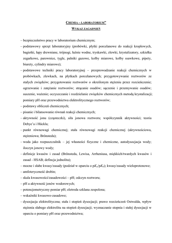 CHEMIA – LABORATORIUM” WYKAZ ZAGADNIEŃ – bezpieczeństwo pracy w laboratorium chemicznym; – podstawowy sprzęt laboratoryjny (probówki, płytki porcelanowe do reakcji kroplowych, bagietki, łapy drewniane, trójnogi, łaźnie wodne, tryskawki, zlewki, krystalizatory, szkiełka zegarkowe, parownice, tygle, palniki gazowe, kolby miarowe, kolby ssawkowe, pipety, biurety, cylindry miarowe); – podstawowe techniki pracy laboratoryjnej – przeprowadzanie reakcji chemicznych w probówkach, zlewkach, na płytkach porcelanowych; przygotowywanie roztworów ze stałych związków; przygotowanie roztworów o określonym stężeniu przez rozcieńczenie; ogrzewanie i zatężanie roztworów; strącanie osadów; sączenie i przemywanie osadów; suszenie, ważenie; oczyszczanie i rozdzielanie związków chemicznych metodą krystalizacji; pomiary pH oraz przewodnictwa elektrolitycznego roztworów; – podstawy obliczeń chemicznych; – pisanie i bilansowanie równań reakcji chemicznych; – aktywność jonu (cząsteczki), siła jonowa roztworu; współczynnik aktywności; teoria Debye’a i Hückla; – punkt równowagi chemicznej; stała równowagi reakcji chemicznej (aktywnościowa, stężeniowa; Brönsteda); – woda jako rozpuszczalnik – jej własności fizyczne i chemiczne, autodysocjacja wody; iloczyn jonowy wody; – definicje kwasów i zasad (Brönsteda, Lewisa, Arrheniusa, miękkich/twardych kwasów i zasad - HSAB; defincja jednolita); – mocne i słabe kwasy/zasady (podział w oparciu o pKa/pKb); kwasy/zasady wieloprotonowe; – amfoteryczność drobin; – skala kwasowości/zasadowości – pH; odczyn roztworu; – pH a aktywność jonów wodorowych; – potencjometryczny pomiar pH; eletroda szklana zespolona; – wskaźniki kwasowo-zasadowe; – dysocjacja elektrolityczna; stała i stopień dysocjacji; prawo rozcieńczeń Ostwalda, wpływ stężenia słabego elektrolitu na stopień dysocjacji; wyznaczanie stopnia i stałej dysocjacji w oparciu o pomiary pH oraz przewodnictwa; – właściwości roztworów buforowych; wpływu rozcieńczenia buforu na pH; hydrolizy drobin w roztworach wodnych oraz wpływu różnych czynników na hydrolizę; – równowagi w reakcjach kompleksowania; otrzymywanie oraz trwałość związków kompleksowych; badanie właściwości kompleksotwórczych kationów oraz zdolności kompleksujących różnych ligandów; – iloczyn rozpuszczalności; badanie zależności rozpuszczalności substancji od temperatury; strącanie osadów z nasyconych roztworów trudno rozpuszczalnych soli; kolejność strącania osadów soli trudno rozpuszczalnych; strącanie trudno rozpuszczalnych osadów w zależności od stężenia reagentów; wpływ temperatury oraz obecność innych jonów na rozpuszczalność związku słabo rozpuszczalnego w wodzie; – reakcje utelniania-redukcji; potencjał układu red-ox; ogniwa galwaniczne; - równowagi w reakcjach kwasowo-zasadowych; wyznaczania krzywych miareczkowania; – synteza związków nieorganicznych; wpływ właściwości chemicznych drobin na przebieg reakcji rozkładu termicznego, np. szczawianów; – właściwości wybranych kationów - poznanie właściwości kwasowo-zasadowych oraz redox kationów; poznanie podstaw systematycznej analizy jakościowej kationów; – właściwości anionów – I i II okresu rdzeniowego; poznanie właściwości red-ox oraz kwasowo-zasadowych; – korozji i ochrony metali – termodynamiczne podstawy korozji metali; mechanizmy korozji; naturalne środowiska korozyjne; rodzaje zanieczyszczeń korozyjnych; metody zabezpieczania metali przed korozją - inhibitory korozji, dodatki stopowe, powłoki ochronne, ochrona elektrochemiczna; – analizy zanieczyszczeń wody – ocena jakości wody; metody analizy zanieczyszczeń wody; metody oczyszczania i uzdatniania wody.
