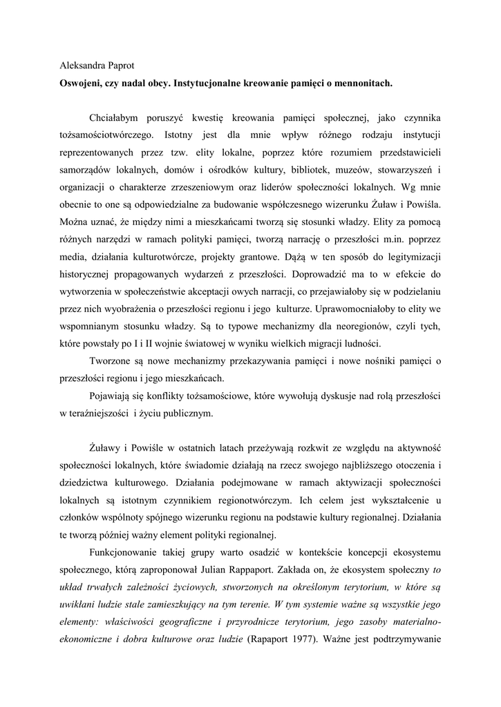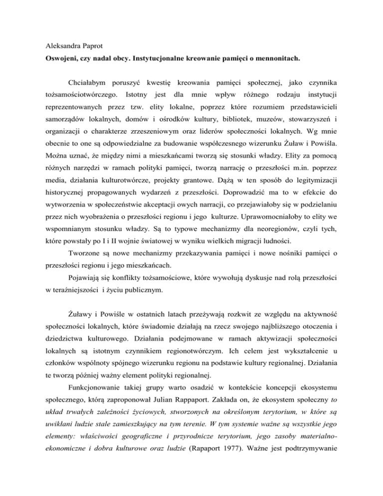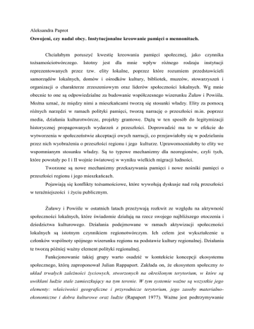 Aleksandra Paprot Oswojeni, czy nadal obcy. Instytucjonalne kreowanie pamięci o mennonitach. Chciałabym poruszyć kwestię kreowania pamięci społecznej, jako czynnika tożsamościotwórczego. Istotny jest dla mnie wpływ różnego rodzaju instytucji reprezentowanych przez tzw. elity lokalne, poprzez które rozumiem przedstawicieli samorządów lokalnych, domów i ośrodków kultury, bibliotek, muzeów, stowarzyszeń i organizacji o charakterze zrzeszeniowym oraz liderów społeczności lokalnych. Wg mnie obecnie to one są odpowiedzialne za budowanie współczesnego wizerunku Żuław i Powiśla. Można uznać, że między nimi a mieszkańcami tworzą się stosunki władzy. Elity za pomocą różnych narzędzi w ramach polityki pamięci, tworzą narrację o przeszłości m.in. poprzez media, działania kulturotwórcze, projekty grantowe. Dążą w ten sposób do legitymizacji historycznej propagowanych wydarzeń z przeszłości. Doprowadzić ma to w efekcie do wytworzenia w społeczeństwie akceptacji owych narracji, co przejawiałoby się w podzielaniu przez nich wyobrażenia o przeszłości regionu i jego kulturze. Uprawomocniałoby to elity we wspomnianym stosunku władzy. Są to typowe mechanizmy dla neoregionów, czyli tych, które powstały po I i II wojnie światowej w wyniku wielkich migracji ludności. Tworzone są nowe mechanizmy przekazywania pamięci i nowe nośniki pamięci o przeszłości regionu i jego mieszkańcach. Pojawiają się konflikty tożsamościowe, które wywołują dyskusje nad rolą przeszłości w teraźniejszości i życiu publicznym. Żuławy i Powiśle w ostatnich latach przeżywają rozkwit ze względu na aktywność społeczności lokalnych, które świadomie działają na rzecz swojego najbliższego otoczenia i dziedzictwa kulturowego. Działania podejmowane w ramach aktywizacji społeczności lokalnych są istotnym czynnikiem regionotwórczym. Ich celem jest wykształcenie u członków wspólnoty spójnego wizerunku regionu na podstawie kultury regionalnej. Działania te tworzą później ważny element polityki regionalnej. Funkcjonowanie takiej grupy warto osadzić w kontekście koncepcji ekosystemu społecznego, którą zaproponował Julian Rappaport. Zakłada on, że ekosystem społeczny to układ trwałych zależności życiowych, stworzonych na określonym terytorium, w które są uwikłani ludzie stale zamieszkujący na tym terenie. W tym systemie ważne są wszystkie jego elementy: właściwości geograficzne i przyrodnicze terytorium, jego zasoby materialnoekonomiczne i dobra kulturowe oraz ludzie (Rapaport 1977). Ważne jest podtrzymywanie więzi jednostki z ekosystemem, co zapewnia właściwą regulację aktywności społecznej. Chciałabym przedstawić kilka przykładów działań na rzecz regionalnego dziedzictwa kulturowego jako dopełnienia działań w granicach ekosystemu społecznego. Działania te związane są z przywracaniem pamięci mennonickim cmentarzom w regionie Powiśla i na Żuławach. Przykład pierwszy dotyczy programu resocjalizacyjnego „Ratujmy stare cmentarze”, który w ostatnich latach był prowadzony przez Zakład Karny w Kwidzynie. Miał on celu uporządkowanie dawno zapomnianych nekropolii. W ramach projektu 15 więźniów sprzątało sześć cmentarzy, w tym cmentrza ewangelicko-mennonickiego w Kaniczkach w gminie Sadlinki.. W czasie prac zostały usunięte chwasty i liście, poskładano popękane nagrobki oraz krzyże, uzupełniono piaskiem skrzynie grobowców. Rzecznik prasowy Zakładu Karnego powiedział: „Teraz te miejsca wyglądają jak cmentarz. Wcześniej przypominały śmietnik. Może nie są to nasi krewni czy rodacy, ale zmarłym należy się szacunek i pamięć. Chociażby za pracę, jaką wykonali na rzecz uregulowania dorzecza Wisły. Udało nam się zmotywować i zaangażować osadzonych, którzy bardzo pozytywnie zareagowali na propozycję udziału w tym projekcie”. Podobne działania przeprowadzili uczniowie Zespołu Szkół w Ryjewie. Razem z nauczycielami od kilku lat opiekują cię cmentarzem mennonickim w Barcicach. Porządkują ich teren i stawiają znicze jako znak pamięci o dawnych mieszkańcach swoich miejscowości. Nauczyciele historii przygotowują gry terenowe i questy odwołujące się do historii regionu i małych ojczyzn. Podobne działania mają miejsce w Janowie, z ta różnicą, że nauczycielka z dziećmi przeniosła pozostałości nagrobków do izby pamięci w szkole. Są one teraz elementem wystawy związanej z historią miejscowości. W ostatnich latach instytucje kultury i aktywiści lokalni powracają do tradycji i wydarzeń z przeszłości. Choć traktują je wybiórczo, to dziedzictwo kulturowe sprzed i po 1945 roku stanowi ważny element w działaniach społecznych. Więzi grupowe, tworzone są na poziomie stowarzyszeń, szkół, instytucji oraz grup wspólnego interesu i reprezentowane na poziomie przez kilku typów działań: społecznych; instytucjonalnych; resocjalizacyjnych, edukacyjnych.