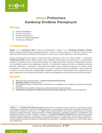 enova Preliminarz Ewidencji Środków Pieniężnych Dla kogo Kadra Zarządzająca Dyrektor Finansowy Dyrektor Ekonomiczny Pracownicy Działu Księgowość Pracownicy Analityczni Funkcjonalność Moduł enova Preliminarz EŚP rozszerza funkcjonalność modułu enova Ewidencja Środków Pieniężnych1 pozwala zaprezentować prognozę płatności w oparciu o terminy płatności w wybranym okresie czasu oraz wprowadzić plany przepływów finansowych na dany okres w ujęciu globalnym oraz szczegółowym. Analiza rozrachunków pod kątem kontroli płynności finansowej może być bardzo prosta – mechanizm Preliminarza EŚP pozwala śledzić zaplanowane wielkości preliminarza oraz porównywać z rzeczywistymi, wpływami/ wydatkami wraz z możliwością podziału na rodzaje przychodów i kosztów. Narzędzia te pozwalają, na podstawie gotówki zgromadzonej w kasach i na rachunkach bankowych oraz na podstawie terminów płatności należności i zobowiązań, oszacować jakie będzie saldo środków pieniężnych na dowolny dzień w przyszłości. Analiza ta może być prowadzona w oparciu o terminy płatności wynikające z dokumentów lub w oparciu o terminy płatności uwzględniające dodatkowe opóźnienia. Na podstawie tak przygotowanej prognozy użytkownik może podjąć odpowiednie działania zapobiegające możliwej utracie płynności finansowej. Korzyści Bardziej trafne prognozowanie i kontrola płynności finansowej. Redukcja ryzyka utraty płynności. Szczegółowa analizy rozrachunków kontrahentów, szczególnie tych niosących zagrożenie niewypłacalności. Zmniejszenie pracochłonności procesu planowania płynności finansowej. Racjonalne zarządzanie środkami finansowymi przy realizacji przelewów dla dostawców. 1 Moduł enova Ewidencja Środków Pieniężnych odpowiada za ewidencjonowanie, tworzenie i raportowanie wszystkich operacji gospodarczych oraz dokumentów związanych z prowadzeniem rozrachunków, rozliczeń z kontrahentami, pracownikami, urzędami, bankami itp. enova EŚP wspiera przede wszystkim pracę osób odpowiedzialnych za przygotowywanie raportów kasowych, ewidencjonowanie wyciągów bankowych, prowadzenie rozliczeń z kontrahentami oraz windykację należności w firmie. Zadaniem modułu enova Ewidencja Środków Pieniężnych jest kompleksowe ujęcie wszelkich operacji związanych z przepływem środków pieniężnych w firmie. Oznacza to, że gromadzi on wszystkie informacje związane ewidencją kasowo-bankową w postaci dokumentów i zapisów. Mogą one być ewidencjonowane w module Ewidencja Środków Pieniężnych bezpośrednio lub pochodzić z pozostałych modułów (np. Kadry Płace, Sprzedaż, Księgowość). enova Preliminarz EŚP www.enova.pl