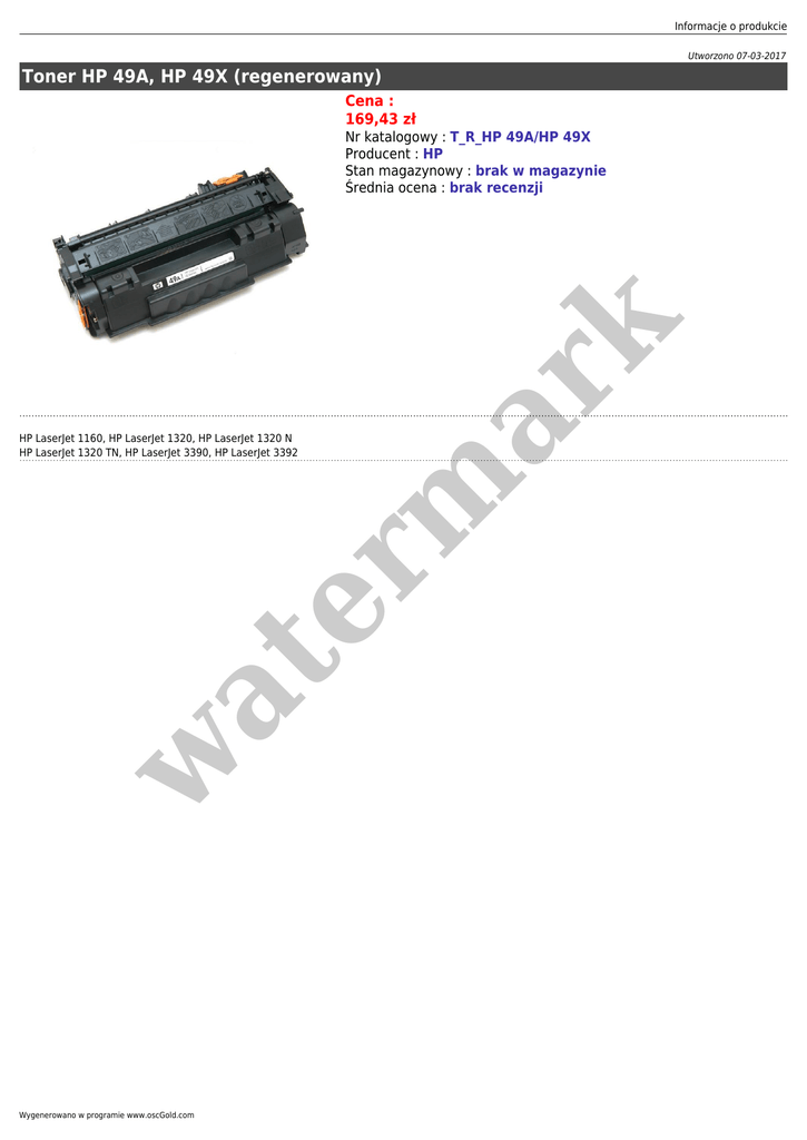 Informacje o produkcie Utworzono 07-03-2017 Toner HP 49A, HP 49X (regenerowany) Cena : 169,43 zł er m ar k Nr katalogowy : T_R_HP 49A/HP 49X Producent : HP Stan magazynowy : brak w magazynie Średnia ocena : brak recenzji w at HP LaserJet 1160, HP LaserJet 1320, HP LaserJet 1320 N HP LaserJet 1320 TN, HP LaserJet 3390, HP LaserJet 3392 Wygenerowano w programie www.oscGold.com