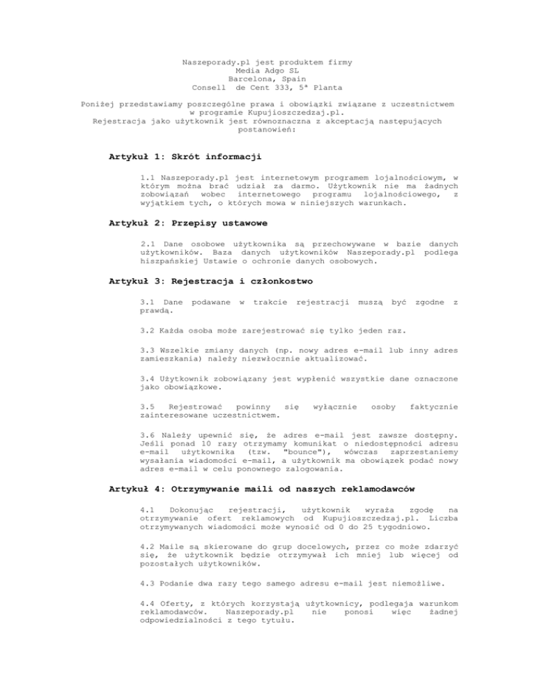 Naszeporady.pl jest produktem firmy Media Adgo SL Barcelona, Spain Consell de Cent 333, 5ª Planta Poniżej przedstawiamy poszczególne prawa i obowiązki związane z uczestnictwem w programie Kupujioszczedzaj.pl. Rejestracja jako użytkownik jest równoznaczna z akceptacją następujących postanowień: Artykuł 1: Skrót informacji 1.1 Naszeporady.pl jest internetowym programem lojalnościowym, w którym można brać udział za darmo. Użytkownik nie ma żadnych zobowiązań wobec internetowego programu lojalnościowego, z wyjątkiem tych, o których mowa w niniejszych warunkach. Artykuł 2: Przepisy ustawowe 2.1 Dane osobowe użytkownika są przechowywane w bazie danych użytkowników. Baza danych użytkowników Naszeporady.pl podlega hiszpańskiej Ustawie o ochronie danych osobowych. Artykuł 3: Rejestracja i członkostwo 3.1 Dane prawdą. podawane w trakcie rejestracji muszą być zgodne z 3.2 Każda osoba może zarejestrować się tylko jeden raz. 3.3 Wszelkie zmiany danych (np. nowy adres e-mail lub inny adres zamieszkania) należy niezwłocznie aktualizować. 3.4 Użytkownik zobowiązany jest wypłenić wszystkie dane oznaczone jako obowiązkowe. 3.5 Rejestrować powinny się zainteresowane uczestnictwem. wyłącznie osoby faktycznie 3.6 Należy upewnić się, że adres e-mail jest zawsze dostępny. Jeśli ponad 10 razy otrzymamy komunikat o niedostępności adresu e-mail użytkownika (tzw. "bounce"), wówczas zaprzestaniemy wysałania wiadomości e-mail, a użytkownik ma obowiązek podać nowy adres e-mail w celu ponownego zalogowania. Artykuł 4: Otrzymywanie maili od naszych reklamodawców 4.1 Dokonując rejestracji, użytkownik wyraża zgodę na otrzymywanie ofert reklamowych od Kupujioszczedzaj.pl. Liczba otrzymywanych wiadomości może wynosić od 0 do 25 tygodniowo. 4.2 Maile są skierowane do grup docelowych, przez co może zdarzyć się, że użytkownik będzie otrzymywał ich mniej lub więcej od pozostałych użytkowników. 4.3 Podanie dwa razy tego samego adresu e-mail jest niemożliwe. 4.4 Oferty, z których korzystają użytkownicy, podlegaja warunkom reklamodawców. Naszeporady.pl nie ponosi więc żadnej odpowiedzialności z tego tytułu. 4.5 Rejestrując się w bazie Naszeporady.pl zgadzasz otrzymywanie ofert reklamowych z naszego serwisu. się na Artykuł 5: Zakończenie uczestnictwa 5.1 Użytkownik może w dowolnym momencie zrezygnować z udziału w programie Kupujioszczedzaj.pl. Odnośnik do rezygnacji z udziału znajduje się na dole każdego wysłanego e-maila.Oto odnośnik do rezygnacji: http://Kupujioszczedzaj.pl/unsub.php 5.2 W przypadku wyrejestrowania wszystkie dane z bazy Naszeporady.pl zostają usunięte (zodnie z przepisami dotyczącymi ochrony danych osobowych mamy obowiązek usuwać wszystkie dane osobowe). 5.3 Usunięte konto możesz przywrócić rejestrując się ponownie w naszym serwisię: http://Kupujioszczedzaj.pl/ 5.4 Jeśli użytkownik zarejestruje się również w innych bazach za pośrednictwem maili lub kampanii w Kupujioszczedzaj.pl, musi on wówczas wyrejestrować się z każdej bazy osobno. Artykuł 6: Informacje ogólne 6.1 Naszeporady.pl ma prawo w dowolnym momencie wprowadzać zmiany w treści niniejszych warunków ogólnych, o czym w miarę możliwości powiadomi użytkowników. Aktualna wersje warunków ogólnych można znaleźć na portalu Kupujioszczedzaj.pl. Po wprowadzeniu zmian w treści niniejszych warunków ogólnych poprzednie warunki przestają obowiązywać. Ewentualne spory rozstrzygane będą wyłącznie przed właściwym sadem w Hiszpanii. W zakresię internetowego programu lojalnościowego i niniejszych warunków ogólnych obowiązuje prawo hiszpańskie. 6.2 Naszeporady.pl może w każdej chwili wprowadzać dotyczące tego internetowego programu lojalnościowego. zmiany 6.3 Jeśli użytkownik nie akceptuje ewentualnych zmian warunków ogólnych, powinien on samodzielnie wyrejestrować się. Pozostanie użytkownikiem oznacza automatyczną akceptację ewentualnych zmian warunków. Artykuł 7: Informacje końcowe 7.1 Naszeporady.pl nie wysyła wiadomości niepożądanych, które możesz traktować jako spam. Posiadamy wewnętrzną politykę antyspamową oraz dobre praktyki tak, aby każdy użytkownik mógł otrzymywać najciekawsze oferty że świata online. 7.2 Umieszczanie niepożądanych wiadomości lub wiadomości bez wymaganej zgody odbiorcy traktowane SPAM. wysałanie jest jako