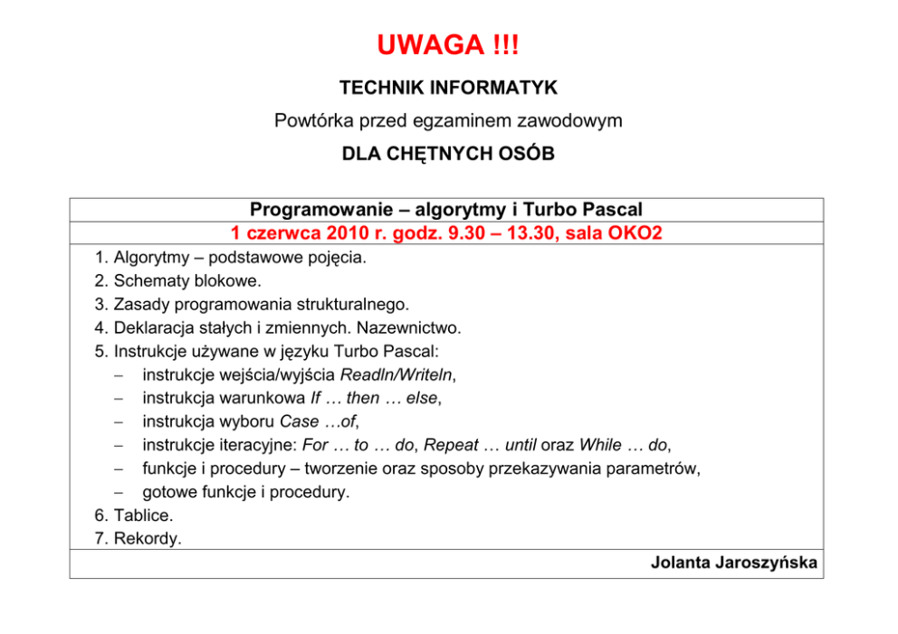 UWAGA !!! TECHNIK INFORMATYK Powtórka przed egzaminem zawodowym DLA CHĘTNYCH OSÓB Programowanie – algorytmy i Turbo Pascal 1 czerwca 2010 r. godz. 9.30 – 13.30, sala OKO2 1. Algorytmy – podstawowe pojęcia. 2. Schematy blokowe. 3. Zasady programowania strukturalnego. 4. Deklaracja stałych i zmiennych. Nazewnictwo. 5. Instrukcje uŜywane w języku Turbo Pascal: − instrukcje wejścia/wyjścia Readln/Writeln, − instrukcja warunkowa If … then … else, − instrukcja wyboru Case …of, − instrukcje iteracyjne: For … to … do, Repeat … until oraz While … do, − funkcje i procedury – tworzenie oraz sposoby przekazywania parametrów, − gotowe funkcje i procedury. 6. Tablice. 7. Rekordy. Jolanta Jaroszyńska Etap praktyczny 8 – 10 czerwca 2010 r. godz. 10.00 – 14.00, sala 39w 8.06.2010 r. Bartnik Krzysztof Bolczak Jacek Cetera Marcin Czarnecki Piotr Długosz Michał Iskra Marcin Janik Andrzej Jarosz Mateusz Kowal Adam 9.06.2010 r. Olczak Sebastian Pajewski Wojciech Pytel Robert Romanowski Konrad Śliwa Tomasz Wieszołek Krystian Wikieł Damian Wiszniewski Łukasz Wołyński Artur Woźniak Magdalena 10.06.2010 r. Absolwenci z lat ubiegłych Michał Dusza ZAPRASZAMY :) P.S. Informacje o dodatkowych zajęciach z innych przedmiotów pojawią się wkrótce. Prosimy o zgłaszanie chęci powtórzenia konkretnych zagadnień.