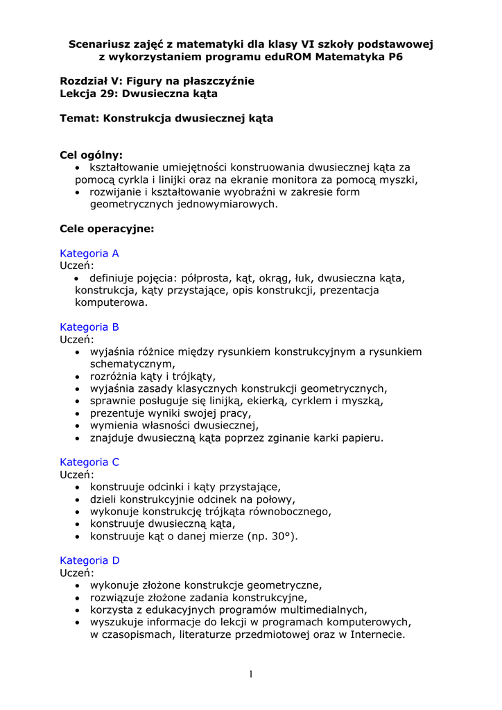 Scenariusz zajęć z matematyki dla klasy VI szkoły podstawowej z wykorzystaniem programu eduROM Matematyka P6 Rozdział V: Figury na płaszczyźnie Lekcja 29: Dwusieczna kąta Temat: Konstrukcja dwusiecznej kąta Cel ogólny: • kształtowanie umiejętności konstruowania dwusiecznej kąta za pomocą cyrkla i linijki oraz na ekranie monitora za pomocą myszki, • rozwijanie i kształtowanie wyobraźni w zakresie form geometrycznych jednowymiarowych. Cele operacyjne: Kategoria A Uczeń: • definiuje pojęcia: półprosta, kąt, okrąg, łuk, dwusieczna kąta, konstrukcja, kąty przystające, opis konstrukcji, prezentacja komputerowa. Kategoria B Uczeń: • wyjaśnia różnice między rysunkiem konstrukcyjnym a rysunkiem schematycznym, • rozróżnia kąty i trójkąty, • wyjaśnia zasady klasycznych konstrukcji geometrycznych, • sprawnie posługuje się linijką, ekierką, cyrklem i myszką, • prezentuje wyniki swojej pracy, • wymienia własności dwusiecznej, • znajduje dwusieczną kąta poprzez zginanie karki papieru. Kategoria C Uczeń: • konstruuje odcinki i kąty przystające, • dzieli konstrukcyjnie odcinek na połowy, • wykonuje konstrukcję trójkąta równobocznego, • konstruuje dwusieczną kąta, • konstruuje kąt o danej mierze (np. 30°). Kategoria D Uczeń: • wykonuje złożone konstrukcje geometryczne, • rozwiązuje złożone zadania konstrukcyjne, • korzysta z edukacyjnych programów multimedialnych, • wyszukuje informacje do lekcji w programach komputerowych, w czasopismach, literaturze przedmiotowej oraz w Internecie. 1 Cele wychowawcze: • • • • kształtowanie umiejętności pracy zespołowej, przyzwyczajanie do pracy dokładnej i rzetelnej, rozwijanie wyobraźni i spostrzegawczości, wyrabianie zadowolenia z własnej twórczości. Metody pracy: • • • rozmowa kierowana, praca z komputerem, ćwiczenia konstrukcyjne w pracowni komputerowej. Formy pracy: • • • indywidualna, praca w parach, praca z całą klasą. Pojęcia kluczowe: • • • • • dwusieczna kąta, konstrukcje geometryczne, kąt, łuk, kąty przystające. Środki dydaktyczne: • • • • • instrukcja dla każdej grupy, multimedialny program eduROM Matematyka P6, komputer, tablica, kolorowa kreda, przyrządy geometryczne, kolorowe kartki papieru. Przebieg zajęć Etapy Zadania dla ucznia Część wstępna Uczeń: • zapoznaje się (10 minut) z problemem • zastanawia się nad swoją rolą w grupie Zadania dla nauczyciela Umiejętności klasowe Nauczyciel: • podaje uczniom cele lekcji • uczniowie dobierają się parami (po dwóch uczniów przy jednym komputerze) Uczniowie: doskonalą umiejętności: • współpracy i komunikowania się w grupie • podejmowania nowych zadań • zachowania dyscypliny czasowej 2 Badanie i przekształcanie problemu (15 minut) Uczeń: • słucha nauczyciela • zapisuje temat lekcji w swoim zeszycie • czyta kartę pracy • uruchamia program Matematyka P6 • analizuje problem • poszukuje wiedzy do rozwiązania problemu • wykonuje pomocnicze rysunki i zapisy na karcie pracy • wykonuje konstrukcję na kartce papieru • sprawdza poprawność rozwiązania zadania w raporcie programu • przygotowuje się oraz grupę do prezentacji • poleca włączyć program eduROM Matematyka P6 • rozdaje materiały do lekcji • omawia sposób poruszania się w programie Nauczyciel: • podaje i zapisuje temat lekcji na tablicy • wyjaśnia zadanie konstrukcyjne (2 minuty) Uczniowie: doskonalą umiejętności: • pełnienia określonych ról podczas pracy w zespole • posługiwania się programem komputerowym eduROM Matematyka P6 • wyszukiwania potrzebnych wiadomości • zastosowania znalezionych informacji w zadaniu konstrukcyjnym • łączenia wiedzy informatycznej i matematycznej w praktyce (podczas konstruowania dwusiecznej myszką) • sprawdzania poprawności konstrukcji • usuwania błędów w rozwiązaniu • porządkuje proces lekcyjny (według potrzeb) • pomaga uczniom, jeśli pojawią się jakieś trudności 3 Konstrukcja dwusiecznej na tablicy (10 minut) Uczeń: Nauczyciel: Uczniowie: • uczeń wybrany • sprawdza doskonalą umiejętności: przez grupę konstrukcję • prezentacji konstruuje na na tablicy tablicy • udziela • formułowania wniosków dwusieczną kąta pochwały dla i objaśnia ucznia• oceny sposób konstruktora i samooceny konstrukcji • wskazuje (krok po kroku). wspólnie • zastosowania Pozostali mogą z innymi komputera pomagać uczniami i programów uczniowi jakieś błędy edukacyjnych na w objaśnianiu • ocenia pracę lekcji matematyki konstrukcji. uczniów • dokonuje oceny (wstawia pracy pary oceny do i samooceny dziennika) własnej pracy • zachęca uczniów do wypełnienia ankiety dla ucznia Refleksja (10 minut) Uczeń: • formułuje wniosek • zapisuje wniosek na tablicy i w zeszycie • wypełnia ankietę dla ucznia • zapisuje pracę domową Nauczyciel: • poleca zakończyć pracę z programem i wyjść z programu, zamykając go i wyjmując płytę z komputera • prosi o wypełnienie ankiety dla ucznia • zadaje uczniom pracę domową „Skonstruuj dwusieczną kąta ostrego”* • zadaje dodatkowe zadanie dla chętnych „Narysuj dwusieczne kątów przyległych” 4 Uczniowie doskonalą umiejętności: • konstruowania dwusiecznej kąta z wykorzystaniem programu komputerowego eduROM Matematyka P6 Komentarz nauczyciela: Konstrukcje geometryczne uczą spostrzegawczości, pomysłowości i dokładności. Jest to nowy i dobry sposób wyszukiwanie i zastosowanie wiedzy w praktycznym działaniu. Matematyka z programem komputerowym wcale nie jest taka trudna! Program edukacyjny eduROM Matematyka P6 to nowoczesny podręcznik, który warto kupić, by wykorzystać do innej lekcji matematyki. Materiały do lekcji: 1. Płyta CD do każdego uczniowskiego komputera. 2. Przyrządy geometryczne uczniowskie (praca własna na kartce) i klasowe (konstrukcja na ta