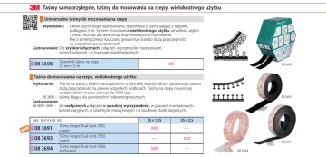 Taśmy samoprzylepne, taśmy do mocowania na rzepy, wielokrotnego użytku Uniwersalne taśmy do mocowania na rzepy Łatwe użycie dzięki zastosowaniu dozownika z taśmą klejącą z rzepami, o długości 5 m. System mocowania wielokrotnego użytku umożliwia szybki i prosty montaż lub demontaż oraz niewidoczne mocowanie. Klej z syntetycznego kauczuku gwarantuje bardzo dużą przyczepność na wszystkich powierzchniach. Zastosowanie: Do szybkorozłącznych połączeń w przemyśle maszynowym, samochodowym i w budowie stoisk targowych. 08M Wykonanie: 08 3690 Dozownik taśmy na rzepy 25 mm×5 m XXX 08 3690 Taśma do mocowania na rzepy, wielokrotnego użytku Wykonanie: 25×1,25 25×2,5 08M XXX — 08M — XXX 08M Taśma na rzepy z klejem kauczukowym o wysokiej wytrzymałości, gwarantuje bardzo dużą przyczepność na prawie wszystkich podłożach. Taśmy na rzepy o wysokiej wytrzymałości można używać do 1000 razy. 08 3691 – taśma klejąca do powierzchni niskoenergetycznych. Zastosowanie: 08 3693–3694 – do rozłącznych połączeń o wysokiej wytrzymałości, w pracach montażowych, konserwacyjnych, w przemyśle maszynowym i w budowie stoisk targowych. XXX — szer. (mm)×dł. (m) klejące Dual-Lock 3870, 08 3691 Taśmy czarne klejące Dual-Lock 3550, 08 3693 Taśmy czarne klejące Dual-Lock 3560, 08 3694 Taśmy bezbarwne 08 3691 08 3693 08 3694