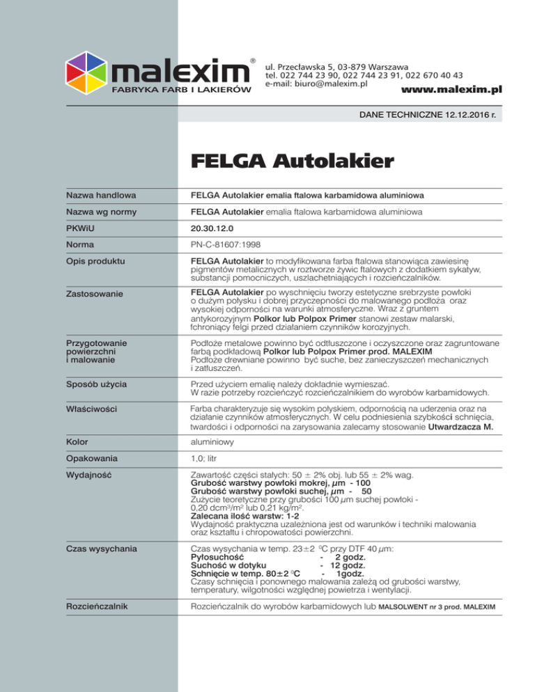 malexim ® FABRYKA FARB I LAKIERÓW ul. Przecławska 5, 03-879 Warszawa tel. 022 744 23 90, 022 744 23 91, 022 670 40 43 e-mail: [email protected] www.malexim.pl DANE TECHNICZNE 12.12.2016 r. FELGA Autolakier Nazwa handlowa FELGA Autolakier emalia ftalowa karbamidowa aluminiowa Nazwa wg normy FELGA Autolakier emalia ftalowa karbamidowa aluminiowa PKWiU 20.30.12.0 Norma PN-C-81607:1998 Opis produktu FELGA Autolakier to modyfikowana farba ftalowa stanowiąca zawiesinę pigmentów metalicznych w roztworze żywic ftalowych z dodatkiem sykatyw, substancji pomocniczych, uszlachetniających i rozcieńczalników. Zastosowanie FELGA Autolakier po wyschnięciu tworzy estetyczne srebrzyste powłoki o dużym połysku i dobrej przyczepności do malowanego podłoża oraz wysokiej odporności na warunki atmosferyczne. Wraz z gruntem antykorozyjnym Polkor lub Polpox Primer stanowi zestaw malarski, fchroniący felgi przed działaniem czynników korozyjnych. Przygotowanie powierzchni i malowanie Podłoże metalowe powinno być odtłuszczone i oczyszczone oraz zagruntowane farbą podkładową Polkor lub Polpox Primer .prod. MALEXIM Podłoże drewniane powinno być suche, bez zanieczyszczeń mechanicznych i zatłuszczeń. Sposób użycia Przed użyciem emalię należy dokładnie wymieszać. W razie potrzeby rozcieńczyć rozcieńczalnikiem do wyrobów karbamidowych. Właściwości Farba charakteryzuje się wysokim połyskiem, odpornością na uderzenia oraz na działanie czynników atmosferycznych. W celu podniesienia szybkości schnięcia, twardości i odporności na zarysowania zalecamy stosowanie Utwardzacza M. Kolor aluminiowy Opakowania 1,0; litr Wydajność Zawartość części stałych: 50 ± 2% obj. lub 55 ± 2% wag. Grubość warstwy powłoki mokrej, µm - 100 Grubość warstwy powłoki suchej, µm - 50 Zużycie teoretyczne przy grubości 100 µm suchej powłoki 0,20 dcm³/m² lub 0,21 kg/m². Zalecana ilość warstw: 1-2 Wydajność praktyczna uzależniona jest od warunków i techniki malowania oraz kształtu i chropowatości powierzchni. Czas wysychania Czas wysychania w temp. 23±2 0C przy DTF 40 µm: Pyłosuchość - 2 godz. Suchość w dotyku - 12 godz. Schnięcie w temp. 80±2 0C - 1godz. Czasy schnięcia i ponownego malowania zależą od grubości warstwy, temperatury, wilgotności względnej powietrza i wentylacji. Rozcieńczalnik Rozcieńczalnik do wyrobów karbamidowych lub MALSOLWENT nr 3 prod. MALEXIM malexim ® FABRYKA FARB I LAKIERÓW FELGA Autolakier str. 2 Sposób nanoszenia Pędzel Wałek Natrysk pneumatyczny Parametry techniczne Lepkość umowna wg kubka Forda Φ 4 Gęstość min. 110 s max 1,10 g/cm3 Max. zawartość LZO Dz.U.2016r. Poz.1353, kategoria A/i/FR: 500 g/l. Produkt zawiera max.: 490 g/l LZO Atesty i Certyfikaty Atest PZH Wskazówki BHP i ppoż. Działa szkodliwie przez drogi oddechowe, skórę i po spożyciu. Ze względu na zawartość składników lotnych i palnych w wyrobie należy przestrzegać zasad i przepisów BHP i ppoż. zawartych w Karcie Charakterystyki Mieszaniny Chemicznej, ze szczególnym uwzględnieniem wentylacji pomieszczeń. Transport i przechowywanie Farbę należy przechowywać i transportować w szczelnie zamkniętych opakowaniach z dala od ognia i źródeł ciepła w temp. 5-250C. Okres przydatności do użycia 36 miesięcy od daty produkcji.