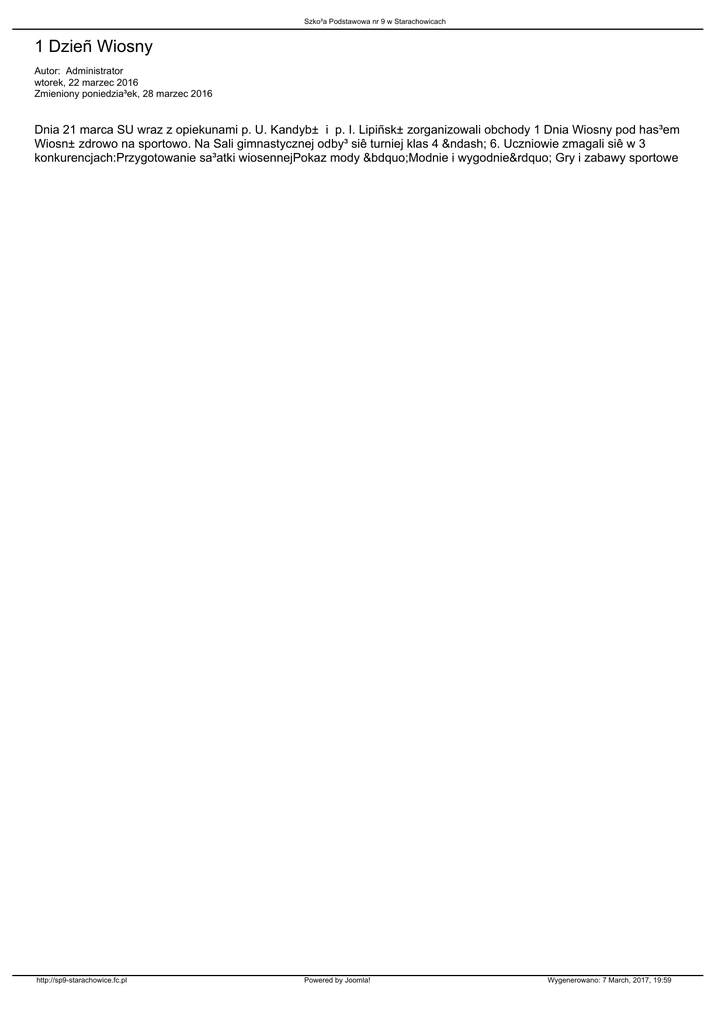 Szko³a Podstawowa nr 9 w Starachowicach 1 Dzieñ Wiosny Autor: Administrator wtorek, 22 marzec 2016 Zmieniony poniedzia³ek, 28 marzec 2016 Dnia 21 marca SU wraz z opiekunami p. U. Kandyb± i p. I. Lipiñsk± zorganizowali obchody 1 Dnia Wiosny pod has³em Wiosn± zdrowo na sportowo. Na Sali gimnastycznej odby³ siê turniej klas 4 – 6. Uczniowie zmagali siê w 3 konkurencjach:Przygotowanie sa³atki wiosennejPokaz mody „Modnie i wygodnie” Gry i zabawy sportowe http://sp9-starachowice.fc.pl Powered by Joomla! Wygenerowano: 7 March, 2017, 19:59