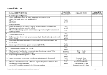 Aparat USG – 1 szt. PARAMETR/WARUNEK Konstrukcja i konfiguracja Aparat ultrasonograficzny do badań ginekologiczno-położniczych Aparat fabrycznie nowy - rok produkcji 2015 Model/typ Producent Kraj pochodzenia Konstrukcja mobilna na wózku z czterema skrętnymi kołami, z blokadą oraz hamulcem przynajmniej na dwóch kołach Modułowa konstrukcja aparatu umożliwiająca jego rozbudowę bez konieczności wymiany aparatu 1. 2. 3. 4. Waga aparatu do 160 kg 5. Cyfrowy system formowania i przetwarzania wiązki ultradźwiękowej, przetwornik min. 8 bitowy Programowanie nastaw dla aplikacji klinicznych i poszczególnych głowic usg, tzw. presety 6. 7. Zakres częstotliwości pracy aparatu co najmniej 2-16MHz 8. Zakres dynamiki systemu min. 210 dB 9. 10. Min 8 suwaków/regulatorów wzmocnienia głębokościowego wiązki TGC, regulacja cyfrowa z panela dotykowego Głębokość pola obrazowego min. 2-30cm 11. Aparat wyposażony w minimum trzy aktywne gniazda głowic obrazowych 12. Monitor o rozdzielczości min. 1280x1024 o przekątnej ekranu minimum 20” z możliwością regulacji położenia - obraz USG powinien zajmować min. 50% pola monitora Formularz „Zestawienie wymaganych parametrów technicznych i użytkowych” WARUNEK GRANICZNY SKALA OCENY PARAMETR OFEROWANY TAK podać TAK podać TAK TAK podać TAK podać TAK TAK podać TAK podać TAK/NIE TAK podać TAK podać TAK podać TAK – 10 pkt NIE – 0 pkt 3 gniazda -0 pkt 4 gniazda – 10 pkt Rozdzielczość Full HD (1920x1080) - 10 pkt Inna rozdzielczość – 0 pkt 1z6 Przekątna ekranu ≥ 21” – 10 pkt Przekątna ekranu 20” – 0 pkt 13. 14. 15. 16. 17. 18. 19. 20. 21. 22. Pulpit sterowniczy z regulacją min. góra - dół w zakresie min. 15 cm Archiwizacja Wbudowany wewnętrzny system archiwizacji obrazów i sekwencji oraz danych pacjentów na dysku twardym oraz możliwość zapisu obrazów w formatach kompatybilnych z systemem operacyjnym Windows, tj. w formatach co najmniej JPG lub TIFF i AVI Aparat wyposażony w videoprinter czarno – biały Wbudowany dysk twardy aparatu o pojemności min. 500 GB Napęd DVD-R Archiwizacja badań w postaci plików obrazowych i sekwencji filmowych na napędzie DVD-R w ogólnodostępnych formatach w tym: JPG lubTIFF, AVI oraz DICOM 3.0. Zapis na płytę swobodnie wybranych pacjentów z ich obrazami i pętlami obrazowymi Wyjście USB do pamięci typu FLASH do nagrywania obrazów w formatach JPG lub TIFF, AVI, DICOM Raporty dla każdego rodzaju badania z możliwością dołączania obrazów do raportu oraz z możliwością wprowadzania własnych opisów i komentarzy do raportu Moduł DICOM 3.0 umożliwiający zapis i przesyłanie obrazów w standardzie DICOM Obrazowanie Dostępne w aparacie tryby pracy: - Tryb B - Tryb M - Doppler pulsacyjny - Doppler kolorowy - Power Doppler Formularz „Zestawienie wymaganych parametrów technicznych i użytkowych” TAK podać TAK podać TAK TAK podać TAK TAK podać TAK podać TAK TAK TAK podać 2z6 23. - Doppler tkankowy - Duplex ( 2D/PWD) z rejestrowaną prędkością min. 7 m/s - Triplex (2D/PWD/CD) z rejestrowaną prędkością min. 7 m/s Tryb wysokoczuły do wizualizacji bardzo wolnych przepływów 24. Frame Rate dla trybu B – min. 1000 obrazów/s 25. Zoom min 8x na obrazie zatrzymanym i w min 8 w czasie rzeczywistym 26. 27. 28. Możliwość zmiany szerokości wyświetlanego obrazu 2D Automatyczna optymalizacja obrazu PW przy pomocy jednego klawisza ( min. automatyczne dopasowanie linii bazowej oraz skali ) Zakres regulacji bramki min. 1-15 mm 29. Możliwość odchylenia wiązki dopplerowskiej min. +/- 20 stopni 30. Korekcja kąta bramki dopplerowskiej min. +/- 70stopni 31. Automatyczna korekcja kąta bramki dopplerowskiej za pomocą jednego przycisku 32. 33. 34. Jednoczesne obrazowanie B oraz B/CD w czasie rzeczywistym Obrazowanie Duplex i Triplex dostępne ze wszystkich zaoferowanych głowic Obrazowanie harmoniczne na wszystkich oferowanych sondach z możliwością zmian częstotliwości harmonicznych Optymalizacja obrazu B za pomocą jednego przycisku Obrazowanie w trybie skrzyżowanych ultradźwięków dostępne ze wszystkich zaoferowanych głowic Pełny pakiet kalkulacji położniczych, krzywe wzrostu płodu na siatkach centylowych, wykresy przepływów mózgowych i pępowinowych Automatyczne obrysowanie i wyznaczanie parametrów (min. RI, PI, S/D) widma dopplerowskiego w czasie rzeczywistym na ruchomym spektrum Automatyczne (jednym naciśnięciem klawisza) wyznaczanie parametrów (min. RI, PI, S/D, HR ) widma dopplerowskiego na zamrożonym spektrum 35. 36. 37. 38. 39. Formularz „Zestawienie wymaganych parametrów technicznych i użytkowych” TAK/NIE TAK – 10 pkt NIE – 0 pkt TAK podać TAK podać TAK TAK TAK podać TAK podać TAK podać TAK/NIE TAK – 10 pkt NIE – 0 pkt TAK TAK TAK TAK TAK TAK TAK TAK/NIE TAK – 10 pkt NIE – 0 pkt 3z6 40. Podstawowe pomiary biometryczne płodu min. BPD, AC, HC, FL 41. Oprogramowanie do wygładzania oraz wykontrastowania obrazu i uzyskania obrazu zbliżonego do obrazów MR współpracujące na żywo z trybami color doppler, power doppler, skrzyżowanymi ultradźwiękami. Funkcja automatyzacji wyznaczania NT i IT z obrazu 2D lub 3D przy wykorzystaniu metod zgodnych z zaleceniami FMF, z możliwością wykonywania pomiaru na obrazach zapisanych w archiwum. Pełne oprogramowanie do badań: - naczyniowych - jamy brzusznej - drobnych narządów - ginekologicznych - położniczych - urologicznych - echokardiografia płodowa Sondy dedykowane do aparatu elektroniczne, szerokopasmowe Głowica convex z obrazowaniem harmonicznym do badań brzusznych, położniczych, ginekologicznych, urologicznych - zakres częstotliwości pracy min. 2-6 MHz - min. 160 elementów Głowica liniowa z obrazowaniem harmonicznym o częstotliwości pracy min. 4-8 MHz, - ilość elementów min. 192 - szerokość skanowania min.38mm Głowica endocavitarna z obrazowaniem harmonicznym do badań ginekologicznych, położniczych, urologiczny