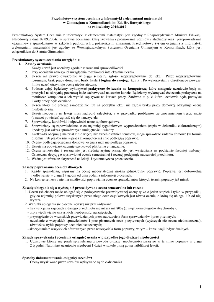 Przedmiotowy system oceniania z informatyki z elementami matematyki w Gimnazjum w Komornikach im. Ed. Hr. Raczyńskiego na rok szkolny 2016/2017 Przedmiotowy System Oceniania z informatyki z elementami matematyki jest zgodny z Rozporządzeniem Ministra Edukacji Narodowej z dnia 07.09.2004r. w sprawie oceniania, klasyfikowania i promowania uczniów i słuchaczy oraz przeprowadzania egzaminów i sprawdzianów w szkołach publicznych z późniejszymi zmianami. Przedmiotowy system oceniania z informatyki z elementami matematyki jest zgodny ze Wewnątrzszkolnym Systemem Oceniania Gimnazjum w Komornikach, który jest załącznikiem do Statutu Gimnazjum. Przedmiotowy system oceniania uwzględnia: I. Zasady oceniania 1. Każdy uczeń jest oceniany zgodnie z zasadami sprawiedliwości. 2. Przy ocenianiu nauczyciel uwzględnia możliwości intelektualne ucznia. 3. Uczeń ma prawo dwukrotnie w ciągu semestru zgłosić nieprzygotowanie do lekcji. Przez nieprzygotowanie rozumiem, brak pracy domowej, bark hasła i loginu do swojego konta . Po wykorzystaniu określonego powyżej limitu uczeń otrzymuje ocenę niedostateczną. 4. Podczas zajęć będziemy wykonywać praktyczne ćwiczenia na komputerze, które następnie uczniowie będą mi przesyłać na skrzynkę pocztową bądź zachowywać na swoim koncie. Będziemy wykonywać ćwiczenia praktyczne na monitorze komputera a ich wyniki zapisywać na kartach pracy. Zarówno te pliki które uczniowie będą przesyłać i karty pracy będą oceniane. 5. Uczeń który nie pracuje samodzielnie lub na początku lekcji nie zgłosi braku pracy domowej otrzymuje ocenę niedostateczną. 6. Uczeń nieobecny na lekcji musi nadrobić zaległości, a w przypadku problemów ze zrozumieniem treści, może (a nawet powinien) zgłosić się do nauczyciela. 7. Sprawdziany, kartkówki i odpowiedzi ustne są obowiązkowe. 8. Sprawdziany są zapowiedziane, z co najmniej tygodniowym wyprzedzeniem (zapis w dzienniku elektronicznym) i podany jest zakres sprawdzanych umiejętności i wiedzy. 9. Kartkówki obejmują materiał z nie więcej niż trzech ostatnich tematów, mogą sprawdzać zadania domowe (w formie pisemnej lub praktycznie – praca z komputerem) i nie podlegają poprawie. 10. Ocenie podlegają e-zadania domowe, ocena z nich nie podlega poprawie. 11. Uczeń ma obowiązek czynnie użytkować platformę e-nauczanie. 12. Ocena semestralna i roczna nie jest średnią arytmetyczną, ale jest wystawiana na podstawie średniej ważonej. Ostateczną decyzję o wystawionej ocenie semestralnej i rocznej podejmuje nauczyciel przedmiotu. 13. Ważna jest również aktywność na lekcji i systematyczna praca ucznia. Zasady poprawiania ocen cząstkowych 1. Każdy sprawdzian, napisany na ocenę niedostateczną można jednokrotnie poprawić. Poprawa jest dobrowolna i odbywa się w ciągu 2 tygodni od dnia podania informacji o ocenach. 2. Na koniec semestru nie ma możliwości poprawiania ocen ze sprawdzianów których termin poprawy już minął. Zasady ubiegania się o wyższą niż przewidywana ocena semestralna lub roczna: 1. Uczeń (słuchacz) może ubiegać się o podwyższenie przewidywanej oceny tylko o jeden stopień i tylko w przypadku, gdy co najmniej połowa uzyskanych przez niego ocen cząstkowych jest równa ocenie, o którą się ubiega, lub od niej wyższa. 2. Warunki ubiegania się o ocenę wyższą niż przewidywana: - frekwencja na zajęciach z danego przedmiotu nie niższa niż 80% (z wyjątkiem długotrwałej choroby); - usprawiedliwienie wszystkich nieobecności na zajęciach; - przystąpienie do wszystkich przewidzianych przez nauczyciela form sprawdzianów i prac pisemnych; - uzyskanie z wszystkich sprawdzianów i prac pisemnych ocen pozytywnych (wyższych niż ocena niedostateczna), również w trybie poprawy ocen niedostatecznych; - skorzystanie z wszystkich oferowanych przez nauczyciela form poprawy, w tym – konsultacji indywidualnych. Zasady sprawdzania i oceniania osiągnięć ucznia w przypadku jego dłuższej nieobecności 1. Uczniowie którzy nie pisali sprawdzianu z powodu dłuższej nieobecności piszą go w terminie poprawy w ciągu 2 tygodni. Natomiast uczniowie nieobecni 1 dzień w szkole piszą go na najbliższej lekcji. Sposoby dokumentowania osiągnięć uczniów: 1. Oceny uzyskiwane przez uczniów wpisywane są do e-dziennika. 1 Wymagania i zasady oceniania uczniów o specjalnych potrzebach edukacyjnych. Uczniowie z dysfunkcjami: wydłużenie czasu pracy na sprawdzianach, umożliwienie pisania drukowanymi literami lub na komputerze, umożliwienie zaliczania sprawdzianów podzielonych na mniejsze partie materiału na zajęciach dodatkowych, zmiana formy sprawdzianu lub kartkówki z formy pisemnej na ustną, zajmowanie dostosowanego miejsca siedzenia w klasie, uwzględnianie błędów wynikających z dyskalkulii, zastosowanie metod ułatwiających opanowanie materiału: podawanie poleceń w prostszej formie, unikanie trudnych abstrakcyjnych pojęć, odwoływanie się do konkretu, przykładu, unikanie pytań przekrojowych i problemowych, umożliwianie samodzielnego odczytywania prac pisanych przez uczniów, podchodzenie do dziecka w trakcie samodzielnej pracy, w razie potrzeby udzielenie pomocy, wyjaśnień, mobilizowanie do wysiłku i ukończenia zadania, umożliwianie dziecku ustnego skomentowania wykonywanych działań podczas wykonywania ścisłych operacji wymagających wielokrotnych przekształceń, nie wyrywanie do natychmiastowej odpowiedzi, przygotowanie wcześniej zapowiedzią, że uczeń będzie pytany, w trakcie rozwiązywania zadań tekstowych sprawdzanie, czy uczeń przeczytał treść zadania i czy prawidłowo ją zrozumiał, w razie potrzeby udzielanie dodatkowych wskazówek, stworzenie możliwości wykonywania dodatkowych ćwiczeń w celu przyswojenia danej partii materiału. Uczniowie zdolni: utrzymanie wysokiego poziomu stawianych uczniowi zadań, zwiększanie wymagań co do precyzji i ścisłości wypowiedzi, korygowanie b