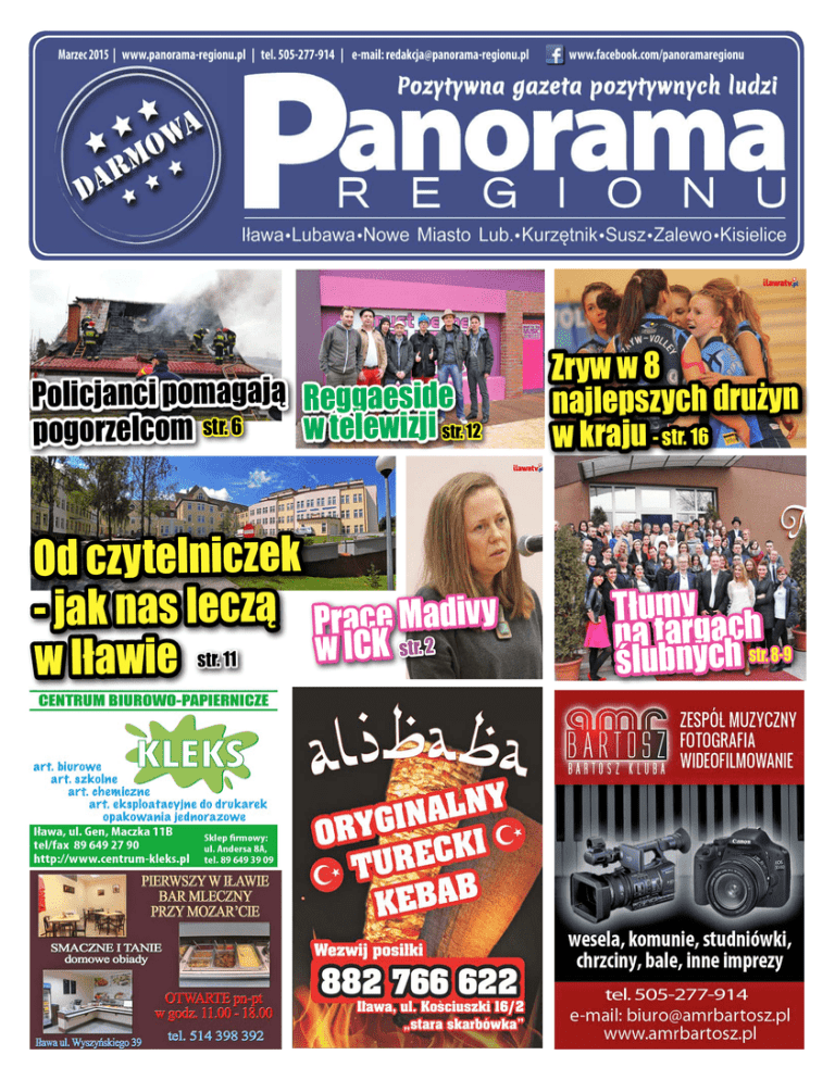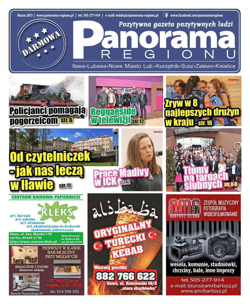 Marzec 2015 | www.panorama-regionu.pl | tel. 505-277-914 | e-mail: [email protected] Policjanci pomagają Reggaeside w telewizji str. 12 pogorzelcom str. 6 Od czytelniczek - jak nas leczą Prace Madivy str. 2 K C I w 11 str. w Iławie www.facebook.com/panoramaregionu Zryw w 8 najlepszych drużyn w kraju - str. 16 Tłumy h na targac str. 8-9 ślubnych 2 21 marca 2015 Marzec 2015 | www.panorama-regionu.pl 6 LAT Wystawa Joanny Madivy Żurańskiej – AVIDAM* ACT* COLAGE*… w Iławskim Centrum Kultury Wernisaż Haliny Nowickiej w galerii „Na wprost” Ciepło, cieplej czyli wiosna powoli puka do nas. Wszystko się budzi z zimowego snu, który na szczęście mozno zimowy nie był – co pozwoli na szybkie oddanie budowanych inwestycji, których nie brakuje w regionie. Nie tylko za oknem budzi się wiosna, pierwsze łódki już pływają na Jezioraku a i startuje sportowa aktywność – piłkarze i siatkarze będą rozpoczynać wiosenne zmagania ligowe, gdzie Wikielec będzie walczył o awans do 3 ligi, Drwęca Nowe Miasto Lubawskie – do 2 ligi, Unia Susz – do 4 ligi, a siatkarski Zryw, której juniorki są już w 8 najlepszych drużyn w Polsce – czeka Finał Mistrzostw Polski Juniorek w Wieliczce oraz Półfinał Mistrzostw Polski Kadetek w Bydgoszczy. Życzymy wszystkim drużynom oraz indywidualnym sportowcom wielu znakomitych, najwyższych sukcesów oraz emocji, z których my media będziemy - jako Iławska Telewizja Internetowa ilawaTV oraz Panorama Regionu – dumni, i na pewno będziemy o tym wszystkim pisać. Bartosz Kluba 13 marca o godzinie 18.00 w Iławskim Centrum Kultury odbyła się wystawa prac Joanny Madivy Żurańskiej – AVIDAM* ACT* COLAGE*…. Artystka urodziła się w Iławie. Studiowała na kierunku Grafika Warsztatowa (linoryt) na Uniwersytecie Mikołaja Kopernika w Toruniu. Dyplom otrzymała w 1999r. Wystawy indywidualne: Iława, Toruń, Elbląg a także Tholen w Holandii. Jej ulubioną techniką jest rysunek, ze względu na bezpośredni gest określający charakter osobowości, prezentowane prace to w więk- DOWIEDZ SIĘ WIĘCEJ O SPECJALNEJ OFERCIE: FHU SATEL-KOM IŁAWA, UL. GRUNWALDZKA 9A TEL. 606-816-446 szości rysunki wzbogacone kolorem, fakturą. Artystka zajmuję się też malarstwem (głównie akryl), a także projektowaniem wnętrz. Rysunek daje też możliwość uchwycenia bezpośredniej projekcji treści podświadomych, określa jej temperament. Joannę serdecznie przywitała zgromadzona publiczność w Sali konferencyjnej, która podziwiała jej prace. Artystka opowiedziała zgromadzonym o sztuce tworzenia swoich prac .Wystawę będzie można oglądać w sali wystaw Iławskiego Centrum Kultury do 13 kwietnia. 6 marca w iławskiej galerii „Na wprost” odbył się wernisaż malarstwa Haliny Nowickiej. Urodziła się w 1959 roku. Studiowała w ASP w Łodzi na Wydziale Włókienniczym w zakresie projektowania ubioru w pracowni prof. Finkszteina oraz malarstwo w pracowni prof. Wiesława Garbolińskiego. Dyplom otrzymała w 1985 roku. W 1997 roku otrzymała I nagrodę w ogólnopolskim konkursie malarskim „Triennale Martwej Natury” w Sieradzu. Brała udział w ponad 100 zbiorowych wystawach malarstwa w kraju i za granicą między innymi w Niemczech, USA, Francji, Holandii, Czechach. Ma w swoim dorobku artystycznym 25 wystaw indywidualnych (Sieradz, Kraków, Szczecin, Poznań, Łódż, Świnoujście, Warszawa, Wałbrzych, Motovun-Chorwacja, Arras-Francja, Lille-Francja. Na wernisażu pojawiło się wielu gości, którzy podziwiali pracę Pani Haliny, która z wielką pasją i oddaniem opowiada o tym co tworzy oraz czym się zajmuje. „Bądź aktywna nie tylko w Dniu Kobiet” Z okazji Dnia Kobiet w Iławie już po raz trzeci odbył się happening pod nazwą „Bądź aktywna nie tylko w Dniu Kobiet”. Przed Galerią „Jeziorak” zgromadziły się tłumy Pań, które w sportowym duchu walki wzięły udział w zabawie. Każda z nich miała do pokonania trasę ponad dwóch kilometrów na około małego Jezioraka. Wyznaczoną trasę można było pokonać pieszo, w biegu, na rolkach albo za pomocą Nordic Walking. Po dotarciu na metę, każda z Pań otrzymała symbolicznego tulipana, który stał się wejściówką do innych atrakcji na terenie galerii Jeziorak w Iławie. Dla niektórych uczestniczek happeningu był to już któryś raz z kolei 6 LAT 21 marca 2015 Marzec 2015 | www.panorama-regionu.pl 3 Jak przedszkole to tylko OFERTY CENOWE, OBOWIĄZUJĄCE W PRZEDSZKOLU „UROCZY ZAKĄTEK” (oferty wybierane przez klientów Przedszkola według potrzeb i możliwości, z możliwością comiesięcznej zmiany opcji). Pobyt w Przedszkolu w godzinach 6:00-17:00 (powyżej 5 godzin dziennie) • 400 zł (czesne, wyżywienie, realizacja podstawy programowej + wszystkie zajęcia dodatkowe, diagnoza i terapia logopedyczna) • 100 zł czesne + 15zł/dzień (wyżywienie, realizacja podstawy programowej bez zajęć dodatkowych, diagnoza i terapia logopedyczna) Pobyt w Przedszkolu w godzinach 6:00- 12:00 • 10 zł/ dzień (wyżywienie, realizacja podstawy programowej bez zajęć dodatkowych, diagnoza i terapia logopedyczna); w przypadku braku dziecka w przedszkolu opłaty nie pobieramy. Do każdej z podanych opcji jest możliwość dokupienia zajęć dodatkowych (ZUMBA, jęz. angielski). Nie pobieramy OPŁATY WPISOWEJ!!! Wszystkie przybory do pracy, nauki i zabawy gwarantuje właściciel placówki!!! Rodzice na muszą płacić za art. papiernicze, higieniczne ani za nic, z czego dzieci korzystają na terenie przedszkola. Jedyne, co rodzic musi dziecku przynieść to: kapcie, ubranie na zmianę i szczoteczkę do zębów. Niewiele, prawda? Dowóz dzieci z Iławy i okolic (Nowa Wieś, Gramoty, Mątyki) do przedszkola i z powrotem GRATIS!!! Posiadamy duży, bezpieczny, ogrodzony plac zabaw, wyposażony w atestowany sprzęt. Kadra przedszkola posiada wszystkie niezbędne kwalifikacje do pracy z dziećmi. Kochamy dzieci i robimy wszystko, by czuły się z nami bezpi