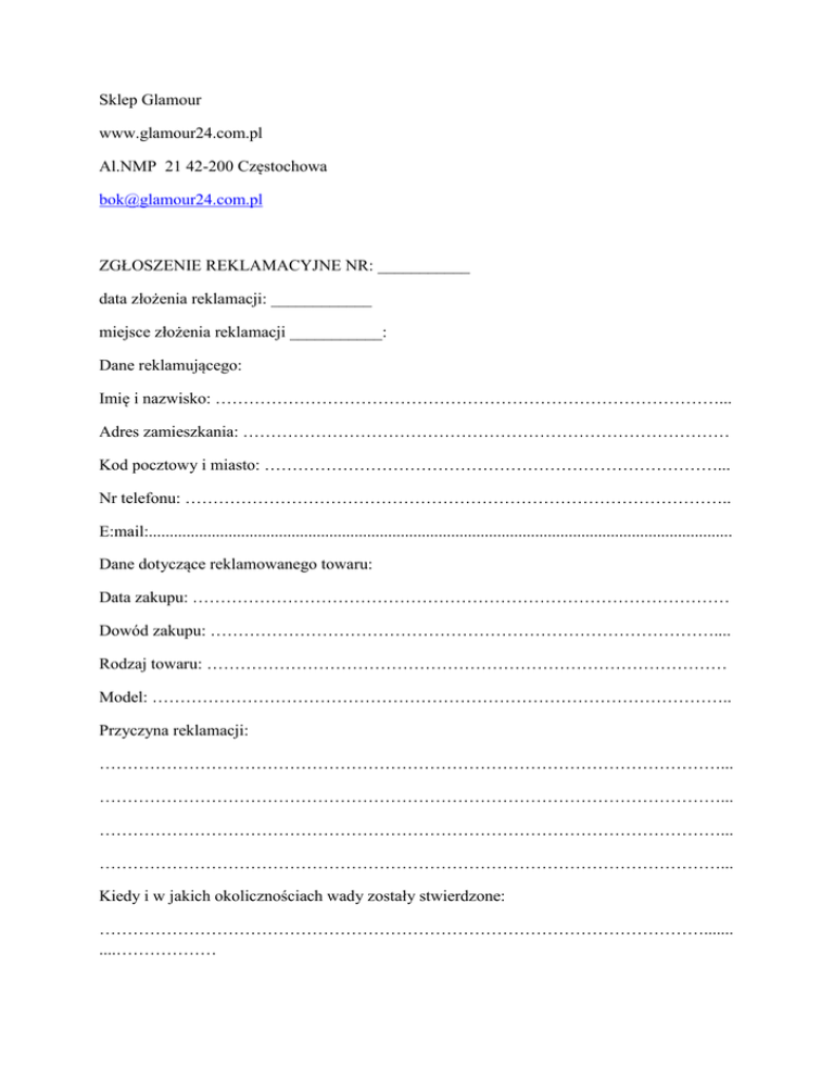 Sklep Glamour www.glamour24.com.pl Al.NMP 21 42-200 Częstochowa [email protected] ZGŁOSZENIE REKLAMACYJNE NR: ___________ data złożenia reklamacji: ____________ miejsce złożenia reklamacji ___________: Dane reklamującego: Imię i nazwisko: ………………………………………………………………………………... Adres zamieszkania: …………………………………………………………………………… Kod pocztowy i miasto: ………………………………………………………………………... Nr telefonu: …………………………………………………………………………………….. E:mail:........................................................................................................................................... Dane dotyczące reklamowanego towaru: Data zakupu: …………………………………………………………………………………… Dowód zakupu: ……………………………………………………………………………….... Rodzaj towaru: ………………………………………………………………………………… Model: ………………………………………………………………………………………….. Przyczyna reklamacji: …………………………………………………………………………………………………... …………………………………………………………………………………………………... …………………………………………………………………………………………………... …………………………………………………………………………………………………... Kiedy i w jakich okolicznościach wady zostały stwierdzone: ………………………………………………………………………………………………....... ....……………… ………...…………………………………………………………………………… Oświadczam, że reklamuję towar (proszę zaznaczyć odpowiednią opcję): z tytułu gwarancji jakości udzielonej na towar. z tytułu niezgodności towaru z umową, zgodnie z przepisami ustawy z dnia 27 lipca 2002 roku o szczególnych warunkach sprzedaży konsumenckiej oraz o zmianie Kodeksu Cywilnego Wnoszę o:.................................................................................................................................................... .............. Klient składający reklamację wyraża zgodę na przetwarzanie swoich danych osobowych w zakresie koniecznym do realizacji jego żądania, w szczególności dane te mogą zostać ujawnione podmiotowi dostarczającemu naprawiony/wymieniony towar. Jednocześnie Klient zachowuje prawo do wglądu, poprawy i usunięcia ich z bazy adresowej. Klient przyjmuje do wiadomości, że w przypadku zgłoszenia reklamacji z tytułu gwarancji jakości sklep/właściciel sklepu, w którym zgłoszona została reklamacja z tytułu gwarancji jakości pełni tylko i wyłącznie rolę pośrednika w przekazaniu towaru do gwaranta. Gwarancja nie wyłącza, nie zawiesza ani też w żaden inny sposób nie ogranicza uprawnień kupującego wynikających z ewentualnej niezgodności towaru z umową. ………………………………… Data, podpis klienta Sposób załatwienia reklamacji: ………………..………………..………………..………………..………………..………… ………………..………………..………………..………………..………………..………… ………………..………………..………………..………………..………………..………… ……………....…………………………… Data, podpis rozpatrującego ………………………………