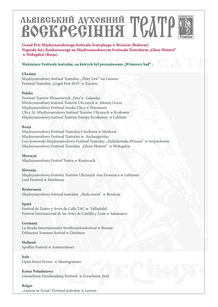 Grand Prix Międzynarodowego festiwalu Teatrąlnego w Brześciu (Białoruś) Nagroda Jury Konkursowego na Międzynarodoweym Festiwalu Teatralnym „Glosy Historii” w Wołogdzie (Rosja). Ważniejsze Festiwale teatralne, na których był prezentowany „Wiśniowy Sad” : Ukraina Międzynarodowy festiwal Teatralny „Złoty Lew” we Lwowie Festiwal Teatralny „Gogol Fest 2010” w Kijowie. Polska Festiwal Teatrów Plenerowych „Feta”w Gdansku Miedzynarodowy festiwal Teatrów Ulicznych w Jeleniej Gorze Międzynarodowy Festiwal Sztuka Ulicy w Warszawie Ulica 24. Miedzynarodowy festiwal Teatrów Ulicznych w Krakowie Międzynarodowy festiwal Teatrów Europy Środkowej w Lublinie Rosja Międzynarodowy Festiwal Teatralny Czechowa w Moskwie Międzynarodowy Festiwal Teatralny w Archangielsku Czechowowski Międzynarodowy Festiwal Teatralny „Melichowska Wiosna” w Serpuchowie Międzynarodowy Festiwal Teatralny „Głosy Historii” w Wołogdzie Słowacja Międzynarodowy Festiwl Teatru w Koszycach Slovenia Międzynarodowy Festiwla Teatrów Ulicznych Ana Desetnica w Lubljanie Lent Festiwal w Mariborze Byelorussia Międzynarodowy festiwal teatralny „Biała wieża” w Brześciu Spain Festival de Teatro y Artes de Calle TAC w Valladolid Festival Internacional de las Artes de Castilla y León w Salamance Germany La Strada Internationales Straßenzirkusfestival w Bremie Dülmener Sommer festival w Duelmen Holland Spoffiin Festival w Ammersfoort Italy Open Street Fermo w Montegranaro Korea Południowa Gweacheon Handmadang Festiwal w Gwacheon, Seul Belgia „Leuven in Scene” Festiwal teatralny w Leuven