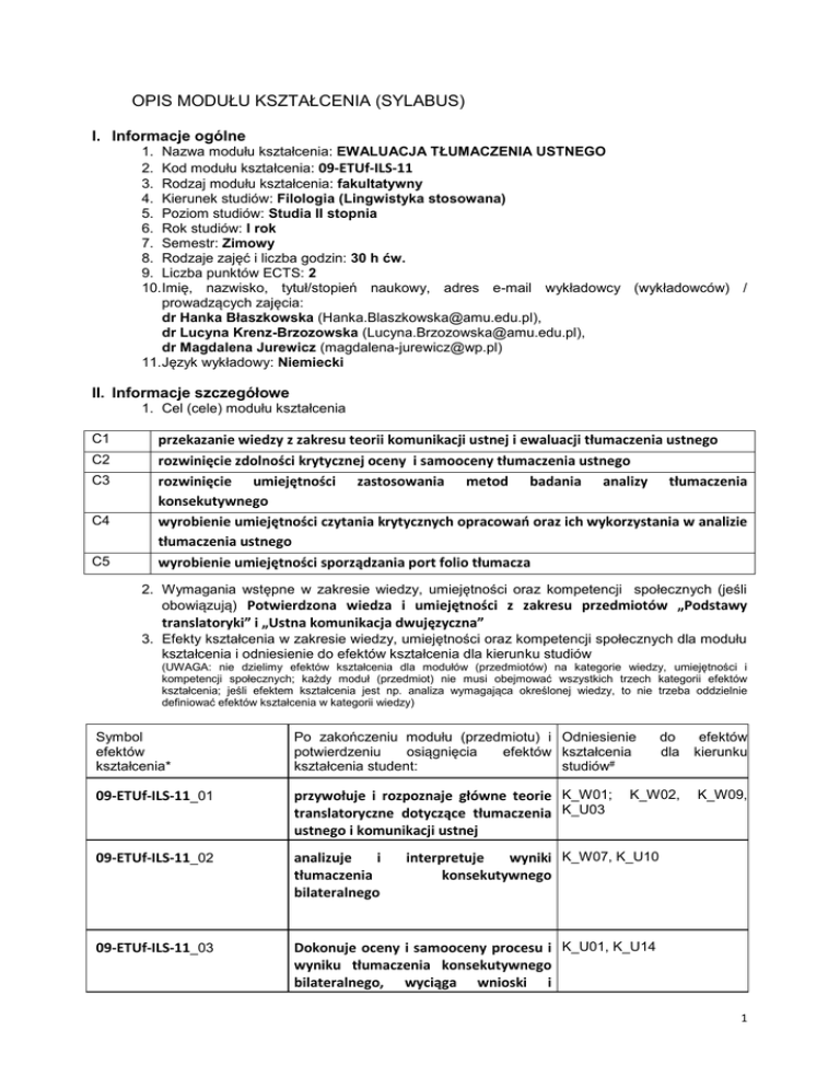 OPIS MODUŁU KSZTAŁCENIA (SYLABUS) I. Informacje ogólne 1. Nazwa modułu kształcenia: EWALUACJA TŁUMACZENIA USTNEGO 2. Kod modułu kształcenia: 09-ETUf-ILS-11 3. Rodzaj modułu kształcenia: fakultatywny 4. Kierunek studiów: Filologia (Lingwistyka stosowana) 5. Poziom studiów: Studia II stopnia 6. Rok studiów: I rok 7. Semestr: Zimowy 8. Rodzaje zajęć i liczba godzin: 30 h ćw. 9. Liczba punktów ECTS: 2 10. Imię, nazwisko, tytuł/stopień naukowy, adres e-mail wykładowcy (wykładowców) / prowadzących zajęcia: dr Hanka Błaszkowska ([email protected]), dr Lucyna Krenz-Brzozowska ([email protected]), dr Magdalena Jurewicz ([email protected]) 11. Język wykładowy: Niemiecki II. Informacje szczegółowe 1. Cel (cele) modułu kształcenia C1 C2 C3 C4 C5 przekazanie wiedzy z zakresu teorii komunikacji ustnej i ewaluacji tłumaczenia ustnego rozwinięcie zdolności krytycznej oceny i samooceny tłumaczenia ustnego rozwinięcie umiejętności zastosowania metod badania analizy tłumaczenia konsekutywnego wyrobienie umiejętności czytania krytycznych opracowań oraz ich wykorzystania w analizie tłumaczenia ustnego wyrobienie umiejętności sporządzania port folio tłumacza 2. Wymagania wstępne w zakresie wiedzy, umiejętności oraz kompetencji społecznych (jeśli obowiązują) Potwierdzona wiedza i umiejętności z zakresu przedmiotów „Podstawy translatoryki” i „Ustna komunikacja dwujęzyczna” 3. Efekty kształcenia w zakresie wiedzy, umiejętności oraz kompetencji społecznych dla modułu kształcenia i odniesienie do efektów kształcenia dla kierunku studiów (UWAGA: nie dzielimy efektów kształcenia dla modułów (przedmiotów) na kategorie wiedzy, umiejętności i kompetencji społecznych; każdy moduł (przedmiot) nie musi obejmować wszystkich trzech kategorii efektów kształcenia; jeśli efektem kształcenia jest np. analiza wymagająca określonej wiedzy, to nie trzeba oddzielnie definiować efektów kształcenia w kategorii wiedzy) Symbol efektów kształcenia* Po zakończeniu modułu (przedmiotu) i Odniesienie potwierdzeniu osiągnięcia efektów kształcenia kształcenia student: studiów# do dla efektów kierunku 09-ETUf-ILS-11_01 przywołuje i rozpoznaje główne teorie K_W01; translatoryczne dotyczące tłumaczenia K_U03 ustnego i komunikacji ustnej K_W02, K_W09, 09-ETUf-ILS-11_02 analizuje i tłumaczenia bilateralnego 09-ETUf-ILS-11_03 Dokonuje oceny i samooceny procesu i K_U01, K_U14 wyniku tłumaczenia konsekutywnego bilateralnego, wyciąga wnioski i interpretuje wyniki K_W07, K_U10 konsekutywnego 1 porządkuje efekty dyskusji 09-TUS-ILS-12_04 czyta ze zrozumieniem naukowe teksty K_U04 – K_U07, K_10, krytyczne i ocenia je, zna i prawidłowo K_U11, K_U13, K_K07, posługuje się podstawowymi pojęciami K_K01, K_K10 tranlatorycznymi z zakresu ewaluacji tłumaczenia ustnego 09-TUS-ILS-12_05 wykorzystuje opracowania krytyczne w K_W02, K_W09, analizie tłumaczenia konsekutywnego K_W03, K_W07, K_W11, K_05, K_U06 09-TUS-ILS-12_06 proponuje własne rozwiązania K_W01, K_U03, K_K01 translatorskie i bierze aktywny udział w dyskusji na zajęciach 09-TUS-ILS-12_07 zna zasady pisania port folio K_W01, K_U10, tłumaczenia konsekutywnego i potrafi K_K09, K_K10 samodzielnie je sporządzić K_K03, * kod modułu kształcenia, np. KHT_01 (KHT-kod modułu „Kataliza Heterogeniczna” w USOS) # efekty kształcenia dla kierunku studiów (np. K_W01, K_U01, ..) W – wiedza; U – umiejętności; K – kompetencje społeczne (wyszczególnione tylko w symbolach kierunkowych efektów kształcenia) 01, 02… – numer efektu kształcenia UWAGA! Zaleca się, aby, w zależności od modułu, liczba efektów kształcenia zawierała się w przedziale: 5-10. 4. Treści kształcenia Nazwa modułu kształcenia: EWALUACJA TŁUMACZENIA USTNEGO Symbol treści kształcenia* TK_01 TK_02 TK_03 TK_04 Opis treści kształcenia Odniesienie do efektów kształcenia modułu# Teorie językoznawcze i socjologiczne dotyczące komunikacji ustnej Analiza rozmowy (założenia w oparciu o etnometodologicznie 09-TUS-ILS-12_01, ufundowaną analizę konwersacyjną) 09-TUS-ILS-12_02 Elementy socjologii (teorie Ervinga Goffmana) Metody sporządzania transkryptów wypowiedzi mówionych Ćwiczenia w sporządzaniu transkryptów wypowiedzi 09-TUS-ILS-12_02, mówionych w jednym języku Ćwiczenia 09-TUS-ILS-12_03 w sporządzaniu transkryptów rozmów tłumaczonych konsekutywnie Teorie translatoryczne dotyczące tłumaczenia konsekutywnego Teorie translatoryczne dotyczące zasad ewaluacji i samooceny tłumaczenia ustnego Kryteria oceny tłumaczenia konsekutywnego bilateralnego Zasady sporządzania matryc oceny wyników tłumaczenia konsekutywnego Ćwiczenia w sporządzaniu matryc oceny wyników tłumaczenia konsekutywnego 09-TUS-ILS-12_02, 09-TUS-ILS-12_03, 09-TUS-ILS-12_07 09-TUS-ILS-12_03, 09-TUS-ILS-12_04, 09-TUS-ILS-12_07 2 Zasady sporządzania matryc samooceny tłumaczenia konsekutywnego Ćwiczenia w sporządzaniu matryc samooceny tłumaczenia konsekutywnego Zasady sporządzania port folio tłumaczenia 09-TUS-ILS-12_05, 09-TUS-ILS-12_06 konsekutywnego bilateralnego TK_05 * np. TK_01, TK_02, … # np. KHT_01 – kod modułu kształcenia wg tabeli w pkt. II 3 5. Zalecana literatura a) Best J. / Kalina S. (Hrsg.) (2002): Übersetzen und Dolmetschen. Eine Orientierungshilfe. Tübingen / Basel. b) Goffman, Erving (2006): Rytuał interakcyjny. Wydawnictwo Naukowe PWN, Warszawa. c) Kadric, Mira / Kaindl, Klaus / Kaiser-Cooke, Michele (2005): Translatorische Methodik. Facultas Verlag- Und Buchhandels AG, Wien. d) Kautz, Ulrich (2002): Handbuch Didaktik des Übersetzens und Dolmetschens. München. e) Rancew-Sikora Dorota (2007): Analiza konwersacyjna jako metoda badań rozmów codziennych. Trio, Warszawa. f) Tryuk, Małgorzata (2006): Przekład ustny środowiskowy. Wydawnictwo Naukowe PWN, Warszawa. g) Snell-Hornby Mary / Hönig Hans G. / Kussmaul Paul / Schmitt Peter A. (Hrsg.) (1998): Handbuch Translation. 
