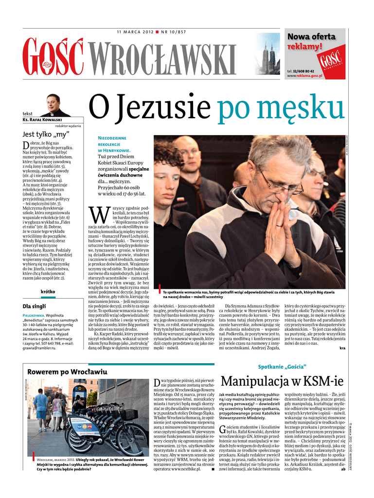 11 marca 2012 _ nr 10/857 Nowa oferta reklamy! tel. 32/608 80 42 www.reklama.gosc.pl redaktor wydania Jest tylko „my” D obrze, że Bóg nas przywołuje do porządku. Nas księży też. To miał być numer poświęcony kobietom, które: łączą pracę zawodową z rolą żony i matki (str. 5), wykonują „męskie” zawody (str. 4) i nie poddają się przeciwnościom (str. 4). A tu masz: ktoś organizuje rekolekcje dla mężczyzn (obok), a do Wrocławia przyjeżdżają znani politycy – też mężczyźni (str. 7). Mężczyzna dyrektoruje szkole, która zorganizowała wspaniałe rekolekcje (str. 6) i wygłasza wykład na „Fides et ratio” (str. 8). Dobrze, że w czasie tego wykładu wróciliśmy do początków. Wtedy Bóg na swój obraz stworzył mężczyznę i niewiastę. Razem. Podziały to ludzka rzecz. Tym bardziej wspieramy singli, którzy wybiorą się na pielgrzymkę do św. Józefa, i małżeństwa, które chcą funkcjonować razem jako zespół (str. 2). krótko Dla singli Pielgrzymka. Wspólnota „Benedictus” zaprasza samotnych 30- i 40-latków na pielgrzymkę autokarową do sanktuarium św. Józefa w Kaliszu. Wyjazd 24 marca o godz. 8. Informacje i zapisy tel. 507 643 798, e-mail: [email protected]. O Jezusie po męsku Niecodzienne rekolekcje w Henrykowie. Tuż przed Dniem Kobiet Skauci Europy zorganizowali specjalne ćwiczenia duchowne dla… mężczyzn. Przyjechało 60 osób w wieku od 17 do 56 lat. ks. Rafał Kowalski tekst Ks. Rafał Kowalski W szyscy zgodnie podkreślali, że ten czas był im bardzo potrzebny. – Współczesna cywilizacja zatarła coś, co określiłbym naturalną komunikacją między mężczyznami – tłumaczył Paweł Lochyński, hufcowy dolnośląski. – Tworzy się sztuczne bariery międzypokoleniowe, tymczasem w gronie, w którym są dziadkowie, ojcowie, studenci i uczniowie szkół średnich, następuje przekaz doświadczeń. Wzajemnie uczymy się od siebie. To jest budujące zarówno dla najmłodszych, jak i najstarszych uczestników – zaznaczył. Zwrócił przy tym uwagę, że bez względu na wiek mężczyzna musi umieć podejmować decyzje. Jego zdaniem, dobrze, gdy robi to, kierując się nauczaniem Jezusa. – Jeśli mężczyzna nie podejmie decyzji, zrobi to za niego życie. To spotkanie wzmacnia nas, byśmy potrafili wziąć odpowiedzialność nie tylko za siebie i swoje wybory, ale także za osoby, które Bóg postawił lub postawi na naszej drodze. Ks. Kacper Radzki, który przewodniczył rekolekcjom, wskazał uczestnikom Syna Bożego jako „instrukcję” daną od Boga w dążeniu mężczyzny Marcin Jędrzejczak Rowerem po Wrocławiu do świętości. – Jezus często odchodził na górę, przebywał sam ze sobą. Poza tym był bardzo konkretny, przejrzysty, jego słowa zawsze miały pokrycie w tym, co robił, stawiał wymagania. Przy tym był bardzo romantyczny. Potrafił się wzruszyć, zapłakać i w wielu sytuacjach zachować w sposób, który dziś często przedstawia się jako niemęski – mówił. Dla Szymona Adamusa z Szydłowca rekolekcje w Henrykowie były czasem powrotu do korzeni. – Dwa lata temu tutaj złożyłem przyrzeczenie harcerskie, zobowiązując się do służenia młodszym – wspominał. Podkreśla, że pozytywne jest to, iż poza modlitwą i konferencjami jest wiele czasu na rozmowy z innymi uczestnikami. Andrzej Żogała, który do cysterskiego opactwa przyjechał z okolic Tychów, zwrócił natomiast uwagę, że męskie rekolekcje różnią się bardzo od parafialnych czy przeżywanych w duszpasterstwie akademickim. – To jest czas odejścia na pustynię, ale przede wszystkim jest to nasz czas. Tutaj rekolekcjonista mówi do nas i o nas. kra Spotkanie „Gościa” D wa tygodnie później, niż pierwotnie planowano zostaną uruchomione stacje Wrocławskiego Roweru Miejskiego. Od 15 marca, przez cały sezon wiosenno-letni, mieszkańcy miasta i turyści będą mogli skorzystać ze 185 dwuśladów rozstawionych w 25 punktach stolicy Dolnego Śląska. Władze Wrocławia tłumaczą, że opóźnienie jest spowodowane niepewną aurą z minusowymi temperaturami oraz częstymi opadami. W pierwszym sezonie funkcjonowania miejskie rowery cieszyły się ogromnym zainteresowaniem. 22 tys. użytkowników skorzystało z nich w sumie ok. 100 tys. razy. Aby w nowym sezonie móc wypożyczyć WRM, trzeba się jednorazowo zarejestrować na stronie operatora: www.nextbike.pl. • Manipulacja w KSM-ie Jak media kształtują opinię publiczną i czy można bronić się przed nieetyczną perswazją? – dowiedzieli się uczestnicy kolejnego spotkania, przygotowanego przez Katolickie Stowarzyszenie Młodzieży. G ościem studentów i licealistów był ks. Rafał Kowalski, dyrektor wrocławskiego GN, którego przedłożenie na temat manipulacji w mediach było wstępem do dyskusji o korzystaniu ze środków społecznego przekazu. Ksiądz redaktor zwrócił uwagę, że prasa, radio, telewizja i internet mają służyć nie tylko przekazowi informacji, ale także tworzeniu wspólnoty między ludźmi. – Źle, jeśli dziennikarze dzielą, jeszcze gorzej, gdy manipulują, kształtując myślenie odbiorców według wcześniej powziętych kryteriów i opinii – mówił, wskazując na najczęściej stosowane metody manipulacji w środkach społecznego przekazu i przestrzegając przed bezkrytycznym przyjmowaniem informacji podawanych przez media. – Chcieliśmy przyjrzeć się bliżej mediom i po dyskusji, jaka się wywiązała, oraz zadawanych pytaniach widać, jak bardzo to spotkanie było potrzebne – podsumował ks. Arkadiusz Krziżok, asystent diecezjalny KSM-u. ab 11 marca 2012 Gość Niedzielny Wrocław, marzec 2012. Ubiegły rok pokazał, że Wrocławski Rower Miejski to wygodna i szybka alternatywa dla komunikacji zbiorowej. Czy w tym roku będzie podobnie? To spotkanie wzmacnia nas, byśmy potrafili wziąć odpowiedzialność za siebie i za tych, których Bóg stawia na naszej drodze – mówili uczestnicy gość 