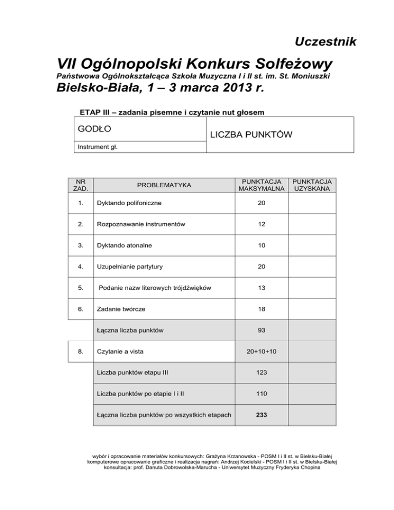 Uczestnik VII Ogólnopolski Konkurs Solfeżowy Państwowa Ogólnokształcąca Szkoła Muzyczna I i II st. im. St. Moniuszki Bielsko-Biała, 1 – 3 marca 2013 r. ETAP III – zadania pisemne i czytanie nut głosem GODŁO LICZBA PUNKTÓW Instrument gł. NR ZAD. PROBLEMATYKA PUNKTACJA MAKSYMALNA 1. Dyktando polifoniczne 20 2. Rozpoznawanie instrumentów 12 3. Dyktando atonalne 10 4. Uzupełnianie partytury 20 5. Podanie nazw literowych trójdźwięków 13 6. Zadanie twórcze 18 Łączna liczba punktów 93 8. Czytanie a vista PUNKTACJA UZYSKANA 20+10+10 Liczba punktów etapu III 123 Liczba punktów po etapie I i II 110 Łączna liczba punktów po wszystkich etapach 233 wybór i opracowanie materiałów konkursowych: Grażyna Krzanowska - POSM I i II st. w Bielsku-Białej komputerowe opracowanie graficzne i realizacja nagrań: Andrzej Kocielski - POSM I i II st. w Bielsku-Białej konsultacja: prof. Danuta Dobrowolska-Marucha - Uniwersytet Muzyczny Fryderyka Chopina 1. Dyktando polifoniczne. Uzupełnij zapis nutowy w zaznaczonych miejscach. Liczba powtórzeń: 6x Tomaso Albinoni – Balletto nr 1 C-dur z 12 Balletti a tre 4 p. 4 p. 6 p. 8 p. 12 p. 10 p. 8 p. 8 p. 4 p. 8 p. 8 p. +1 p. każda prawidłowa nuta - gł. 1 łącznie 24 p. - gł. 2 łącznie 24 p. - gł. 3 łącznie 32 p. - 1 p. nieprawidłowość rytmiczna w obrębie ramki 2 :4 2. Rozpoznawanie instrumentów. a) Podaj nazwy 6 instrumentów realizujących fragment prezentowanego utworu Liczba powtórzeń: 2x Frederic Rzewski – Pocket Symphony 1 2 3 4 5 6 + 1 p. każda prawidłowo podana nazwa instrumentu b) Na tle niekonwencjonalnej partii fortepianu (gra na strunach, efekty perkusyjne) pojawia się kolejno 7 instrumentów perkusyjnych. Wymień je. Uwaga - pierwszy instrument to trójkąt, który usłyszysz po ok. 10 sekundach. Liczba powtórzeń: 3x Kazimierz Serocki – Fantasmagoria 1 trójkąt 2 3 4 5 6 7 + 1 p. każda prawidłowo podana nazwa instrumentu Suma a-b 3 3. Dyktando atonalne. Uzupełnij zapis partii fagotu w zaznaczonych miejscach Liczba powtórzeń: 8x Robert Rønnes – Sonata na fagot nr 2 “The Russian”, cz. III 4 +1 każda prawidłowo zapisana nuta - ½ każda niedokładność wysokościowa lub rytmiczna :2 4. Uzupełnianie partytury Uzupełnij tekst muzyczny partytury w miejscach zaznaczonych na żółto. W ramkach zacieniowanych szarym kolorem nic nie wpisuj – znajduje się tam zdwojenie partii instrumentu z żółtych pól. Partytura in C. Liczba powtórzeń: 8x Dymitr Szostakowicz – V Symfonia, cz. I 5 16 p. 4 p. 5 p. 6 6 p. 7 p. 6 p. 17 p. 8 p. 6 p. 5 p. +1 p. każda prawidłowa nuta + 1 p. za dwie pauzy ćwierćnutowe w taktach 23 i 24 :4 7 5. Podanie nazw literowych trójdźwięków. Pod najwyższym głosem chorału wpisz nazwy literowe trójdźwięków. Wpisywanie przewrotów nie jest wymagane. Pochód trójdźwięków odbywa się na organowej nucie pedałowej C. Liczba powtórzeń: 3x Charles Ives – Psalm 90 c 1 + 2 p. każda prawidłowo podana nazwa literowa trójdźwięku 6. Zadanie twórcze. Potraktuj poniższe zadanie jako rekonstrukcję zniszczonego rękopisu utworu Michała Kleofasa Ogińskiego. Uzupełnij brakujące fragmenty utworu. Nie oczekujemy odtworzenia takiego samego przebiegu muzycznego jak w oryginale. Zadbaj o ładny rysunek melodyczny, zgodność harmoniczną i jednolitość stylistyczną. 8 Michał Kleofas Ogiński - Romance maksymalnie + 3 p. za każdy uzupełniony fragment 9 10 11 12
