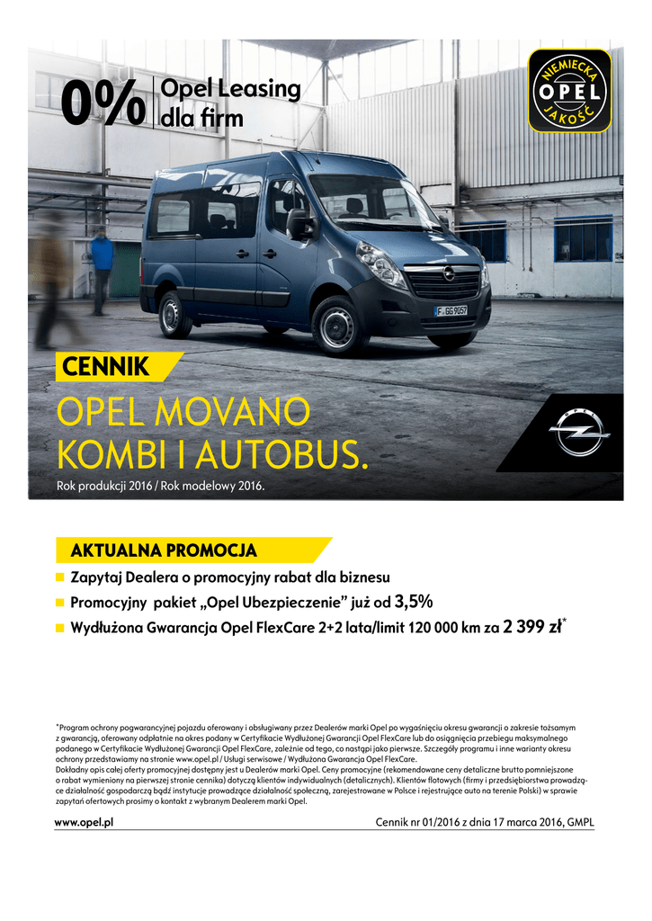 0% Opel Leasing dla firm CENNIK OPEL MOVANO KOMBI I AUTOBUS. Rok produkcji 2016 / Rok modelowy 2016. AKTUALNA PROMOCJA Zapytaj Dealera o promocyjny rabat dla biznesu Promocyjny pakiet „Opel Ubezpieczenie” już od 3,5% Wydłużona Gwarancja Opel FlexCare 2+2 lata/limit 120 000 km za 2 399 zł* *Program ochrony pogwarancyjnej pojazdu oferowany i obsługiwany przez Dealerów marki Opel po wygaśnięciu okresu gwarancji o zakresie tożsamym z gwarancją, oferowany odpłatnie na okres podany w Certyfikacie Wydłużonej Gwarancji Opel FlexCare lub do osiągnięcia przebiegu maksymalnego podanego w Certyfikacie Wydłużonej Gwarancji Opel FlexCare, zależnie od tego, co nastąpi jako pierwsze. Szczegóły programu i inne warianty okresu ochrony przedstawiamy na stronie www.opel.pl / Usługi serwisowe / Wydłużona Gwarancja Opel FlexCare. Dokładny opis całej oferty promocyjnej dostępny jest u Dealerów marki Opel. Ceny promocyjne (rekomendowane ceny detaliczne brutto pomniejszone o rabat wymieniony na pierwszej stronie cennika) dotyczą klientów indywidualnych (detalicznych). Klientów flotowych (firmy i przedsiębiorstwa prowadzące działalność gospodarczą bądź instytucje prowadzące działalność społeczną, zarejestrowane w Polsce i rejestrujące auto na terenie Polski) w sprawie zapytań ofertowych prosimy o kontakt z wybranym Dealerem marki Opel. www.opel.pl Cennik nr 01/2016 z dnia 17 marca 2016, GMPL Cennik – Opel Movano Kombi/Autobus rok produkcji 2016, rok modelowy 2016 Modele i wersje 2.3 CDTI BiTurbo 145 KM S/S 2.3 CDTI BiTurbo 170 KM S/S 2.3 CDTI BiTurbo 145 KM S/S 2.3 CDTI BiTurbo 163 KM S/S L1H1 FWD 3,0t Kombi 9-os. M6 145 840 149 790 – – L1H1 FWD 3,3t Kombi 9-os. M6 148 340 152 290 – – L2H2 FWD 3,3t Kombi 9-os. M6 151 140 155 090 – – L2H2 FWD 3,5t Kombi 9-os. M6 153 140 157 090 – – L3H2 FWD 3,9t Autobus 17-os. M6 – – 190 840 192 190 L – dostępne długości nadwozia: 1 = krótka, 2 = średnia, 3 = długa H – dostępne wysokości nadwozia: 1 = niska, 2 = średnia FWD = napęd na przednie koła Wszystkie ceny zawarte w niniejszym cenniku są rekomendowanymi cenami detalicznymi brutto, zawierającymi opłatę za transport samochodu, podatek VAT oraz podatek akcyzowy zależny od typu homologacji i od pojemności silnika. Dokładny opis całej oferty promocyjnej dostępny jest u Dealerów marki Opel. Ceny promocyjne dotyczą klientów indywidualnych (detalicznych). Klientów flotowych (firmy i przedsiębiorstwa prowadzące działalność gospodarczą bądź instytucje prowadzące działalność społeczną, zarejestrowane w Polsce i rejestrujące auto na terenie Polski) w sprawie zapytań ofertowych prosimy o kontakt z wybranym Dealerem marki Opel. Dane techniczne silników Kombi i Autobus Kombi 2.3 CDTI BiTurbo 145 KM S/S Kombi 2.3 CDTI BiTurbo 170 KM S/S Autobus 2.3 CDTI BiTurbo 145 KM S/S Autobus 2.3 CDTI BiTurbo 163 KM S/S 6-biegowa manualna 6-biegowa manualna 6-biegowa manualna 6-biegowa manualna 2 299 2 299 2 299 2 299 Moc maksymalna, kW/KM przy obr./min 107 / 145 przy 3 500 125/ 170 przy 4 750-6 000 107 / 145 przy 3 500 120 / 165 przy 3 500 Maks. moment obrotowy, Nm przy obr./min 350 przy 1 500-2 750 350 przy 1 500-2 750 350 przy 1 500-2 750 360 przy 1 500-3 000 Skrzynie biegów Pojemność skokowa, cm3 Norma emisji spalin Euro 6 Euro 6 Euro 6 Euro 6 Zużycie paliwa, cykl mieszany, l/100 km* 6,6–6,3 6,6–6,3 b.d. b.d. Emisja CO2, cykl mieszany, g/km* 197–193 197–193 b.d. b.d. Obowiązkowe przeglądy okresowe co 40 000 km lub 2 lata co 40 000 km lub 2 lata co 30 000 km lub 1 rok co 30 000 km lub 1 rok * Wszystkie informacje były aktualne w momencie publikacji materiału. Zastrzegamy sobie prawo do zmian specyfikacji produktów w dowolnym czasie. Aktualnych informacji o ofercie udzielają Dealerzy marki Opel. Wszystkie dane dotyczą modeli podstawowych z wyposażeniem seryjnym. Wartości zużycia paliwa i emisji spalin dla silników spełniających normy Euro 6 zostały określone według dyrektyw WE 715/2007 i WE 692/2008 oraz 80/1268/EWG i 2004/3/WE, na podstawie oficjalnych testów w warunkach laboratoryjnych, i mierzone są dla pojazdów gotowych do jazdy, zgodnie z tymi regulacjami. Faktyczne wartości mogą różnić się od podanych w zależności od zachowania kierowcy, warunków atmosferycznych, nawierzchni, jak i innych czynników natury nietechnicznej. Dodatkowe wyposażenie może spowodować wyższe spalanie i emisję CO 2 , zwiększenie masy własnej pojazdu, a co za tym idzie nacisku na osie i jednoczesne ograniczenie ładowności pojazdu i dopuszczalnej masy całkowitej przyczepy. Może również prowadzić do zmniejszenia maksymalnej prędkości i uzyskiwanych przyśpieszeń. Zmierzone osiągi dotyczą pojazdu z kierowcą o masie 75 kg i obciążeniem 125 kg. Wymiary, masy, pojemności Nadwozie Przestrzeń ładunkowa (wg ECIE, w zależności od wersji) Długość całkowita (mm): L1: 5 048, L2: 5 548, L3: 6 198 Długość przestrzeni ład. (Kombi z 3 rzędem siedzeń, mm): L1: 948, L2: 1 448 Wysokość całkowita (mm, bez obciążenia): H1: 2 287, H2: 2 495 - 2 482, Bus: 2 488 Długość przestrzeni ład. (Kombi z 2 rzędem siedzeń, mm): L1: 1 757, L2: 2 257 Szerokość między nadkolami (Kombi, mm): 1 380 Szerokość ze złożonymi/rozłożonymi lusterkami (mm): 2 070/2 470 Wysokość wnętrza pojazdu (mm): H1: 1 650, H2: 1 850 Rozstaw osi (mm): 3 182/3 682/4 332 Rozstaw kół przód/tył (mm): 1 750/ 1 730 Masy (wg ECE) Dopuszczalna masa całkowita (w zależności od wersji, kg): 2 980 - 3 870 Średnica zawracania (w zależności od wersji) Ładowność (w zależności od wersji, kg): 927-1 377 Między krawężnikami: 12,0-15,7 m Między ścianami: 12,5-16,2 m Maksymalna liczba pasażerów: 9 w Kombi, 17 w Bus Cennik Opla Movano Kombi/Bus, rok produkcji 2016 nr 01/2016 z dnia 17 marca 2016 1/3 Wyposażenie standardowe / opcje dodatkowe NADWOZIE Lakier metaliczny Zbiornik paliwa 80 litrów Większy zbiornik paliw