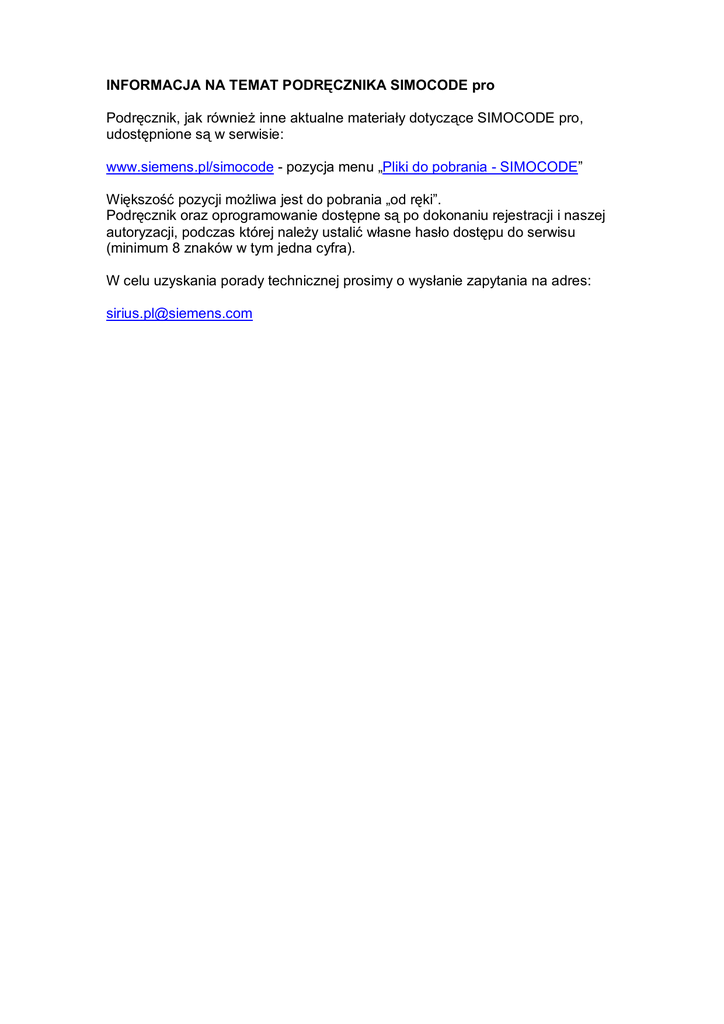 INFORMACJA NA TEMAT PODRĘCZNIKA SIMOCODE pro Podręcznik, jak również inne aktualne materiały dotyczące SIMOCODE pro, udostępnione są w serwisie: www.siemens.pl/simocode - pozycja menu „Pliki do pobrania - SIMOCODE” Większość pozycji możliwa jest do pobrania „od ręki”. Podręcznik oraz oprogramowanie dostępne są po dokonaniu rejestracji i naszej autoryzacji, podczas której należy ustalić własne hasło dostępu do serwisu (minimum 8 znaków w tym jedna cyfra). W celu uzyskania porady technicznej prosimy o wysłanie zapytania na adres: [email protected]