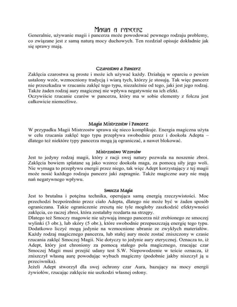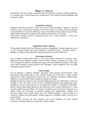 Magia a pancerz Generalnie, używanie magii i pancerza może powodować pewnego rodzaju problemy, co związane jest z samą naturą mocy duchowych. Ten rozdział opisuje dokładnie jak się sprawy mają. Zaklęcia czarostwa są proste i może ich używać każdy. Działają w oparciu o pewien ustalony wzór, wzmocniony tradycją i wiarą tych, którzy je stosują. Tak więc pancerz nie przeszkadza w rzucaniu zaklęć tego typu, niezależnie od tego, jaki jest jego rodzaj. Także żaden rodzaj aury magicznej nie wpływa negatywnie na ich efekt. Oczywiście rzucanie czarów w pancerzu, który ma w sobie elementy z folczu jest całkowicie niemożliwe. W przypadku Magii Mistrzostw sprawa się nieco komplikuje. Energia magiczna użyta w celu rzucania zaklęć tego typu przepływa swobodnie przez i dookoła Adepta – dlatego też niektóre typy pancerza mogą ją ograniczać, a nawet blokować. Jest to jedyny rodzaj magii, który z racji swej natury pozwala na noszenie zbroi. Zaklęcia bowiem splatane są jako wzorce dookoła maga, za pomocą siły jego woli. Nie wymaga to przepływu energii przez niego, tak więc Adept korzystający z tej magii może nosić każdego rodzaju pancerz jaki zapragnie. Także magiczne aury nie mają nań negatywnego wpływu. Jest to brutalna i potężna technika, operująca samą energią rzeczywistości. Moc przechodzi bezpośrednio przez ciało Adepta, dlatego nie może być w żaden sposób ograniczana. Takie ograniczenie zresztą nie tyle mogłoby zaszkodzić efektywności zaklęcia, co raczej zbroi, która zostałaby rozdarta na strzępy. Dlatego też Smoczy magowie nie używają innego pancerza niż zrobionego ze smoczej wylinki (3 obr.), lub skóry (5 obr.), które swobodnie przepuszczają energię tego typu. Dodatkowo liczyć mogą jedynie na wzmocnione ubranie ze zwykłych materiałów. Każdy rodzaj magicznego pancerza, lub stałej aury może zostać zniszczony w czasie rzucania zaklęć Smoczej Magii. Nie dotyczy to jedynie aury eterycznej. Oznacza to, iż Adept, który jest chroniony za pomocą stałego pola magicznego, rzucając czar Smoczej Magii musi przejść udany test S.W. Niepowodzenie w teście oznacza, iż zniszczył własną aurę powodując wybuch magiczny (podobnie jakby niszczył ją u przeciwnika). Jeżeli Adept stworzył dla swej ochrony czar Aura, bazujący na mocy energii żywiołów, rzucając zaklęcie nie uszkodzi własnej osłony. ł ą Także i ta technika magii wymaga tego, aby nie ograniczać przepływu energii. Choć ograniczenie to tutaj osłabiałoby znacznie siłę zaklęcia, co powoduje wzrost jego kosztu. Pancerz wszelkiego rodzaju wywołuje wiec ten efekt, iż rzucający czar Adept musi wydać dodatkowo tyle punktów Energii ile obrony liczy jego najmocniejsza zbroja. Magowie wiec korzystają z niej raczej niechętnie i wolą wzmocnione ubranie oraz aury i pancerze magiczne. Albowiem tego typu ochrona nie koliduje z ich sposobem rzucania czarów i nie utrudnia go. Sztuka ta wpływa na byty poza Adeptem, wydawałoby się więc, iż pancerz nie przeszkadza w niej. Niestety, metale mają moc wiązania energii duchowej i utrudniania jej przepływu. Są także uważane przez wiele bytów duchowych za nienaturalne i budzą ich niechęć. Dlatego też szamani, druidzi i inni zaklinacze duchów, zwykle odziewają się jedynie w pancerze ze skór lub kości. Założenie na siebie zbroi metalowej zupełnie bowiem uniemożliwia korzystanie z zaklęć tego rodzaju. ś Niemagiczny pancerz nie ma żadnego wpływu na Zdolności Astralne, które użytkowane są w Świecie Snów. W czasie OoBE taka zbroja nie pojawia się na Adepcie, a więc nie ogranicza go. Jednakże, gdy pragnie on używać swych zdolności w Świecie Materialnym, lub też odziany w zbroję magiczną rzuca czary w astralu – podlega podobnym ograniczeniom jak w przypadku Władania Energią – tzn. obrona pancerza zwiększa koszt energetyczny rzucanych przez niego zaklęć. Zasada ta jednak nie stosuje się do zbroi powstałych przy pomocy czaru Marzenie, ani do zbroi srebrnych. Może on użytkować je normalnie. Także żaden rodzaj aury ochronnej nie ma negatywnego wpływu na jego zaklęcia. ł ń Moc kapłanów działa, dzięki błogosławieństwu boskiemu. Oznacza to, iż kapłani mogą nosić taki rodzaj zbroi, jaki podoba się ich Bogu. Bogowie Wojny zezwalają na noszenie każdego rodzaju pancerza (także metalowego). Bogowie Opiekuńczy jedynie pancerzy niemetalowych. Bogowie Mistyczni zaś są przeciwni ograniczaniu przepływu energii, ich wyznawcy mogą nosić jedynie wzmacniane szaty ze zwykłego materiału. Oczywiście wszelkiego rodzaju aury ochronne nie obniżają efektywności magii kapłańskiej.