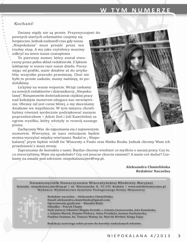 W TYM NUMERZE Kochani! Zmiany nigdy nie są proste. Przyzwyczajeni do pewnych utartych schematów czujemy się bezpieczni. Jednak nadszedł czas gdy nasza „Niepokalana” musi przejść przez ten trudny etap. A my jako czytelnicy musimy odkryć na nowo nasze czasopismo. To pierwszy numer, który został stworzony przez pełen skład redaktorski. Z lękiem oddajemy w wasze ręce nasze dzieło. Poczynając od grafiki, nazw działów aż do artykułów, wszystko przeszło przemianę. Choć nie było to proste zadanie, mamy nadzieję, że podołaliśmy. Liczymy na wasze wsparcie. Wciąż czekamy na nowych redaktorów i dziennikarzy „Niepokalanej”. Niesamowite doświadczenie ciężkiej pracy nad kolejnym numerem ubogaca nas wewnętrznie. Obrany cel jest coraz bliżej, a my doceniamy działanie we wspólnocie. W tym miejscu chcielibyśmy również serdecznie podziękować naszym poprzedniczkom – Adzie Zoń i Joli Kamińskiej za ogrom wysiłku, który włożyły w rozwój naszego pisma. Zachęcamy Was do zapoznania się z najnowszym numerem. Wierzymy, że nasz entuzjazm będzie można wyczytać między wierszami. Nadal w „ Niepokalanej” prym będzie wiódł św. Wincenty a Paulo oraz Matka Boska. Jednak chcemy Wam ich przedstawić z innej strony. Zapraszamy do kontaktu z nami. Bardzo chcemy wiedzieć co myślicie o naszej pracy. Czy to, co stworzyliśmy, Wam się spodobało? Czy coś jeszcze chcecie zmienić? A może coś dodać? Czekamy na emaile pod adresem: [email protected]. Aleksandra Chmielińska Redaktor Naczelna Dwumiesięcznik Stowarzyszenia Wincentyńskiej Młodzieży Maryjnej Kontakt: [email protected] | ul. Warszawska 8, 31-155 Kraków | www.mlodziezmaryjna.pl Wydawca: Wydawnictwo Instytutu Teologicznego Księży Misjonarzy Redaktor naczelna – Aleksandra Chmielińska Email: [email protected] Opracowanie graficzne – Klaudia Biała Okładka – Patryk Ciepły Stali autorzy tekstów: Magda Drożdż, s. Jolanta Janiszewska, Jola Kamińska, s. Jolanta Marek, Danuta Piekarz, Anna Przybyła, Joanna Suchanecka, Paulina Szumna, ks. Tomasz Ważny, ks. Marcin Wróbel, Kinga Zając Redakcja zastrzega sobie prawo do korekty nadsyłanych tekstów. NIEPOKALANA 4/2013 3 Od ZARZĄdU SERCE JEST B O G AT S Z E GdY BiJE dlA iNNYCh Kraków, 1 sierpnia 2013r. Cześć Maryi! Witajcie Kochan! Piszę te słowa kilka dni po decyzji Papieża Franciszka o wyborze miasta Krakowa na miejsce spotkania Światowych Dni Młodzieży w 2016 roku. Mam jeszcze świeżo w pamięci spotkanie młodych w Madrycie gdzie z kilkuosobową delegacją mogliśmy brać udział nie tylko w Światowych Dniach Młodzieży, ale również w spotkaniu Młodzieży Wincentyńskiej z całego świata. Podziwialiśmy profesjonalizm, trud i zaangażowanie naszych braci i sióstr z Hiszpanii, którzy często rezygnując z wakacji włączyli się w to wielkie dzieło organizacji tych dni. Muszę przyznać, że bardzo się cieszę, że będziemy w Polsce gospodarzami tego wydarzenia i będziemy mogli zaprosić młodych ludzi z całego świata, aby właśnie u nas, „w naszym domu” spotkać się razem i podzielić swoją wiarą w Jezusa i pobożnością Maryjną. Cieszę się podwójnie ponieważ wreszcie nasza polska młodzież zobaczy, że wiara w Jezusa jest „trendy” jest „cool” jest czymś z czego można być dumnym. Cieszę się również z tego powodu, że nasza Młodzież Maryjna ujrzy na własne oczy, iż do Stowarzyszenia nie przynależy się 4 NIEPOKALANA 4/2013 tylko do ostatnich klas gimnazjum, ale że to dopiero początek wspaniałej młodzieńczej przygody, przeżywanej razem z innymi młodymi pod znakiem Cudownego Medalika. Skończyły się wakacje, dlatego w tym miejscu pragnę bardzo serdecznie podziękować wszystkim kapłanom, siostrom Szarytkom i z innych wspólnot zakonnych za trud przygotowania i poprowadzenia rekolekcji wakacyjnych, które przybierają rozmaitą formę i są skierowane do wszystkich kategorii wiekowych. Dziękuję Rodzicom za ich wrażliwość w chrześcijańskim wychowywaniu swoich dzieci. Dziękuję Animatorom, którzy swoją posługą wspierali prowadzących w odpowiedzialnym dziele formacji chrześcijańskiej. Dziękuję wszystkim uczestnikom spośród dzieci i młodzieży i mam głęboką nadzieję, że ten czas zaowocuje kiedyś ich pięknym i szlachetnym życiem. Miesiąc wrzesień to pamięć o wyjątkowym człowieku św. Wincentym a Paulo, który w pocie czoła i trudzie rąk przekonuje nas, że „serce jest bogatsze, gdy bije dla innych, a zwłaszcza dla ubogich”. W tym roku wiary pracujemy nad tym, aby nasza wiara była mocna i abyśmy tę wiarę zanosili tym, którzy jej nie mają albo ją stracili. Od ZARZĄdU Miesiąc październik jest miesiącem różańca. Kiedyś pisałem o grupach różańcowych w każdej wspólnocie i pragnę teraz zapytać na łamach naszego czasopisma w jakiej są one kondycji, czy jesteśmy wierni przynajmniej jednej dziesiątce różańca codziennie? Ofiarujmy Maryi naszą codzienność, a Ona nasza Matka za przyczyną Jezusa będzie nam hojnie wypraszała łaski, aby każdy dzień był przez nas przeżyty jak najlepiej. Czego Wam i sobie życzę. Szczęść Boże. WMM WiElKA MOC MiŁOSiERdZiA ks. Jacek Kuziel Dyrektor Krajowy WMM w Polsce Cześć Maryi! Moi Drodzy, witam Was bardzo serdecznie po wakacjach! Mam nadzieję, że dla wszystkich był to czas odpoczynku, ale również szkoły… Tak, szkoły - szkoły kontaktu z Panem Bogiem i ludźmi. Na pewno wielu z Was wzięło udział w wakacyjnych wyjazdach i rekolekcjach. Liczymy na relacje z tych przeżyć! Zapewne każdy z Was już wie, że kolejne Światowe Dni Młodzieży odbędą się w naszym ukochanym Krakowie w 2016 roku. Przed nami mnóstwo przygotowań, ale i tyle samo radości z racji tego wydarzenia. Już dziś zachęcam Was bardzo serdecznie do włączenia się w organizację tego spotkania oraz zachęcam do modlitwy w tej intencji. Jeśli o spotkaniach mowa - zapraszam Was s