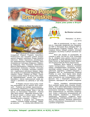 Jedyne pismo polskie w Brazylii Słowo rektora na Boże Narodzenie Bp Wiesław Lechowicz Warszawa, 1.X. 2014 r. L.dz. 57/14 Najczcigodniejszym Księżom Biskupom, Czcigodnym Księżom Prałatom, Kanonikom, Proboszczom oraz wszystkim polskim duszpasterzom misyjnym i polonijnym, Drogim Siostrom zakonnym, Wielce Szanownym przedstawicielom dyplomatycznym Państwa Polskiego: Panu Ambasadorowi Andrzejowi Brajterowi z Małżonką Katarzyną, Panu Konsulowi Generalnemu Markowi Makowskiemu z Małżonką Anną wraz z Pracownikami Ambasady w Brasílii i Konsulatu Generalnego w Kurytybie, wszystkim wspólnotom i organizacjom polonijnym składam najlepsze życzenia na przeżywanie Świąt Bożego Narodzenia: Pokoju i Radości od PANA i macierzyńskiej czułości Maryi! W Nowym Roku Bożego błogosławieństwa, zdrowia oraz wszelkiej satysfakcji z dobrze wykonywanych zadań płynących z powołania czy pełnionej w tym kraju misji! W Wigilijny wieczór naszą myślą i modlitwą przeniesiemy się do naszych stron rodzinnych… Poddamy się nostalgii, wspomnieniom… Z pewnością zaśpiewamy w upale brazylijskiego lata nie jedną polską kolędę. Wielu z nas zaśpiewa za Franciszkiem Karpińskim: „Podnieś rękę, Boże Dziecię, - Błogosław ojczyznę miłą, W dobrych radach, w dobrym bycie, - Wspieraj jej siłę swą siłą, - Dom nasz i majętność całą – I wszystkie wioski z miastami. – A Słowo …” Proszę o przyjęcie daru świątecznej modlitwy i wyrazów mojego szczerego, wielkiego szacunku - ks. Zdzisław MALCZEWSKI SChr Miło mi poinformować, że dnia 1 września br. rozpoczęło działalność przy Sekretariacie KEP w Warszawie Biuro Delegata KEP ds. Duszpasterstwa Emigracji Polskiej. Wraz z tą inicjatywa Biskup Delegat podejmie obowiązki wynikające z tej funkcji w pełnym wymiarze czasowym. Biuro jest otwarte od poniedziałku do czwartku w godz. Od 9:00 do 14:00. Przewiduje się, że zbiegiem czasu godziny otwarcia zostaną wydłużone. Funkcję sekretarza Biura pełni s. Edyta Rychel ze Zgromadzenia Sióstr Misjonarek Chrystusa Króla dla Polonii Zagranicznej. Zadaniem Biura będzie w pierwszym rzędzie koordynowanie i ułatwianie kontaktów miedzy przedstawicielami środowiska duszpasterskiego polskiej emigracji (kapłanów, sióstr zakonnych, świeckich) i polskimi biskupami, z Delegatem KEP ds. Duszpasterstwa Emigracji Polskiej na czele. Biuro będzie także służyło nawiązywaniu kontaktów z biskupami krajów, gdzie prowadzone jest duszpasterstwo polskojęzyczne oraz z instytucjami państwowymi i świeckimi, zajmującymi się polskimi emigrantami. Oprócz charakteru administracyjnego Biuro posiadać będzie także charakter duszpasterski – temu celowi będą służyły organizowane przez Biuro spotkania duszpasterzy polonijnych, promowanie materiałów i inicjatyw duszpasterskich dostosowanych do warunków emigracyjnych, troska o dziedzictwo duszpasterstwa polskiej emigracji, współpraca z instytucjami i wspólnotami kościelnymi mogącymi służyć duszpasterstwu polskojęzycznemu poza granicami naszej Ojczyzny, tworzenie płaszczyzny wymiany doświadczeń duszpasterskich w pracy z polskimi emigrantami. __________________________________________________ Kurytyba, listopad - grudzień 2014, nr 6(32), 6/2014 Biuro poprzez swoją działalność uwrażliwiać będzie na sytuację polskich emigrantów ze strony wspólnoty Kościoła w Polsce oraz animować formy pomocy rodzinom rozdzielonym z powodu wyjazdów emigracyjnych. Biuro posiadać będzie ponadto charakter informacyjny – na stronie internetowej będzie można znaleźć miedzy innymi wiadomości z duszpasterskiej posługi Biskupa Delegata, z życia poszczególnych misji i ośrodków duszpasterstwa Polonii i Polaków za granicą oraz niezbędne dane związane z duszpasterstwem polskojęzycznym i statusem emigranta polskiego. Strona internetowa Biura służyć też będzie przekazywaniu intencji modlitewnych. Aby te cele mogły się zrealizować dla dobra naszych Rodaków żyjących z dala od Ojczyzny i niejednokrotnie najbliższych proszę o wsparcie poprzez życzliwość, współpracę i modlitwę. Bp Wiesław Lechowicz Delegat KEP ds. Duszpasterstwa Emigracji Polskiej Kolejny polski misjonarz biskupem w Brazylii Po raz pierwszy - w mojej brazylijskiej historii 35 już lat - znalazłem się w północnowschodnim regionie tego kraju, a konkretnie w stanie Pernambuco. To „zaledwie” pięć godzin lotu z Kurytyby do Recife. Przyleciałem tutaj mając bilet lotniczy „za darmo”. Po prostu zbieram punkty brazylijskich linii lotniczych „Tam”. Poleciałem do Recife, aby 18 października br. uczestniczyć w święceniach biskupich polskiego misjonarza ks. Jana Kota, orionisty! Święcenia miały miejsce w Vitória de Santo Antão ponad 50 km od miasta Recife. By móc tam dotrzeć wynająłem wcześniej przez internet samochód. Po przylocie do Recife zabrałem samochód i przejechałem trochę miasto, aby go poznać przynajmniej powierzchownie. Praktycznie są to dwa miasta położone obok siebie: Olinda i Recife. W Recife chociaż jest cieplej niż w Kurytybie to, jak na pierwsze spotkanie z tym klimatem nie jest zbyt dokuczliwe to gorąco północno-wschodniej Brazylii. Po południu słońce było już słabsze i wiatr dawał o sobie znać. Już po godz. 16 zaczynało się powoli ściemniać. W północnej i północno-wschodniej Brazylii nie ma zmiany czasu, jak to mamy na południu tego kraju. Właśnie minionej niedzieli w Kurytybie ludzie musieli wstać o godzinę wcześniej. Z Recife wyjechałem 4 godziny przed wyznaczonym czasem święceń. To było opatrznościowe, bo ruch samochodowy na dwóch drogach federalnych, jakimi jechałem, był bardzo duży. W ponad stutysięcznym mieście Vitória do Santo Antão, polski misjonarz ks. Jan Kot, oblat przyjął święcenia biskupie poprzez posługę arcybiskupa Pedro Brito Guimarães – ordynariusza metropolity Palmas (stan Tocantins). Współkonsekr